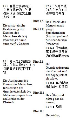 在哲学上对《修辞术》的阐发最为深刻的当属海德格尔。1924年夏季,他在马堡开设了《亚里士多德哲学基本概念》(Grundbegriffe der Aristotelischen Philosophie,以下简称《概念》)讲座。其讲稿2002年才整理刊行,后来出版者计划的题目一度定为《亚里士多德:修辞术》。这个书名并不算误起,因为有近五分之一的篇幅(仅计算学生整理的讲稿部分)讨论了《修辞术》这部也许在一些人看来毫无哲学的作品。而且在较为关键的I.3章,修辞术成为了核心概念之一。海德格尔以独到的眼光发现了其中符合自己哲学意图的内容,他并不认为这是亚里士多德的边缘作品。很晚才面世的《概念》解释了为什么1927年出版的《存在与时间》特别强调了《修辞术》一书的意义,“我们必须把亚里士多德的《修辞术》看作第一部对日常共在的系统诠释”,而不是理解为“教科书”上的东西。尽管海德格尔对该书有所误读,但他将这样一部古典著作成功转变为现代的哲学作品。虽然多少偏离了亚里士多德的本意,他却发扬了《修辞术》中对语言和情感的科学研究。《概念》中涉及《修辞术》的主要部分,可列表如下: