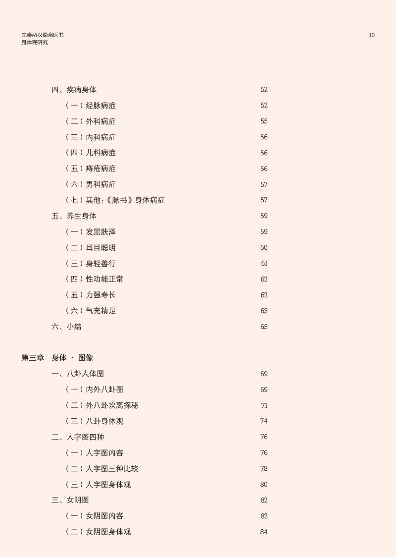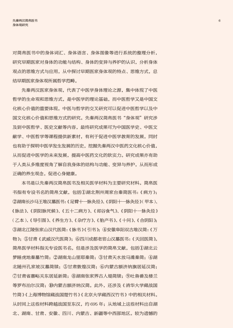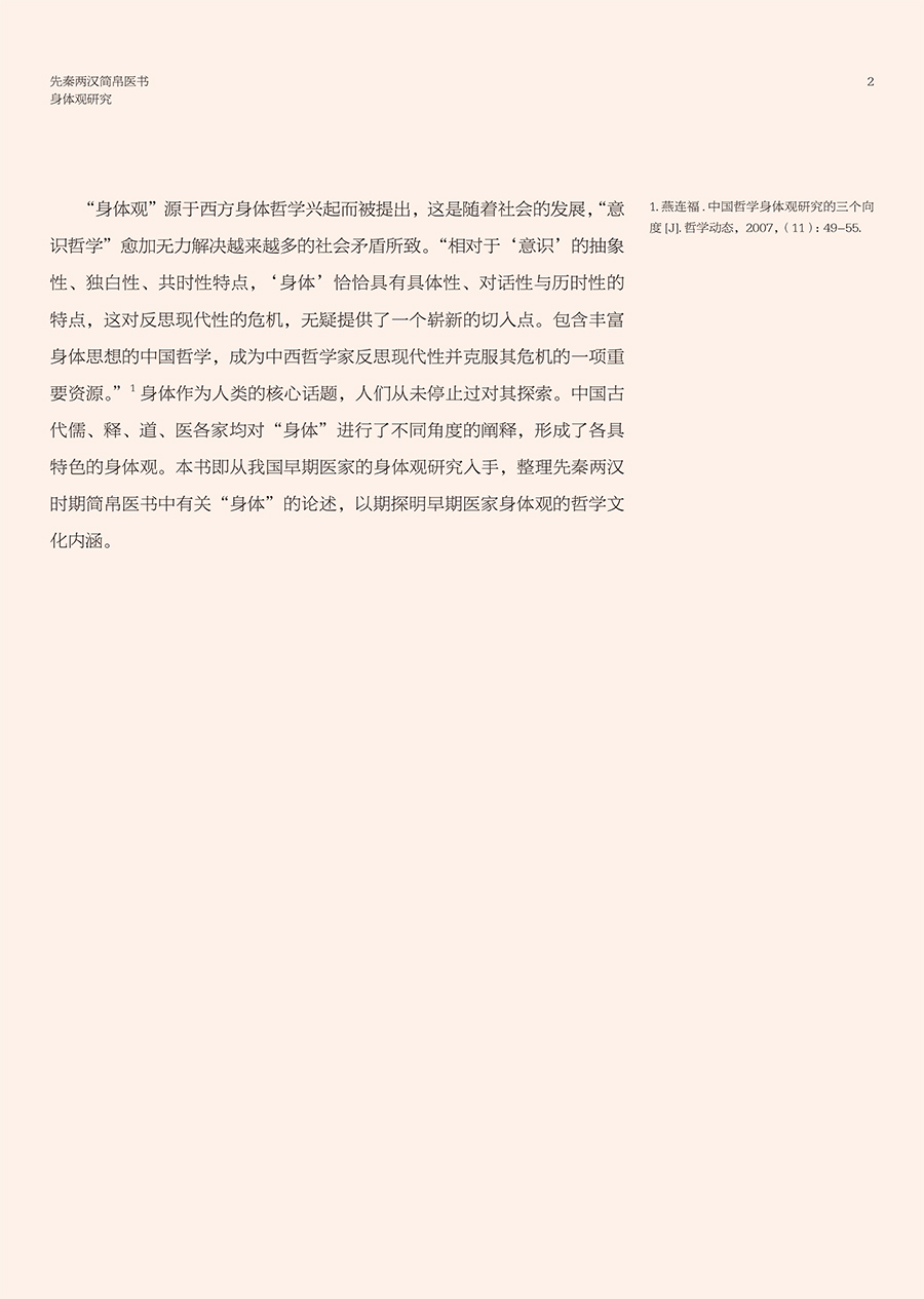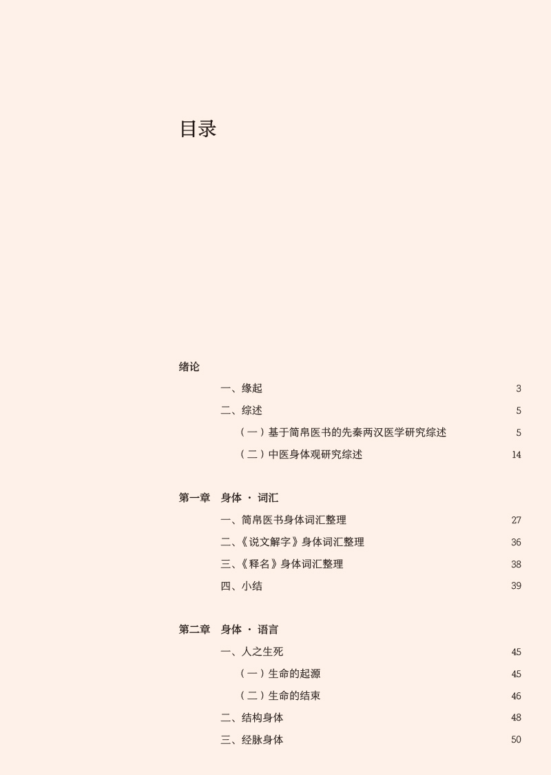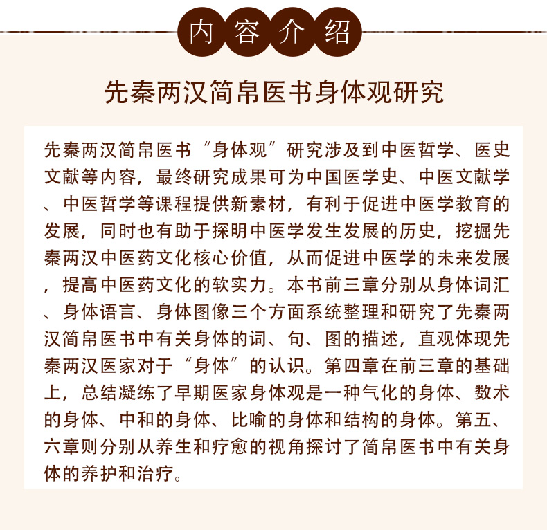 先秦两汉简帛医书“身体观”研究涉及到中医哲学、医史文献等内容,最终研究成果可为中国医学史、中医文献学、中医哲学等课程提供新素材,有利于促进中医学教育的发展,同时也有助于探明中医学发生发展的历史,挖掘先秦两汉中医药文化核心价值,从而促进中医学的未来发展,提高中医药文化的软实力。本书前三章分别从身体词汇、身体语言、身体图像三个方面系统整理和研究了先秦两汉简帛医书中有关身体的词、句、图的描述,直观体现先秦两汉医家对于“身体”的认识。第四章在前三章的基础上,总结凝练了早期医家身体观是一种气化的身体、数术的身体、中和的身体、比喻的身体和结构的身体。第五、六章则分别从养生和疗愈的视角探讨了简帛医书中有关身体的养护和治疗。