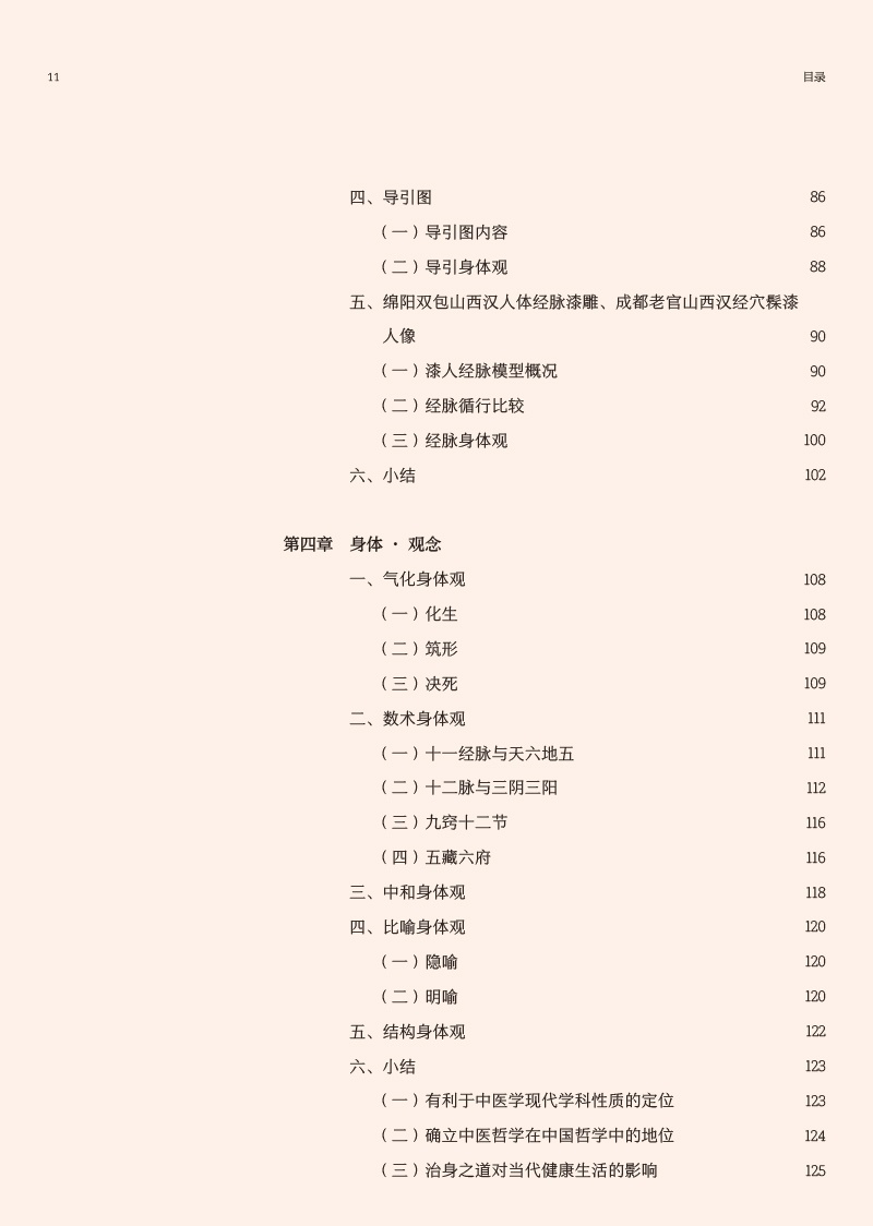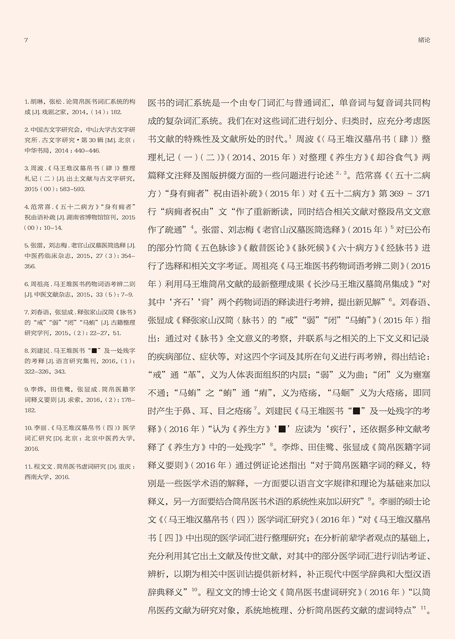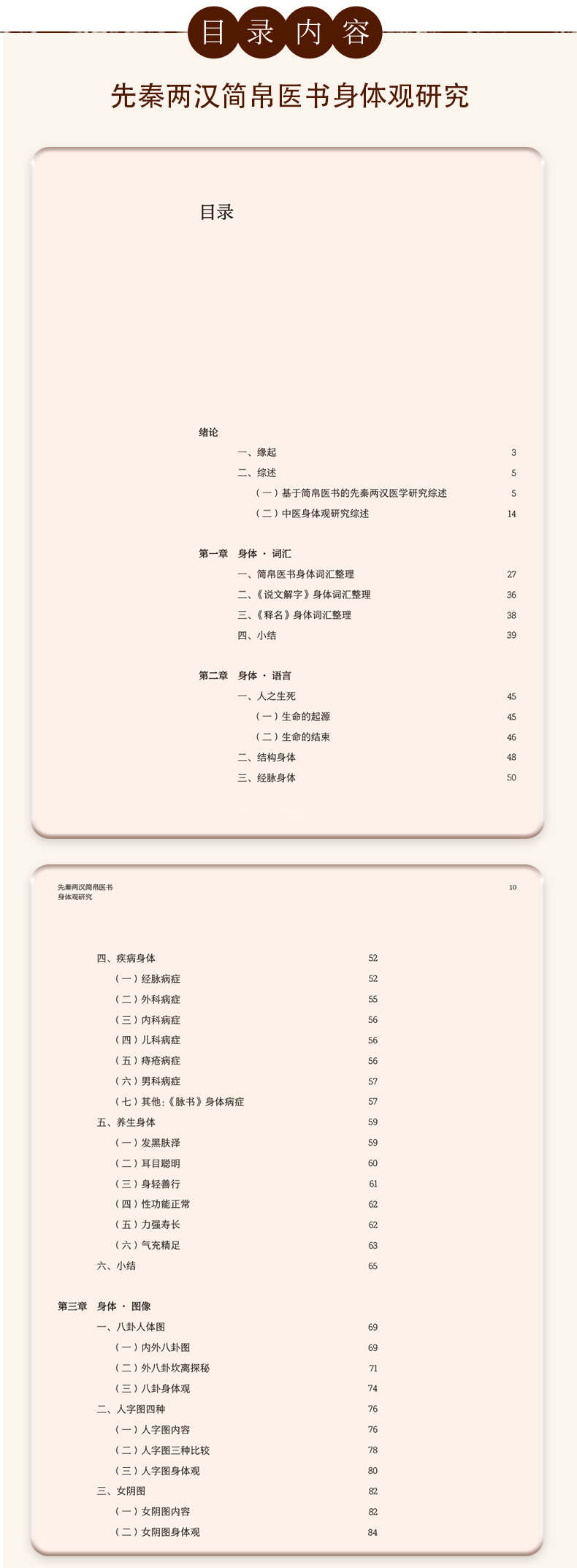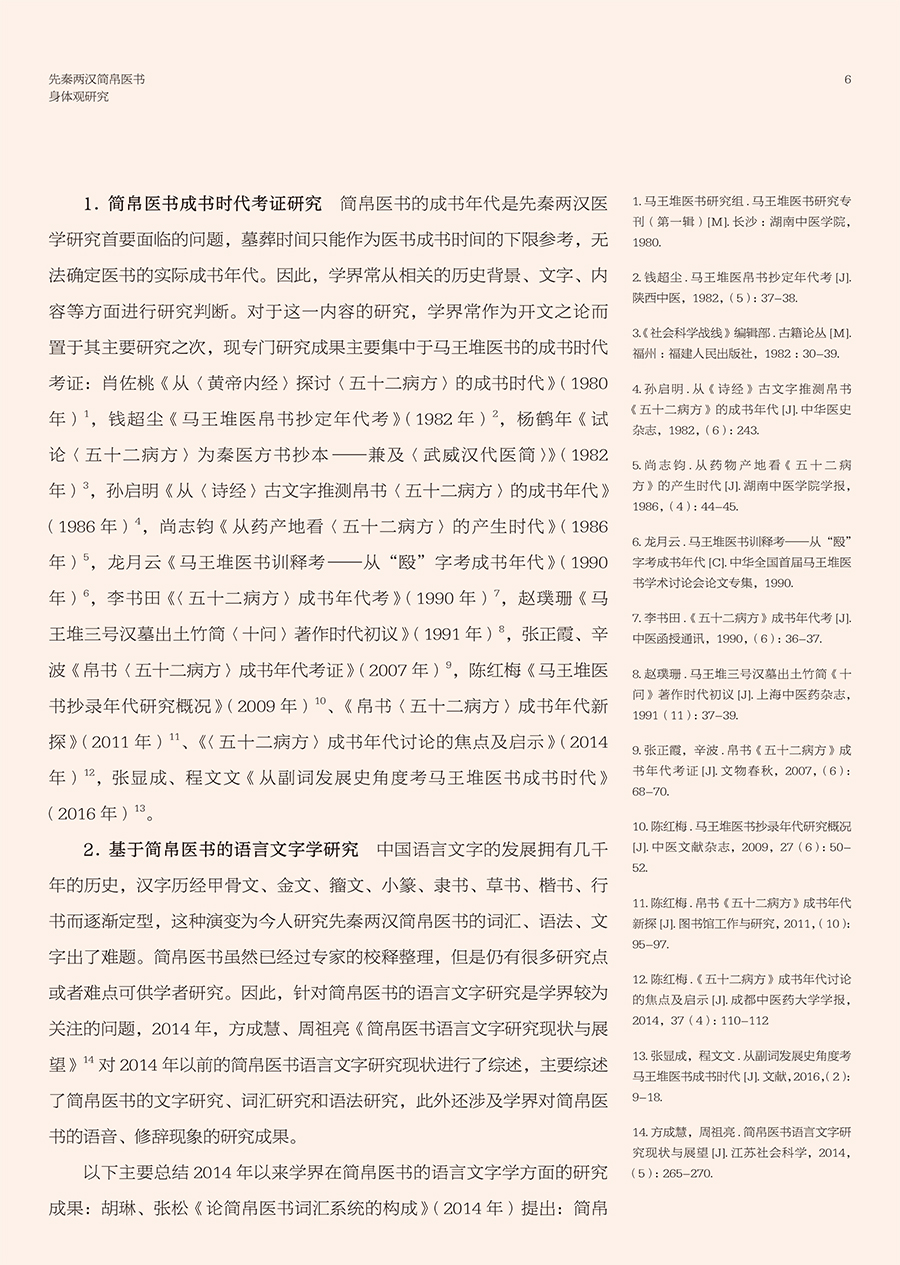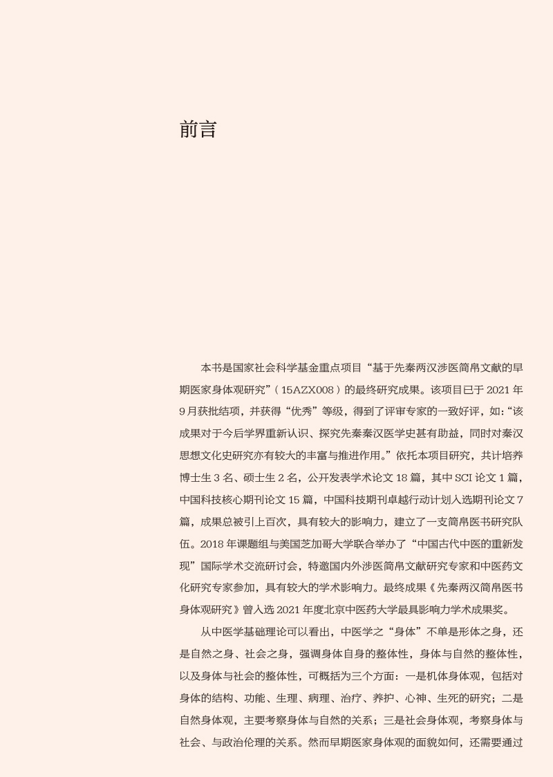先秦两汉简帛医书“身体观”研究涉及到中医哲学、医史文献等内容,最终研究成果可为中国医学史、中医文献学、中医哲学等课程提供新素材,有利于促进中医学教育的发展,同时也有助于探明中医学发生发展的历史,挖掘先秦两汉中医药文化核心价值,从而促进中医学的未来发展,提高中医药文化的软实力。本书前三章分别从身体词汇、身体语言、身体图像三个方面系统整理和研究了先秦两汉简帛医书中有关身体的词、句、图的描述,直观体现先秦两汉医家对于“身体”的认识。第四章在前三章的基础上,总结凝练了早期医家身体观是一种气化的身体、数术的身体、中和的身体、比喻的身体和结构的身体。第五、六章则分别从养生和疗愈的视角探讨了简帛医书中有关身体的养护和治疗。