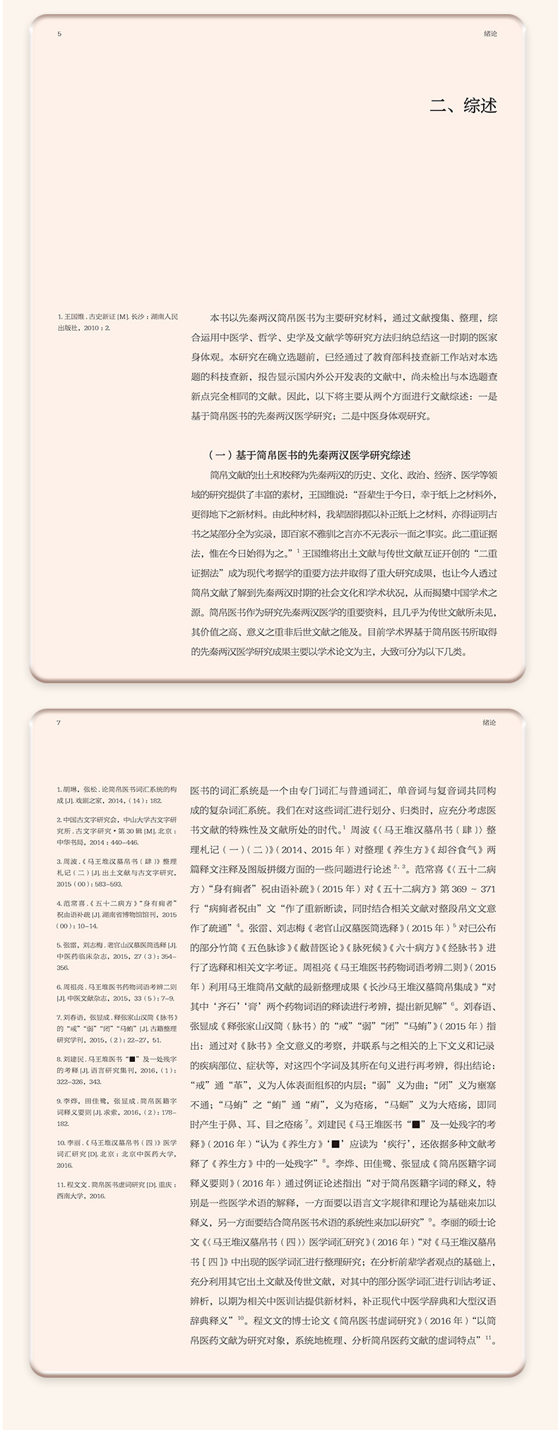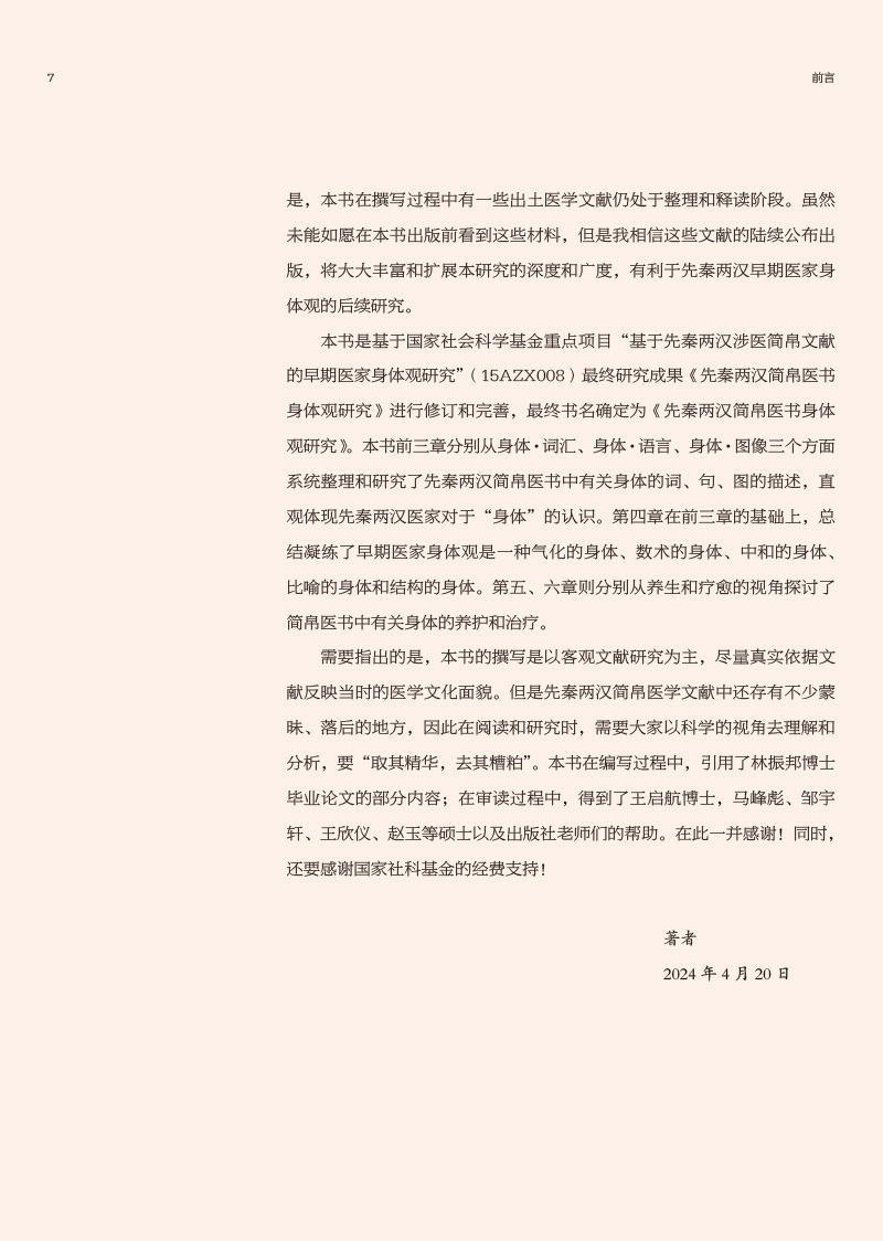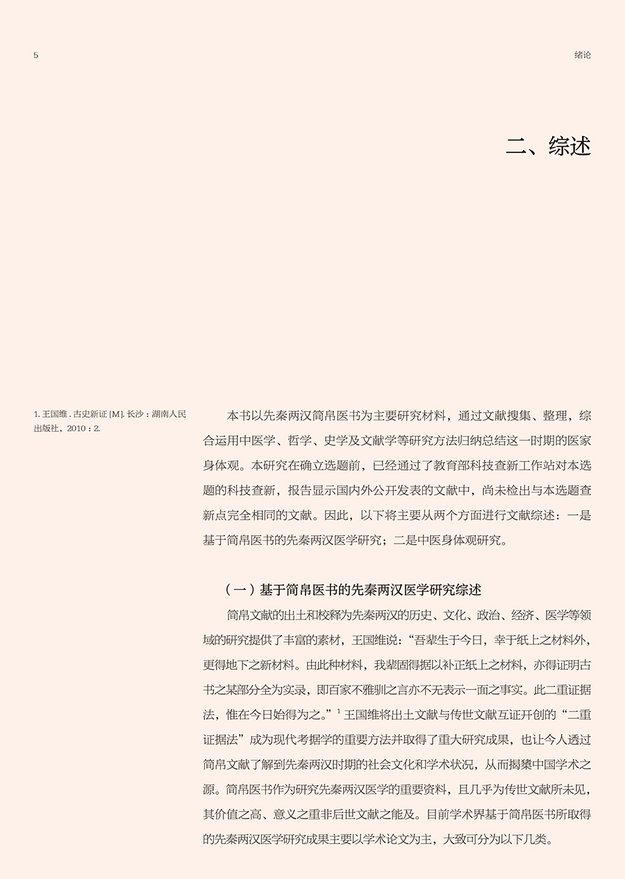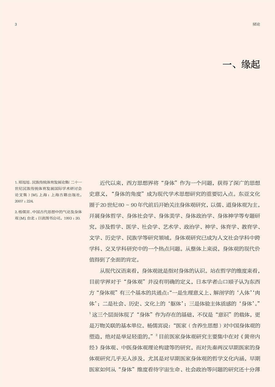 先秦两汉简帛医书“身体观”研究涉及到中医哲学、医史文献等内容,最终研究成果可为中国医学史、中医文献学、中医哲学等课程提供新素材,有利于促进中医学教育的发展,同时也有助于探明中医学发生发展的历史,挖掘先秦两汉中医药文化核心价值,从而促进中医学的未来发展,提高中医药文化的软实力。本书前三章分别从身体词汇、身体语言、身体图像三个方面系统整理和研究了先秦两汉简帛医书中有关身体的词、句、图的描述,直观体现先秦两汉医家对于“身体”的认识。第四章在前三章的基础上,总结凝练了早期医家身体观是一种气化的身体、数术的身体、中和的身体、比喻的身体和结构的身体。第五、六章则分别从养生和疗愈的视角探讨了简帛医书中有关身体的养护和治疗。