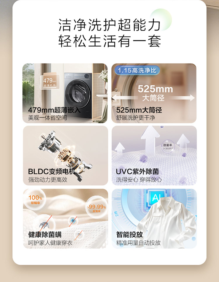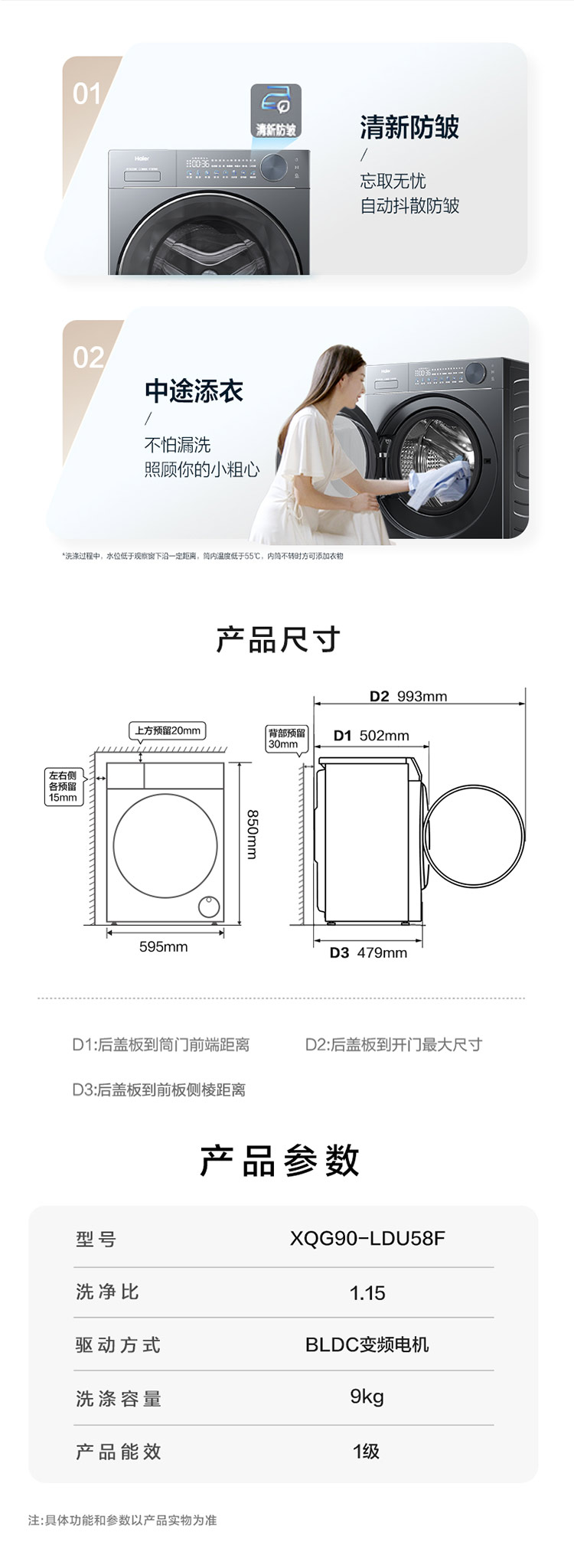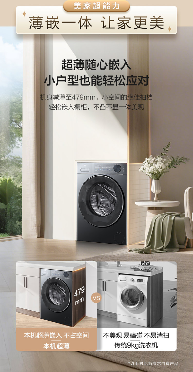 海尔9kg滚筒洗衣机 XQG90-LDU58F 超薄479mm嵌入智能投放紫外除菌