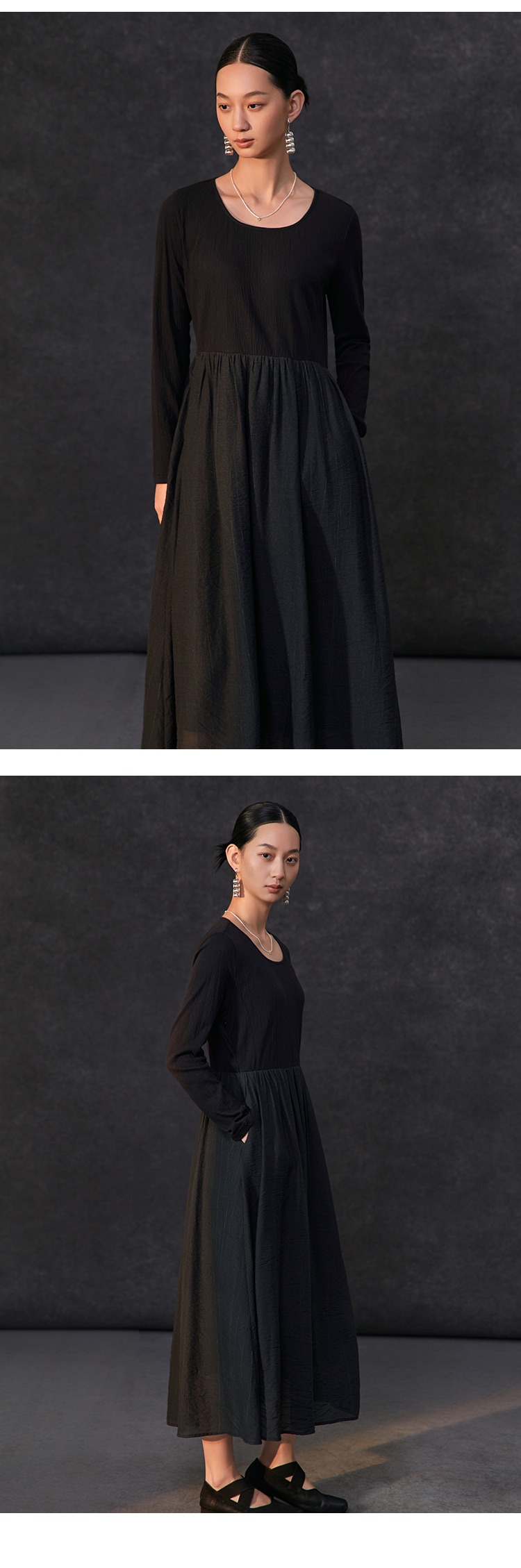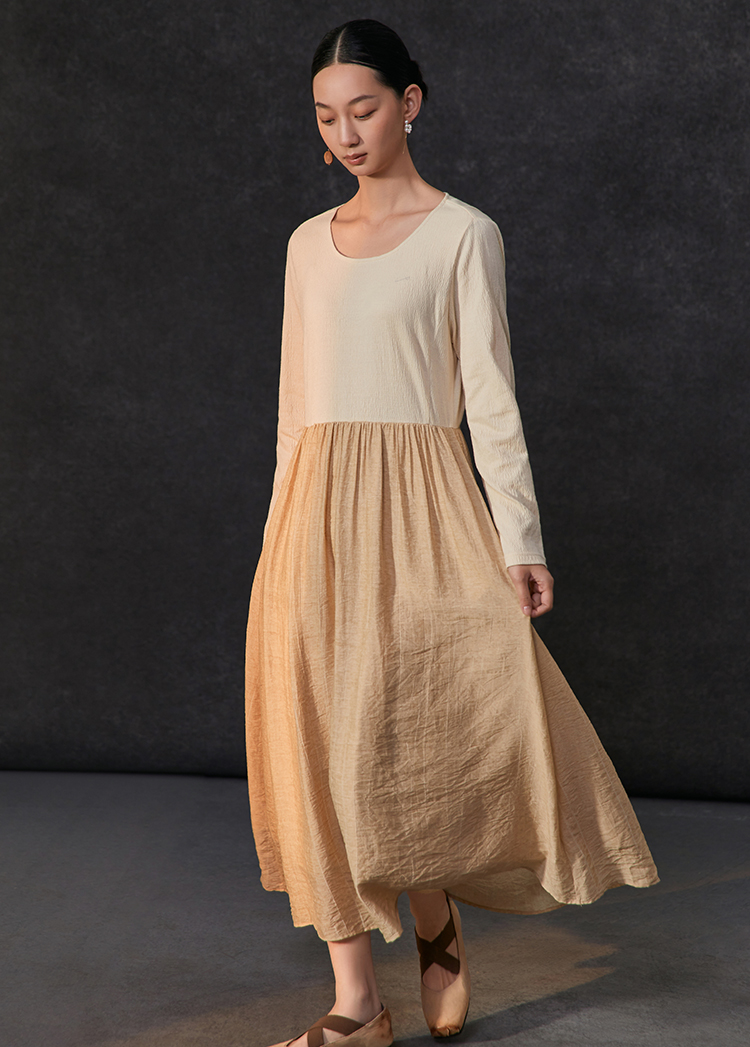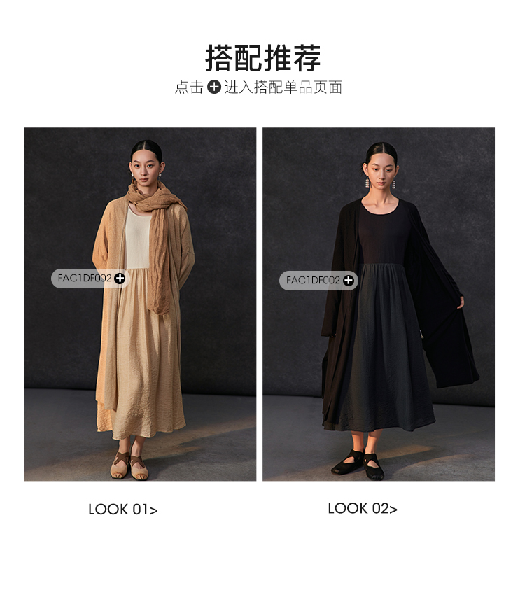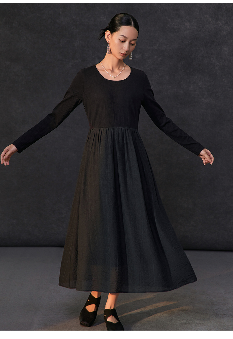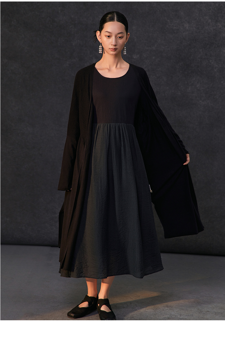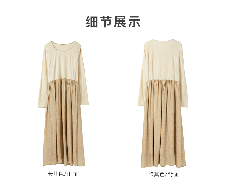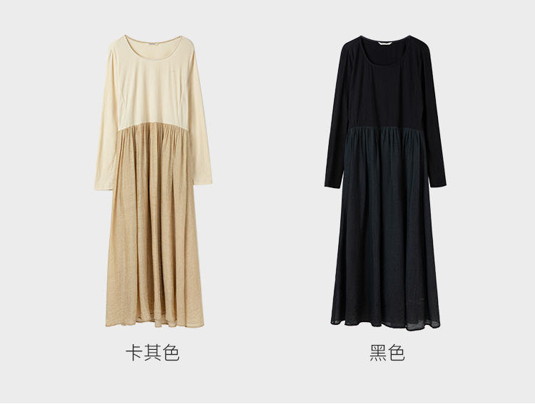 Famecoco假两件拼接极简连衣裙女士圆领气质过膝长裙FAC1FA010
