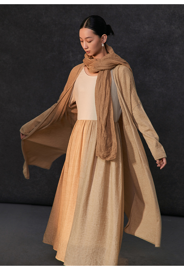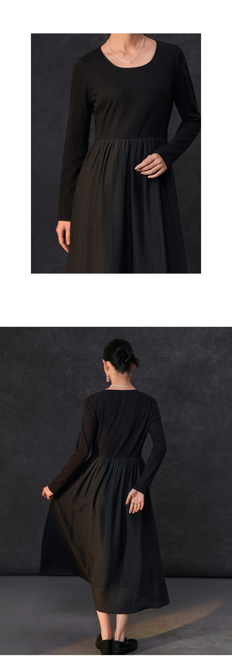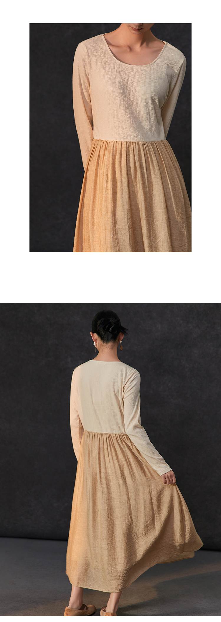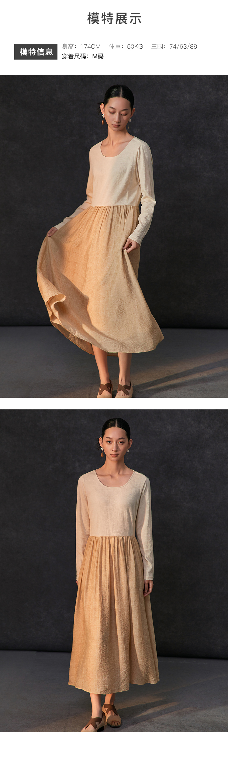 Famecoco假两件拼接极简连衣裙女士圆领气质过膝长裙FAC1FA010