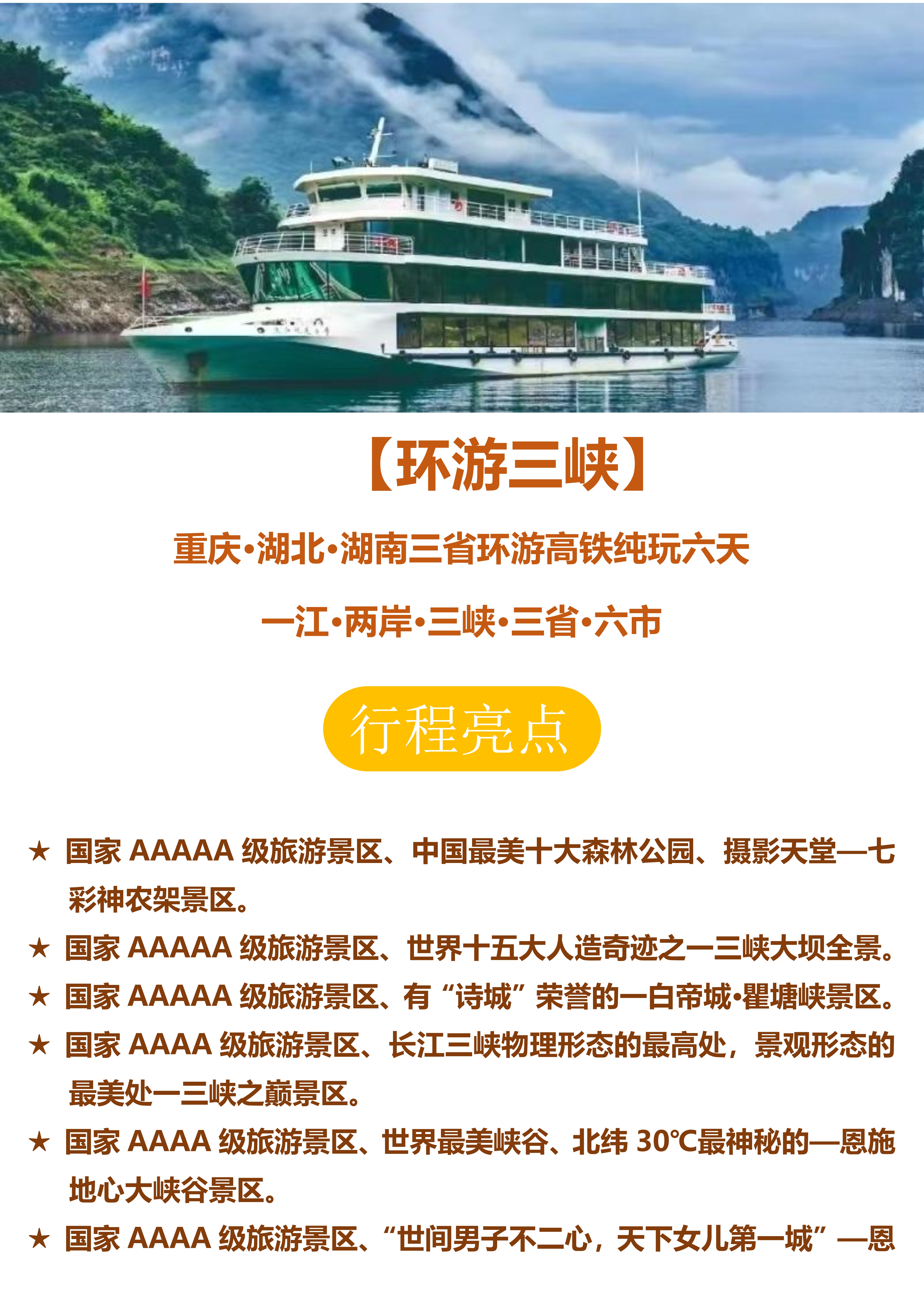 【环游三峡】重庆•湖北•湖南三省环游高铁纯玩六天