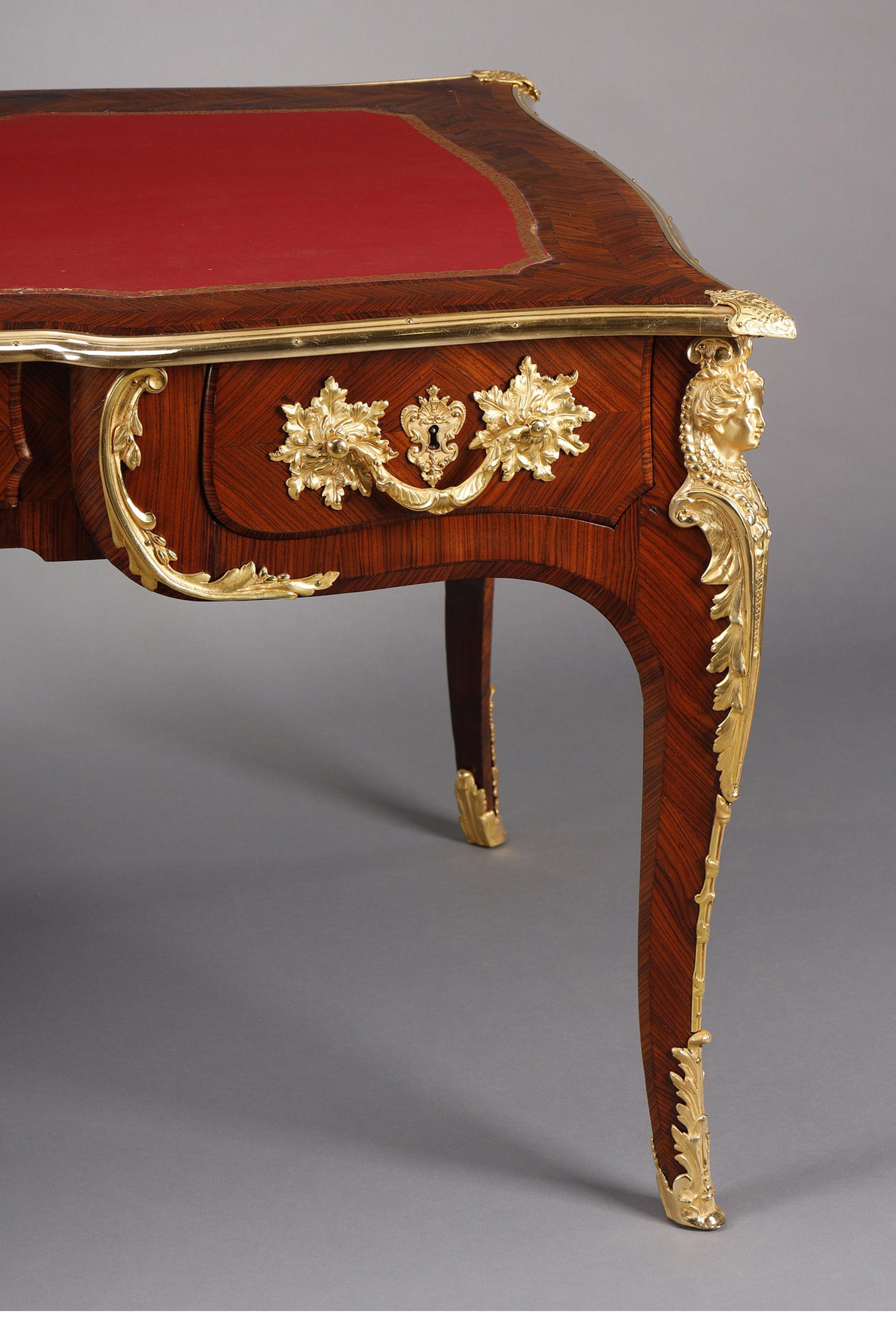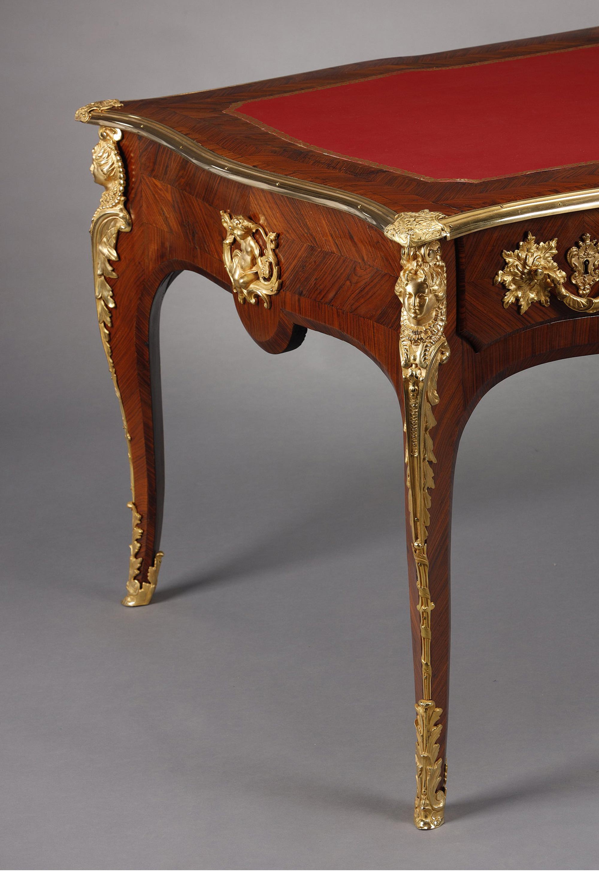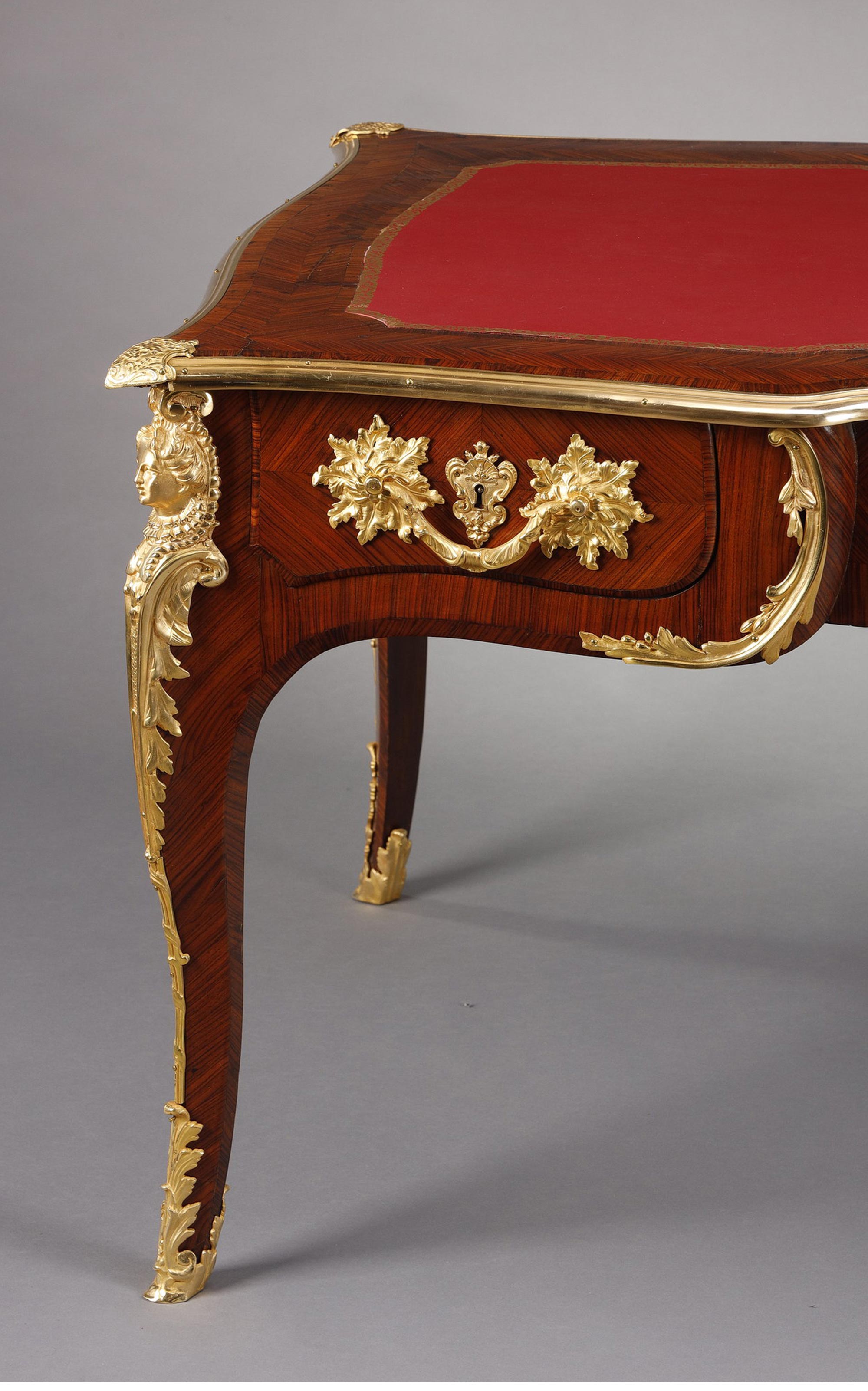 19世纪法国出品路易十五风格铜鎏金雕饰玫瑰木嵌皮革台面书桌