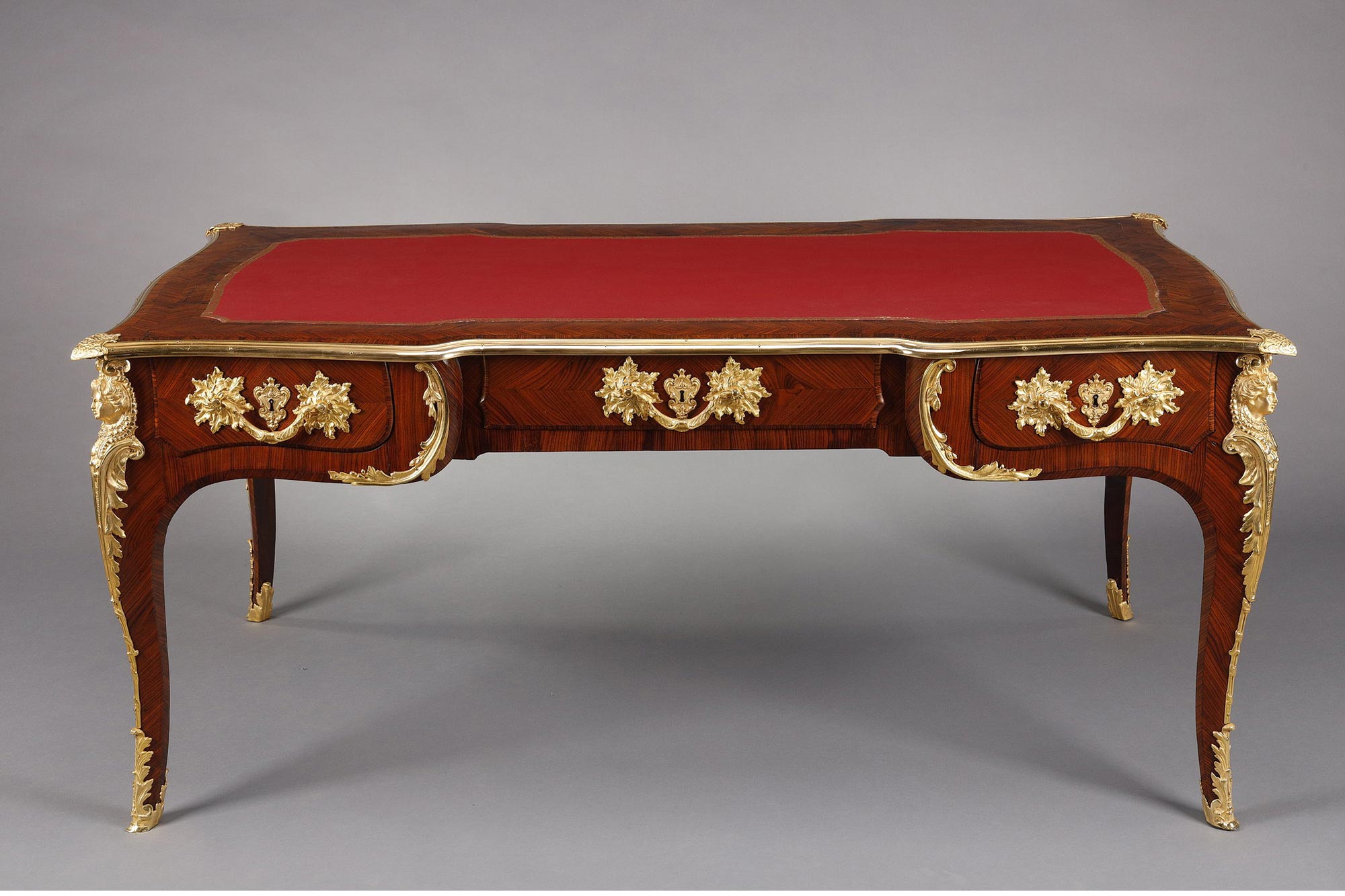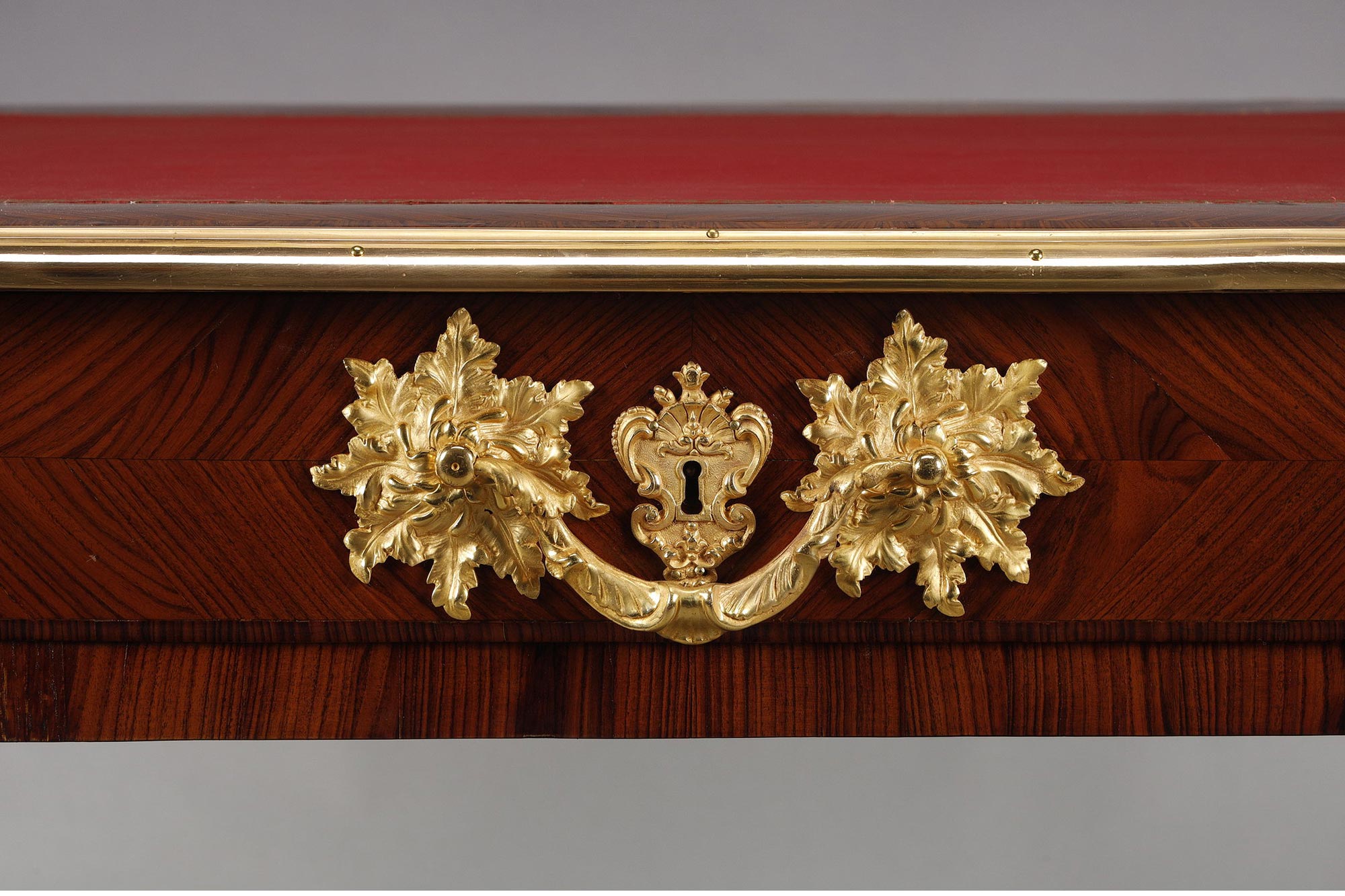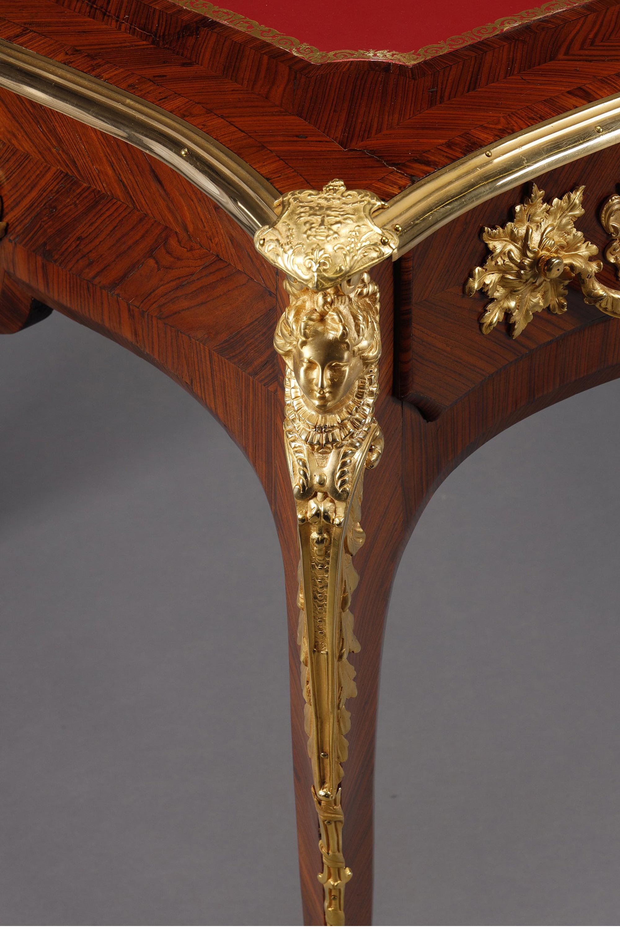 19世纪法国出品路易十五风格铜鎏金雕饰玫瑰木嵌皮革台面书桌