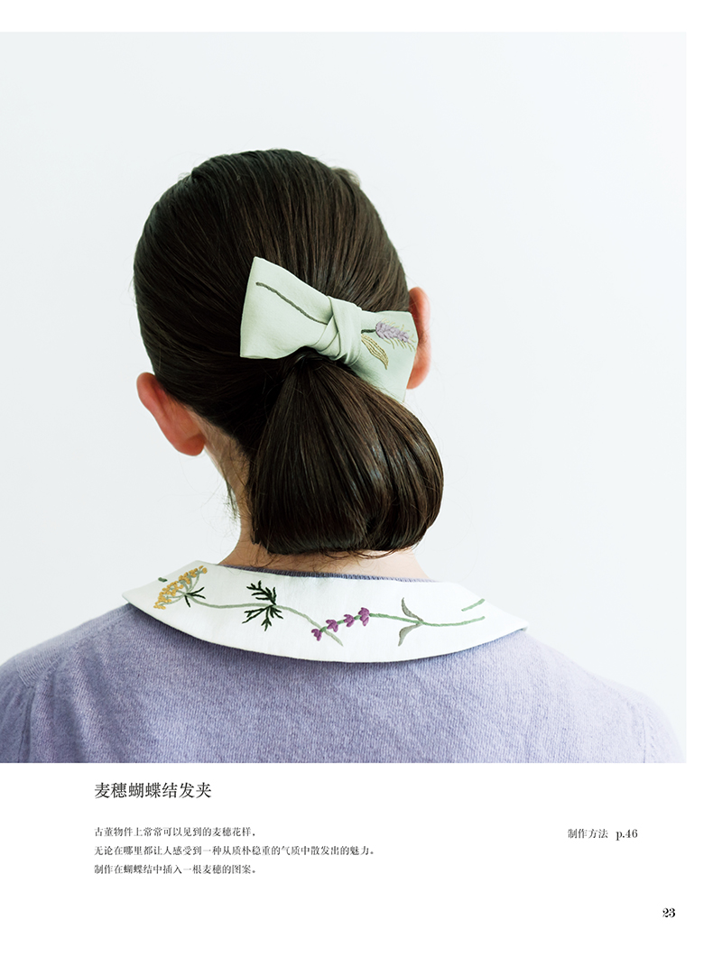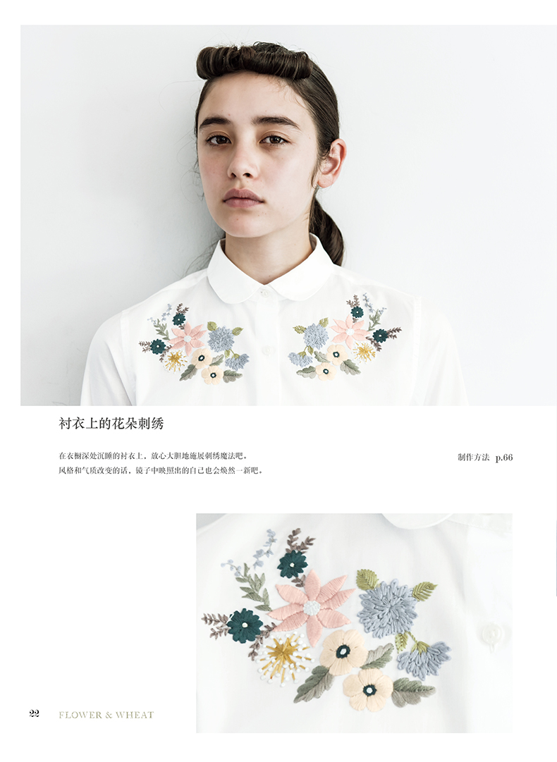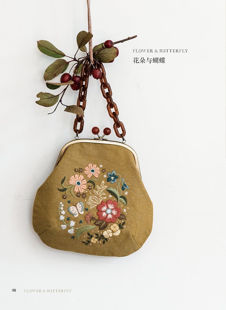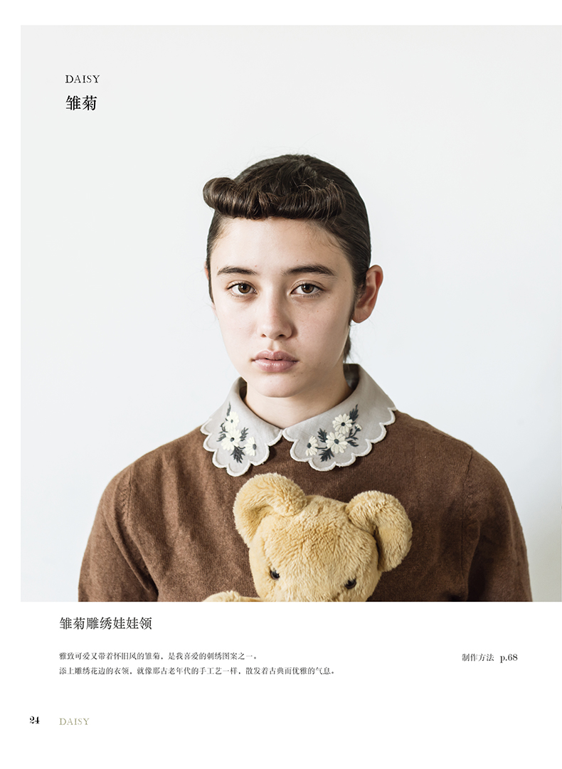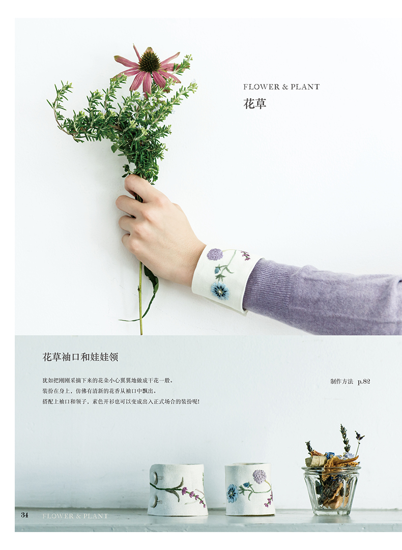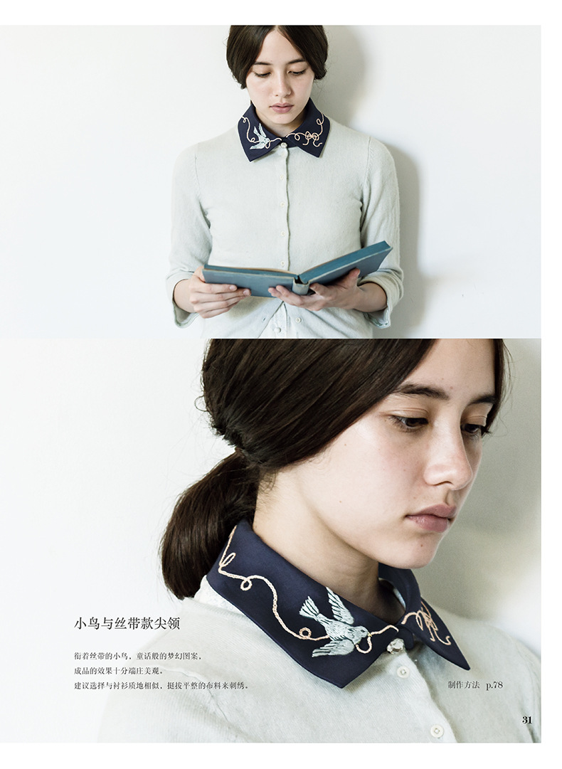 除了在衣领、包袋、胸针上将各类花朵作为中心进行刺绣,同时添加了鸟儿、蝴蝶及蝴蝶结、字母等等图案,还介绍了怎样在现有服装上点缀刺绣的构思。