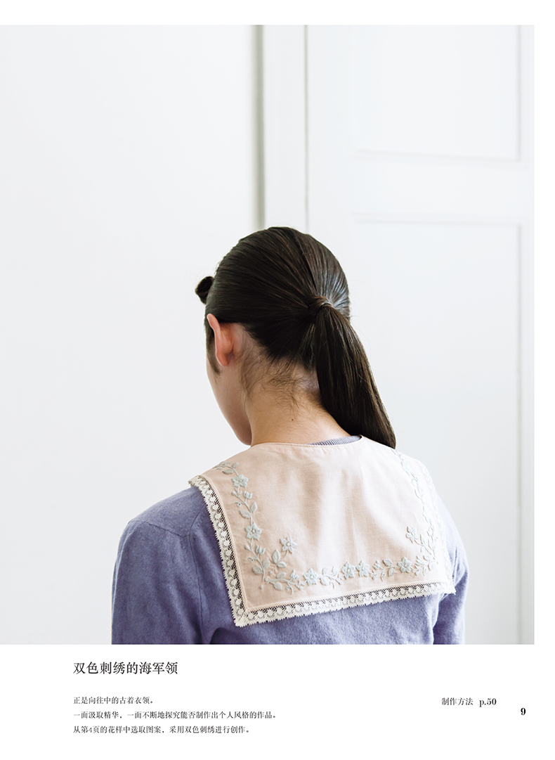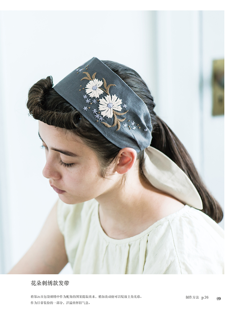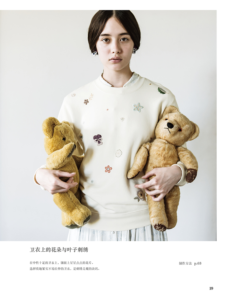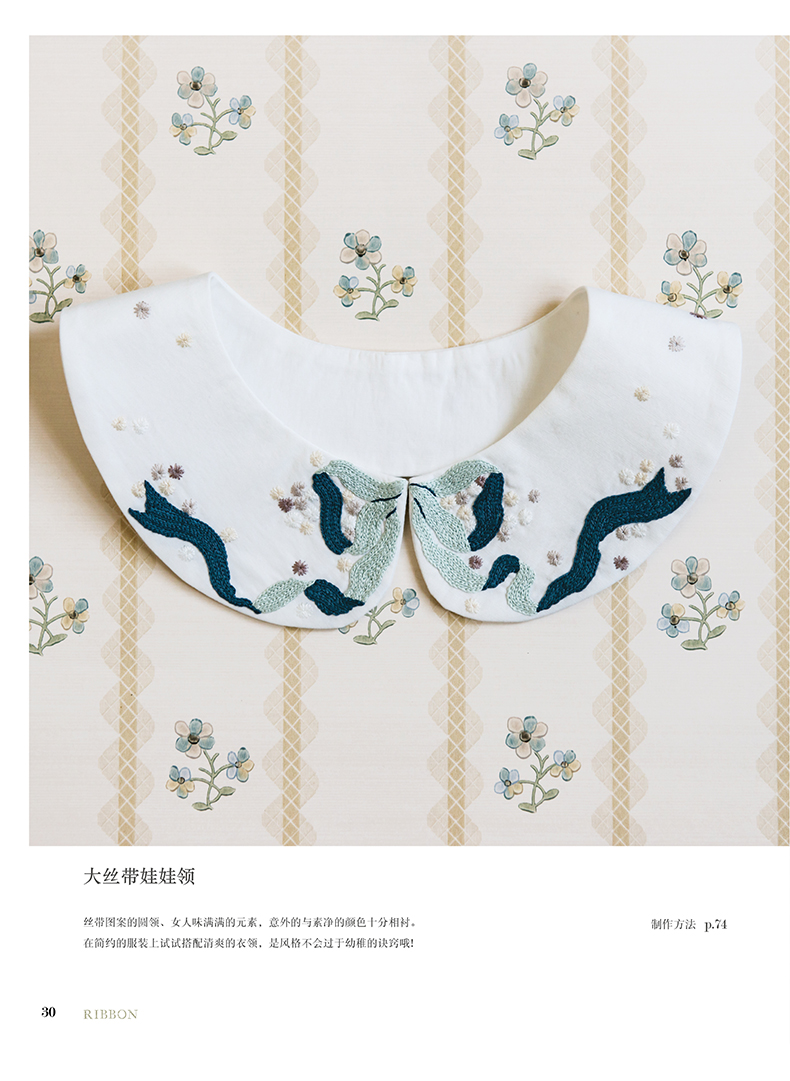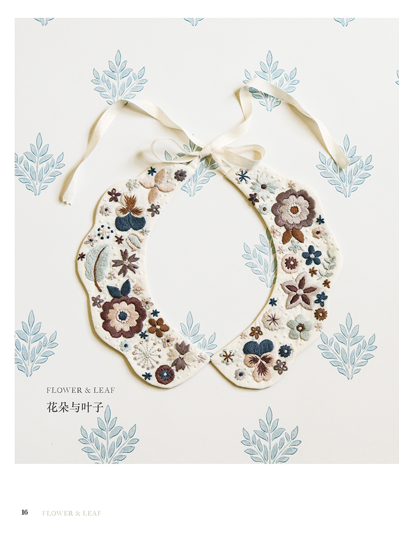除了在衣领、包袋、胸针上将各类花朵作为中心进行刺绣,同时添加了鸟儿、蝴蝶及蝴蝶结、字母等等图案,还介绍了怎样在现有服装上点缀刺绣的构思。