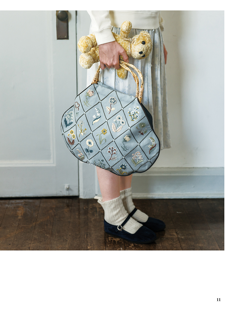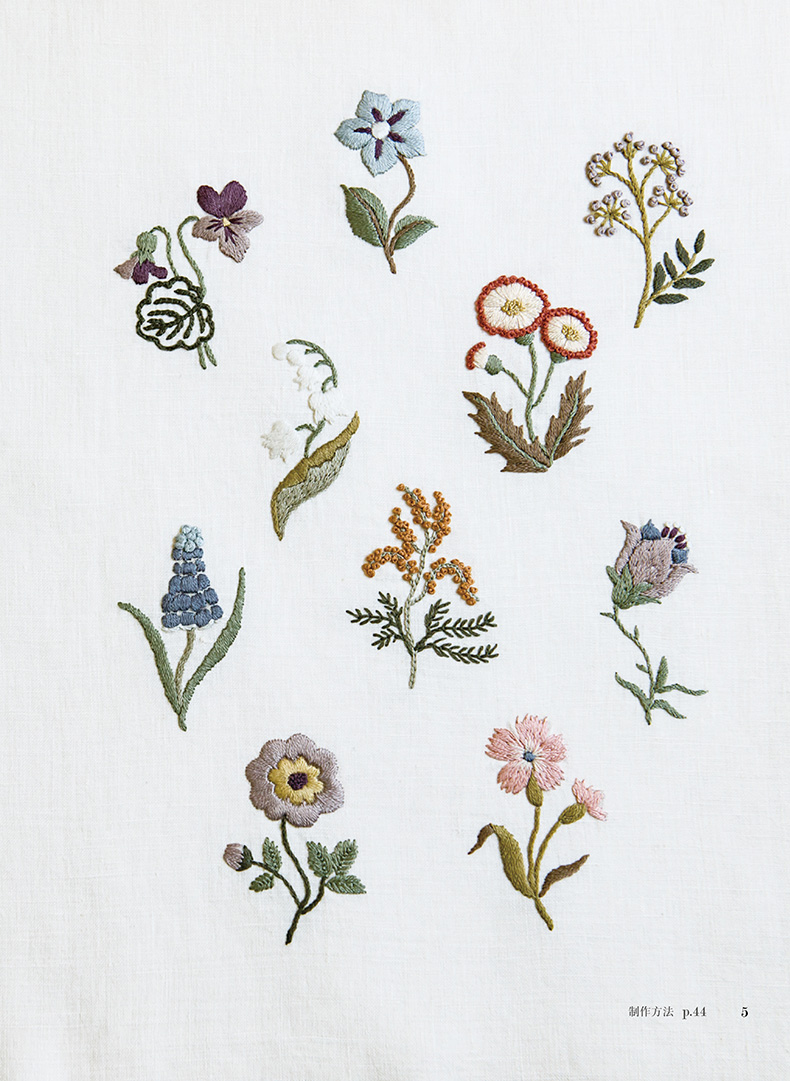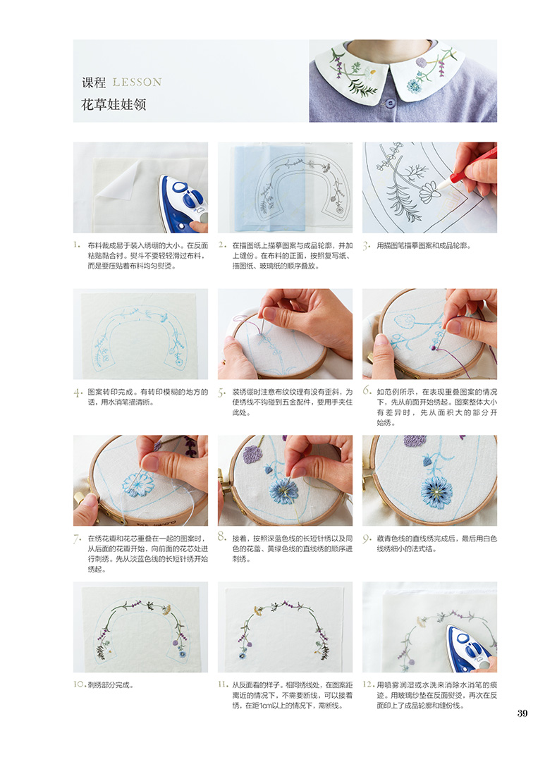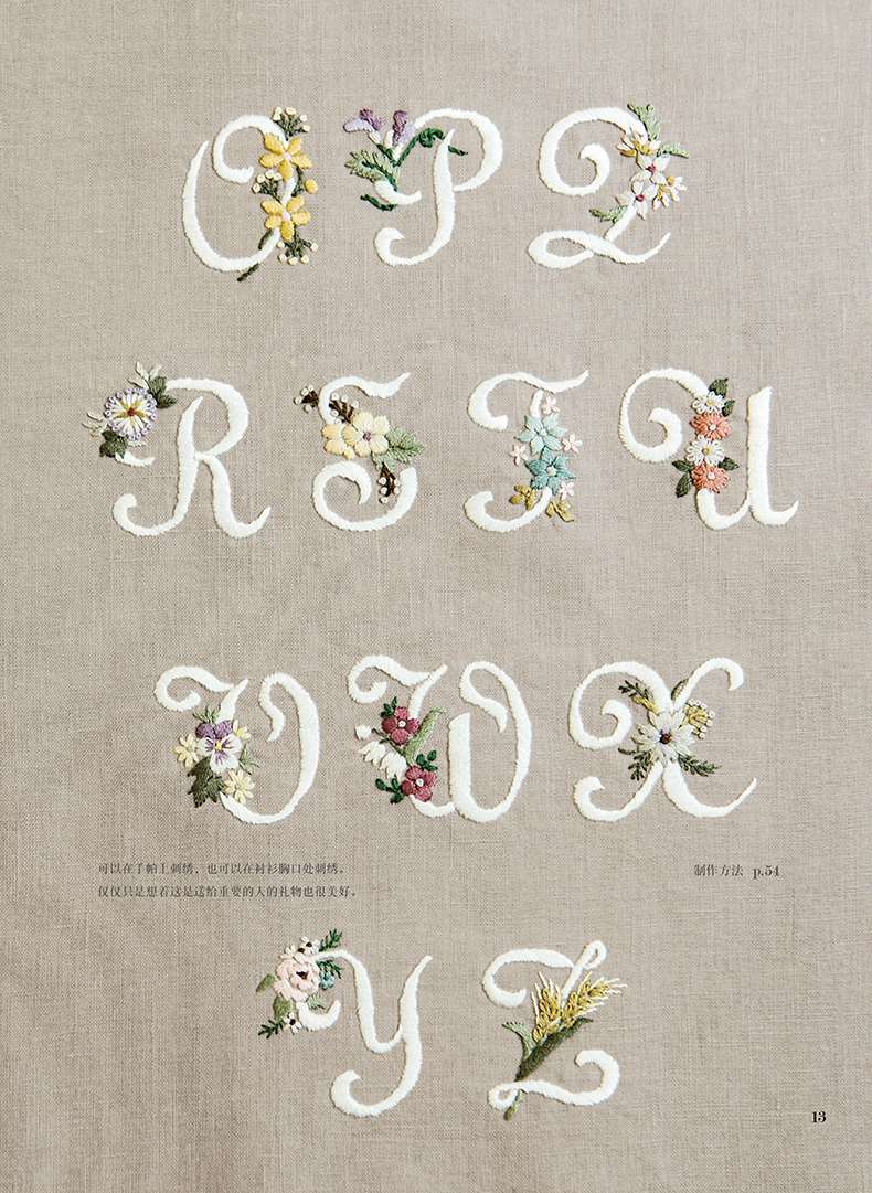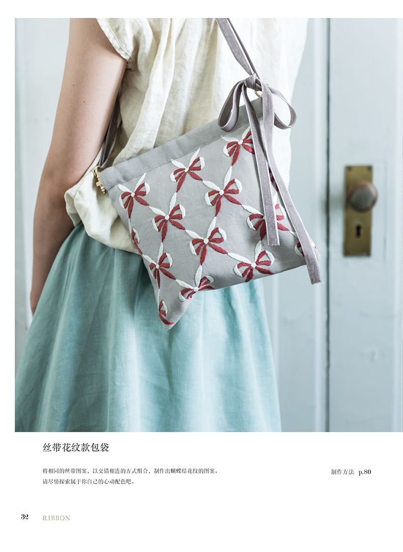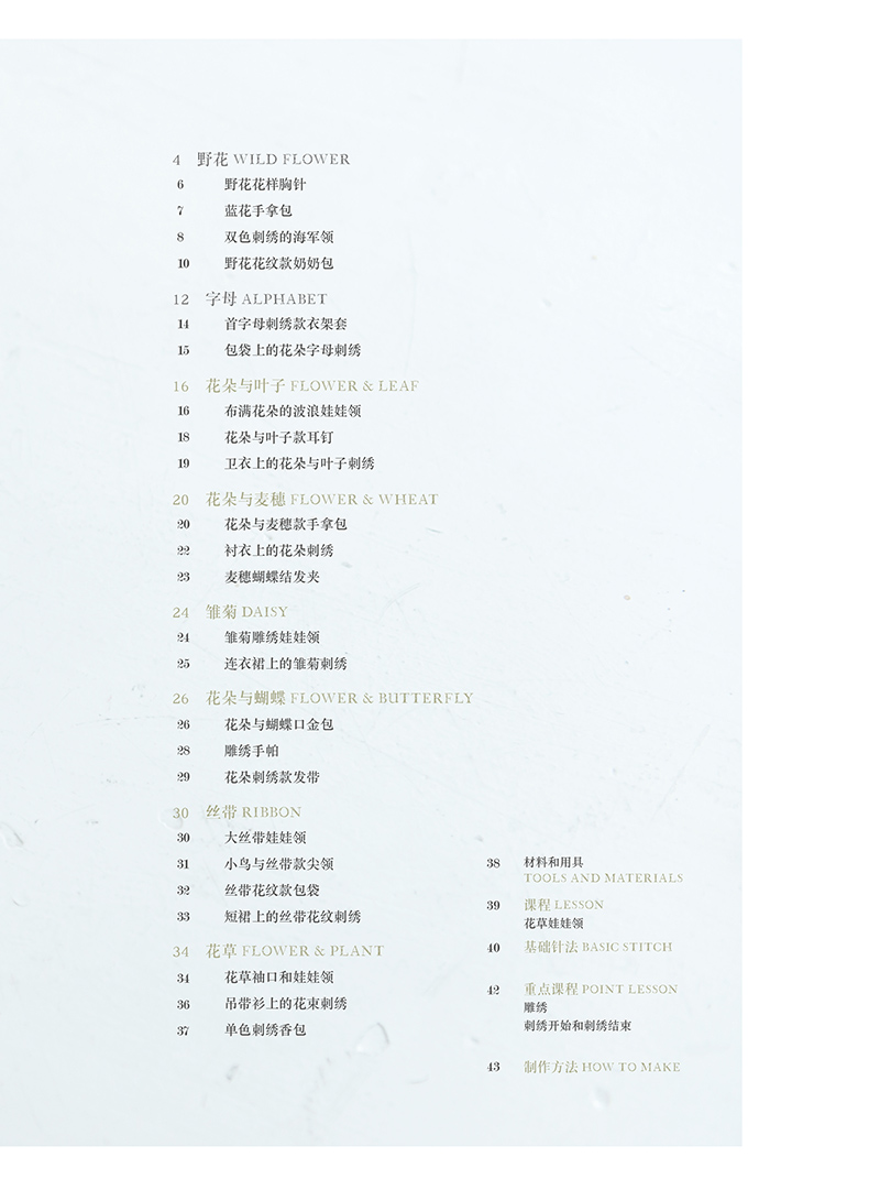 除了在衣领、包袋、胸针上将各类花朵作为中心进行刺绣,同时添加了鸟儿、蝴蝶及蝴蝶结、字母等等图案,还介绍了怎样在现有服装上点缀刺绣的构思。