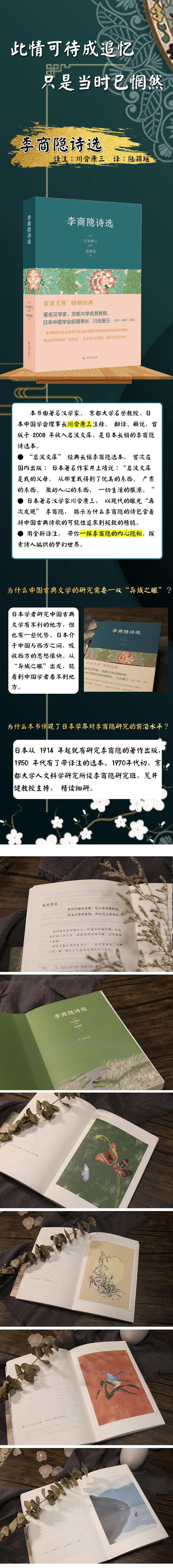 “身无彩凤双飞翼,心有灵犀一点通”,爱情穿越时空界限、跨越文化藩篱,成为人类永恒的情感主题。而李商隐的爱情诗,毫无疑问是东方文化视域中对这一主题最经典的表达。 《李商隐诗选》为日本著名汉学家川合康三对李商隐诗歌的选集,作者从自身研究兴趣与日本学界学术积累出发,精选李商隐诗歌近百首,并对每首诗进行注释、解说与翻译。注释精 准简要,解说独到深刻,翻译充满诗意,以细腻的情感表达准确地把捉到李商隐的朦胧诗意。打开本书,看大家学者如何以现代的眼光“再次发现”李商隐,如何通过诗人编织的梦幻 世界、探寻诗何以为诗。