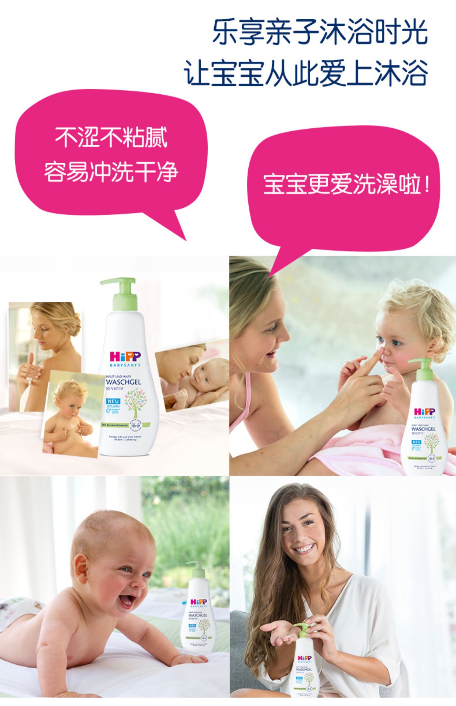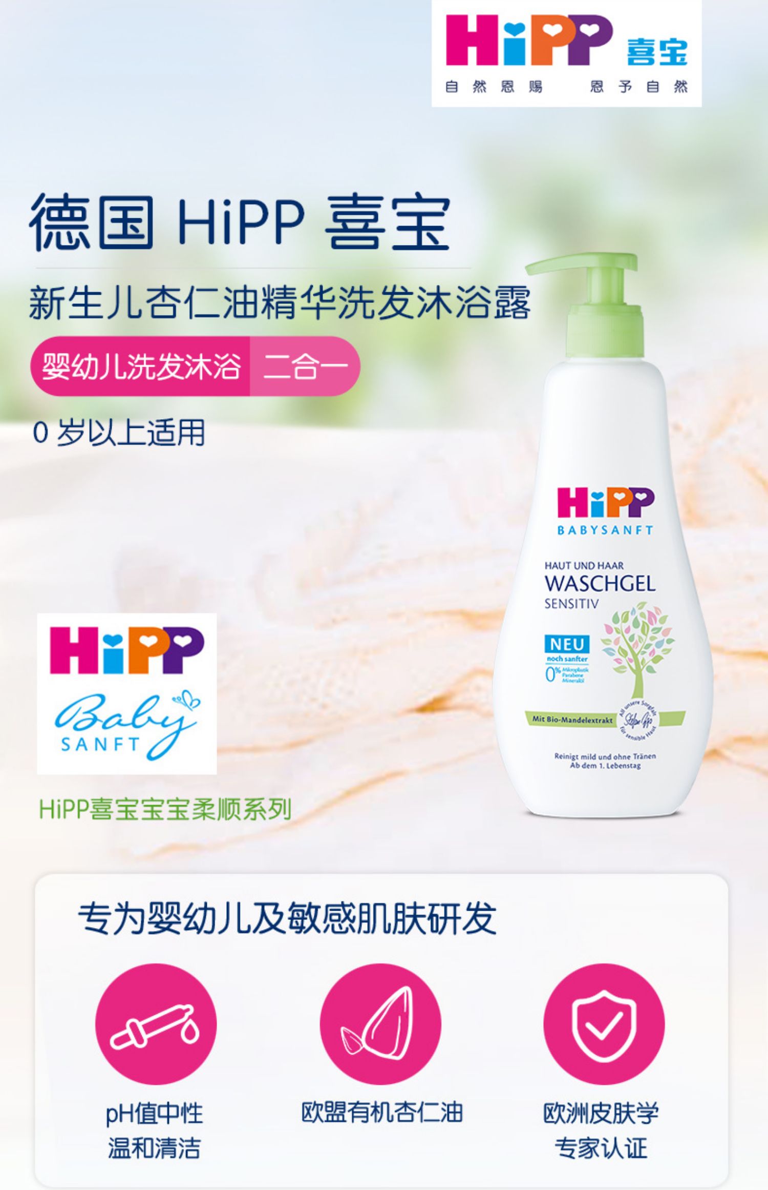 【保税】德国Hipp 喜宝杏仁洗护二合一400ml 沐浴+洗发二合一 PH5.5 弱酸性 原装进口