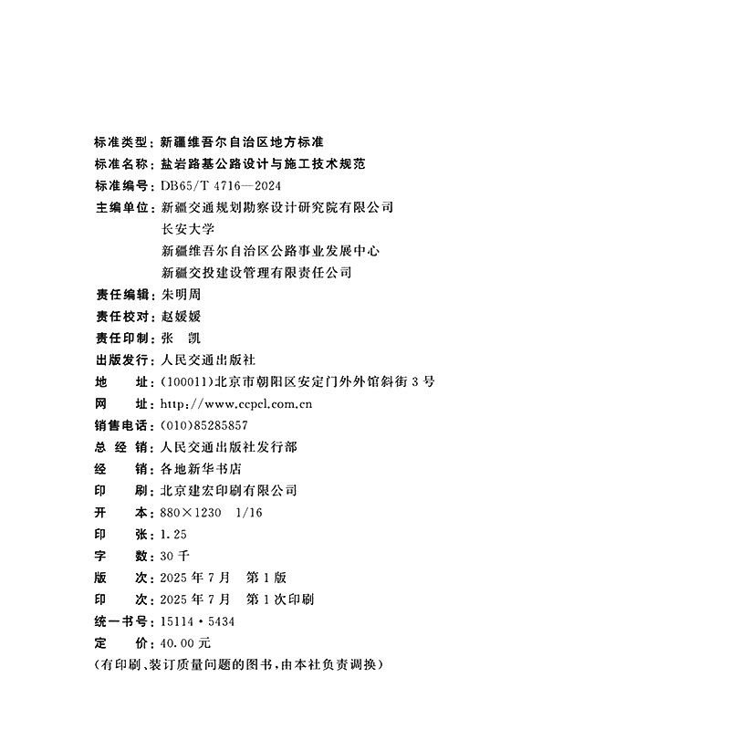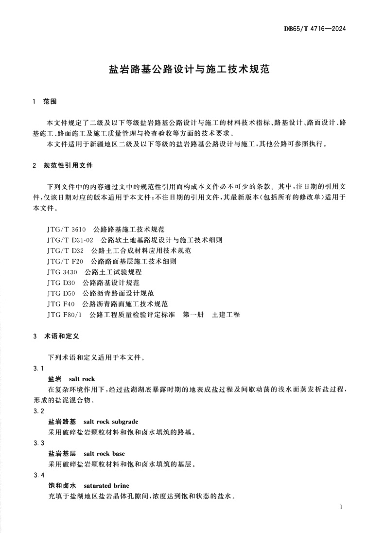 书名:盐岩路基公路设计与施工技术规范(DB65/T 4716—2024)