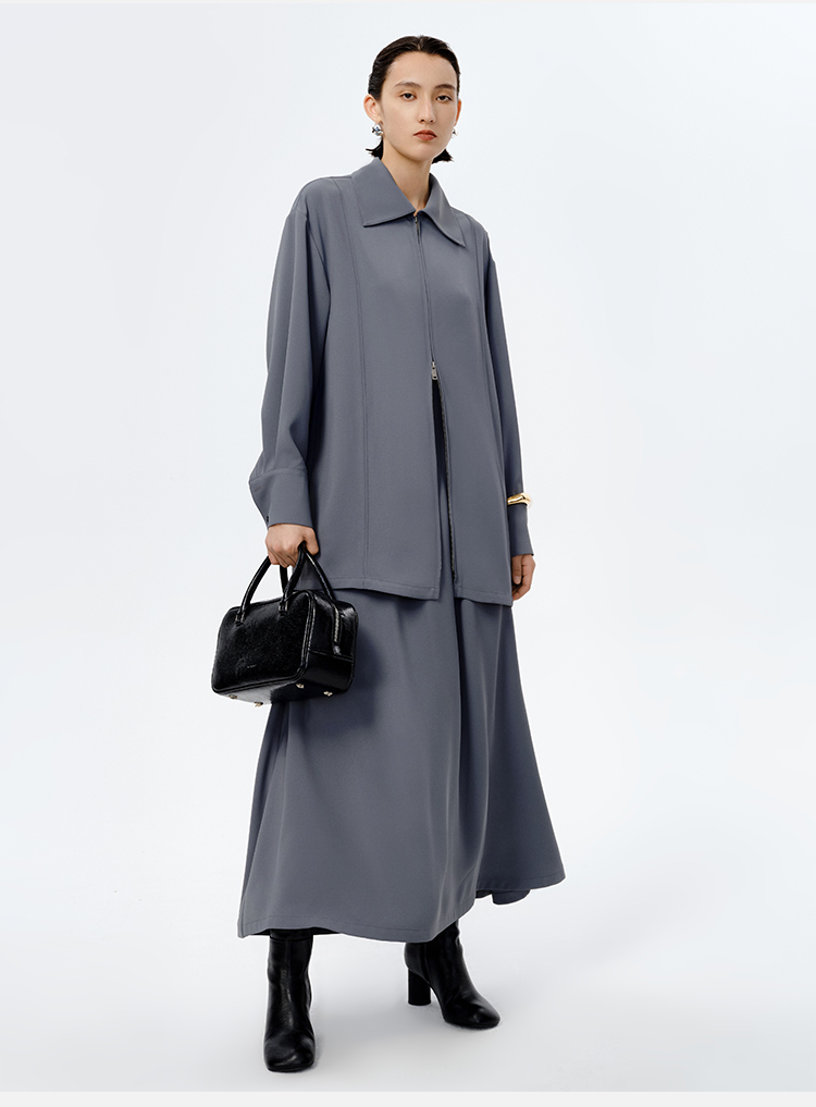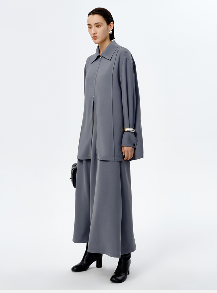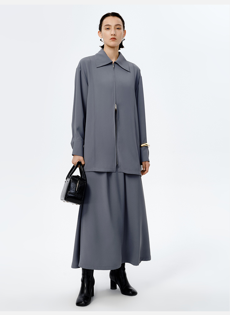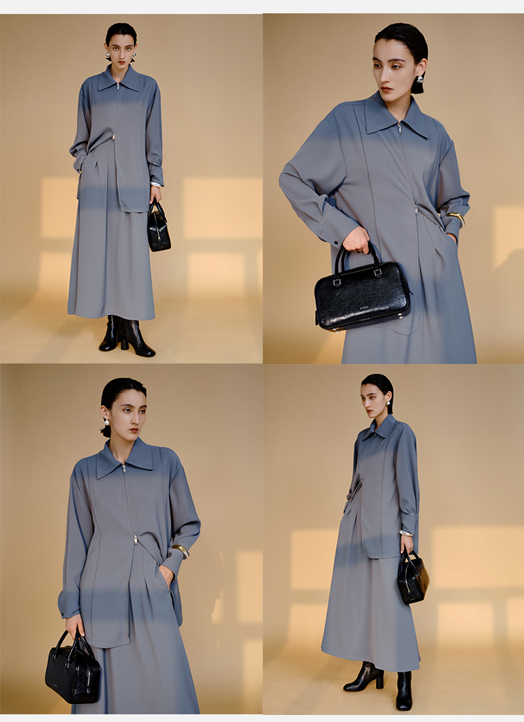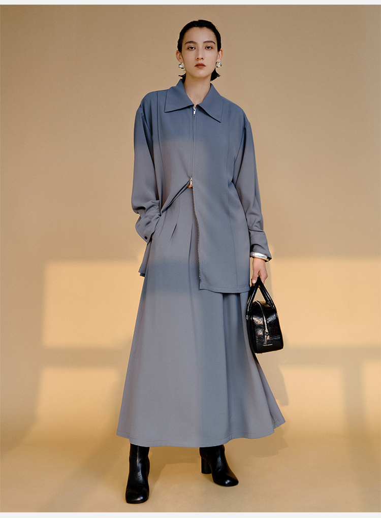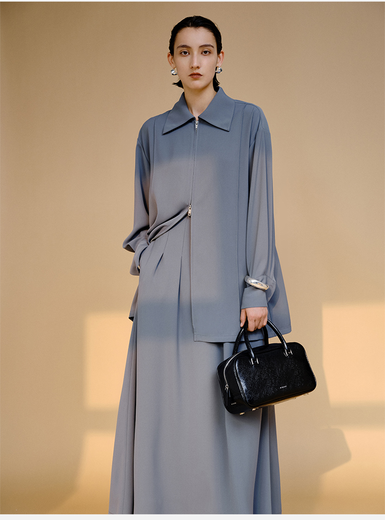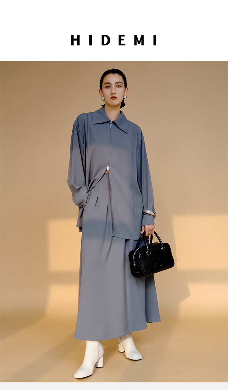 HIDEMI 极简斜纹双头拉链海军领缎面感套装 上衣/半身裙