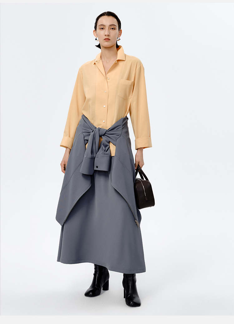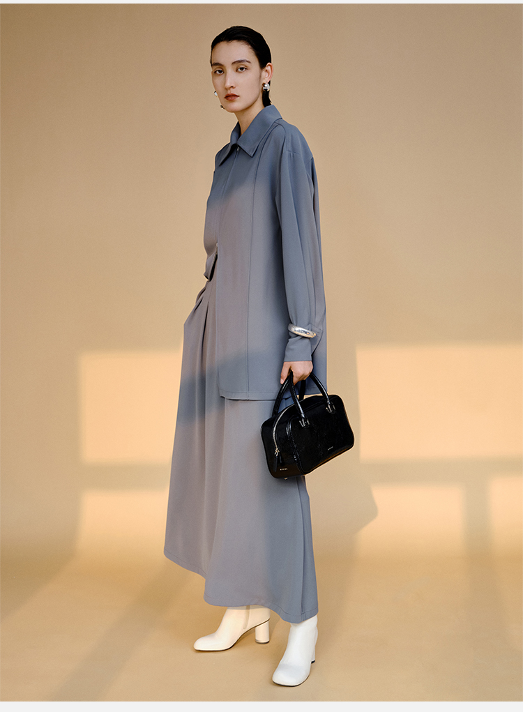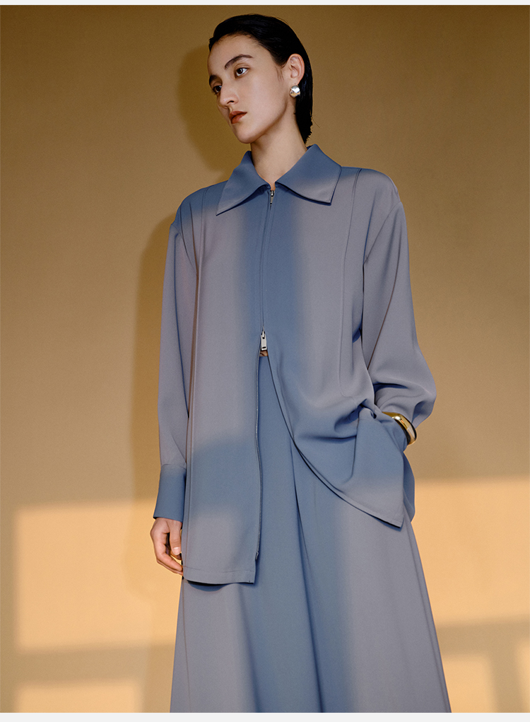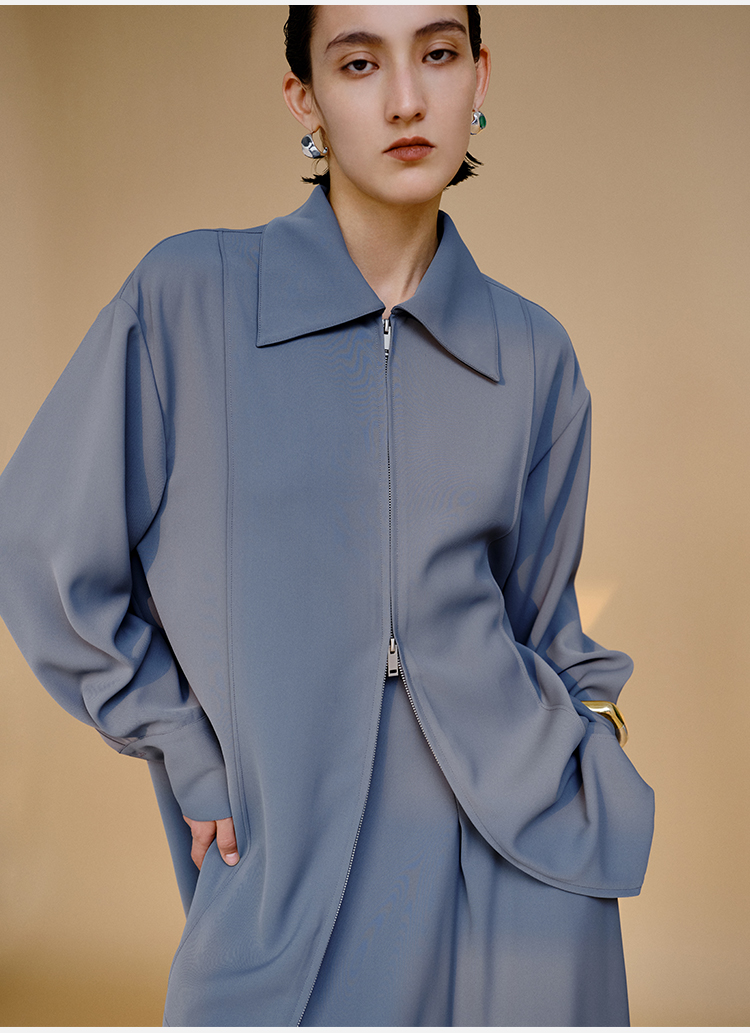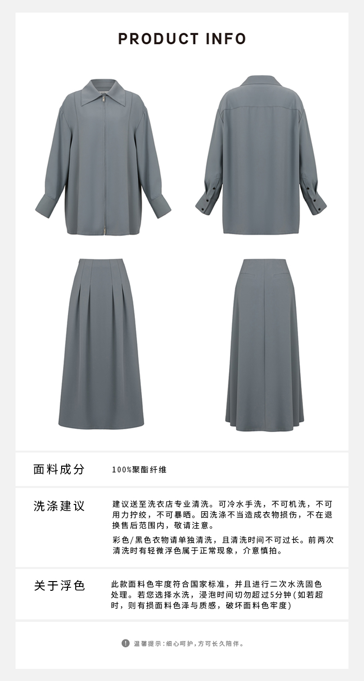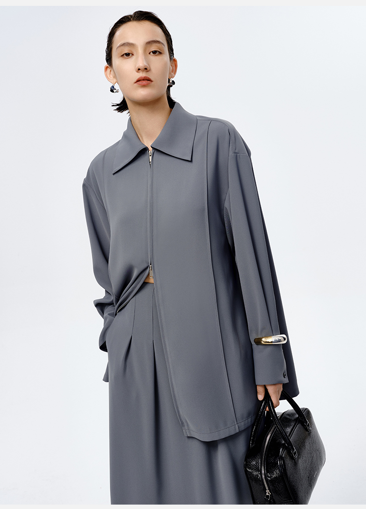HIDEMI 极简斜纹双头拉链海军领缎面感套装 上衣/半身裙