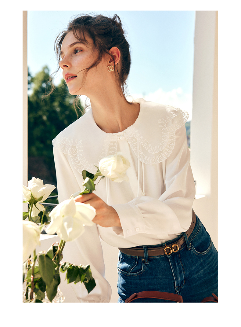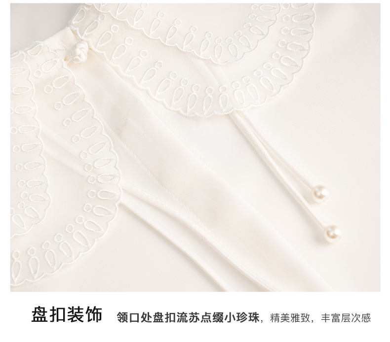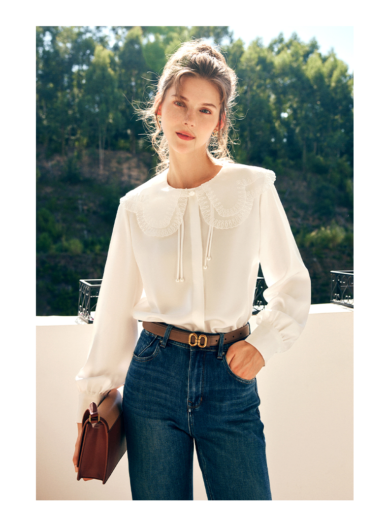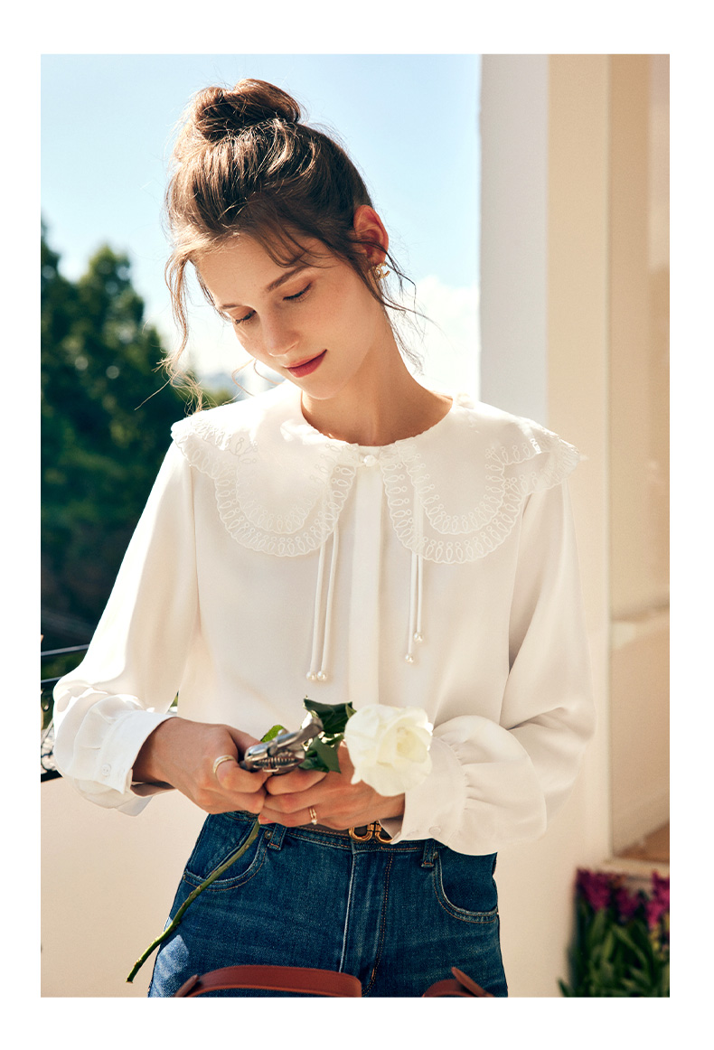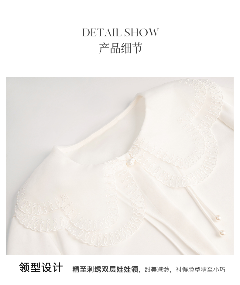 OLrain欧芮儿法式娃娃领雪纺蕾丝衫女秋季2022年新款宽松甜美小衫
