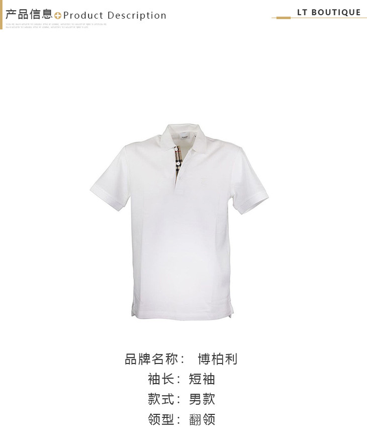 【二】BURBERRY 博柏利 翻领 男性 简约 运动风 男士短POLO 白色 8014005 A1464