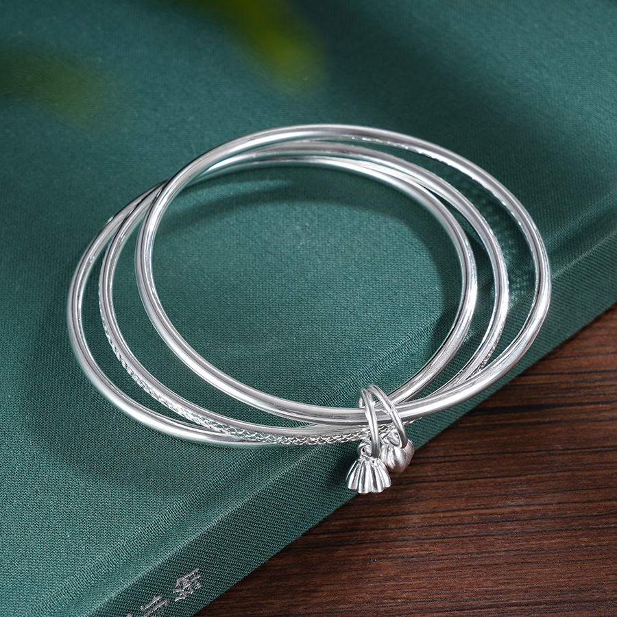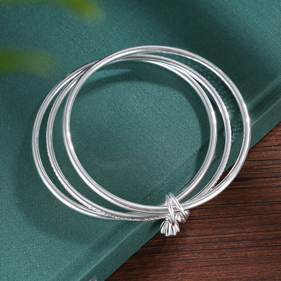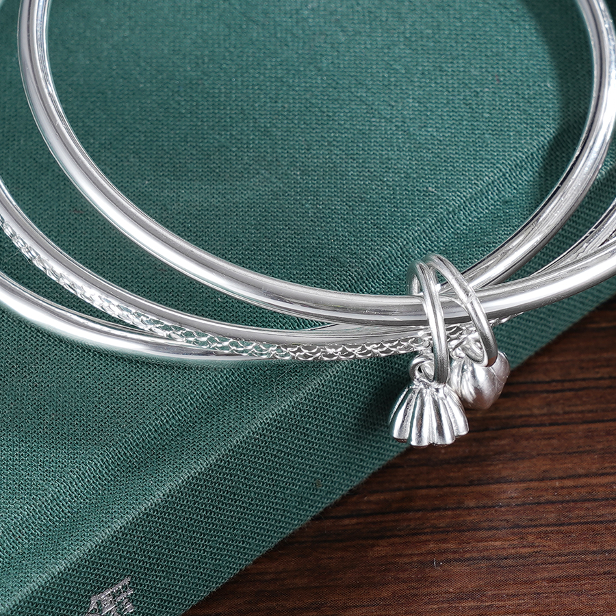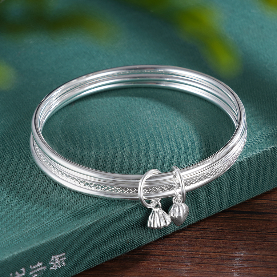【寓意】:一款独特的三圈闭口手镯,戴上显白显瘦细。手镯之上点缀莲花莲蓬小坠饰,清雅灵动,寓意两世欢喜。