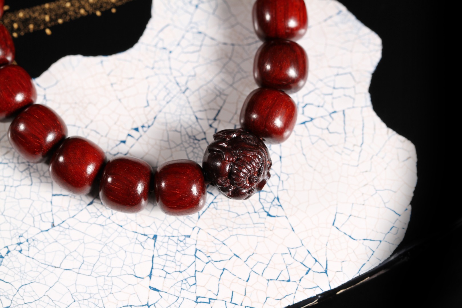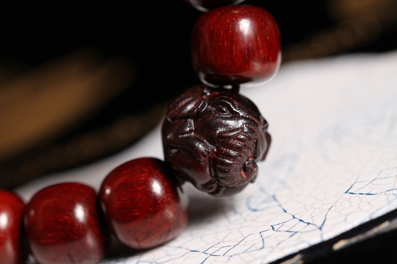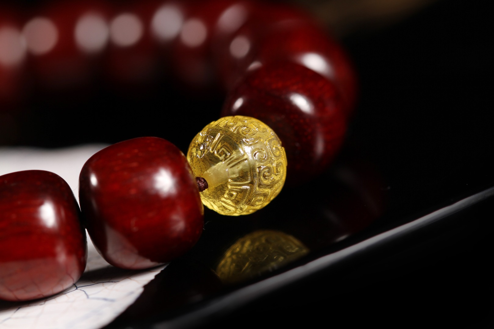 采用0.9x1.0规格紫檀进行创作,搭配中国传统题材——吉象,象通祥,有吉祥之意,大象善吸水,水为财,所以大象还有招财之意,同时点缀蜜蜡回纹珠,是象征性极强的传统“守护”饰物。