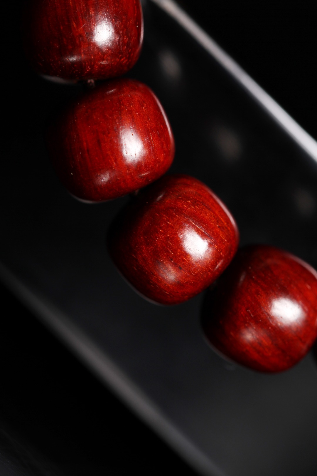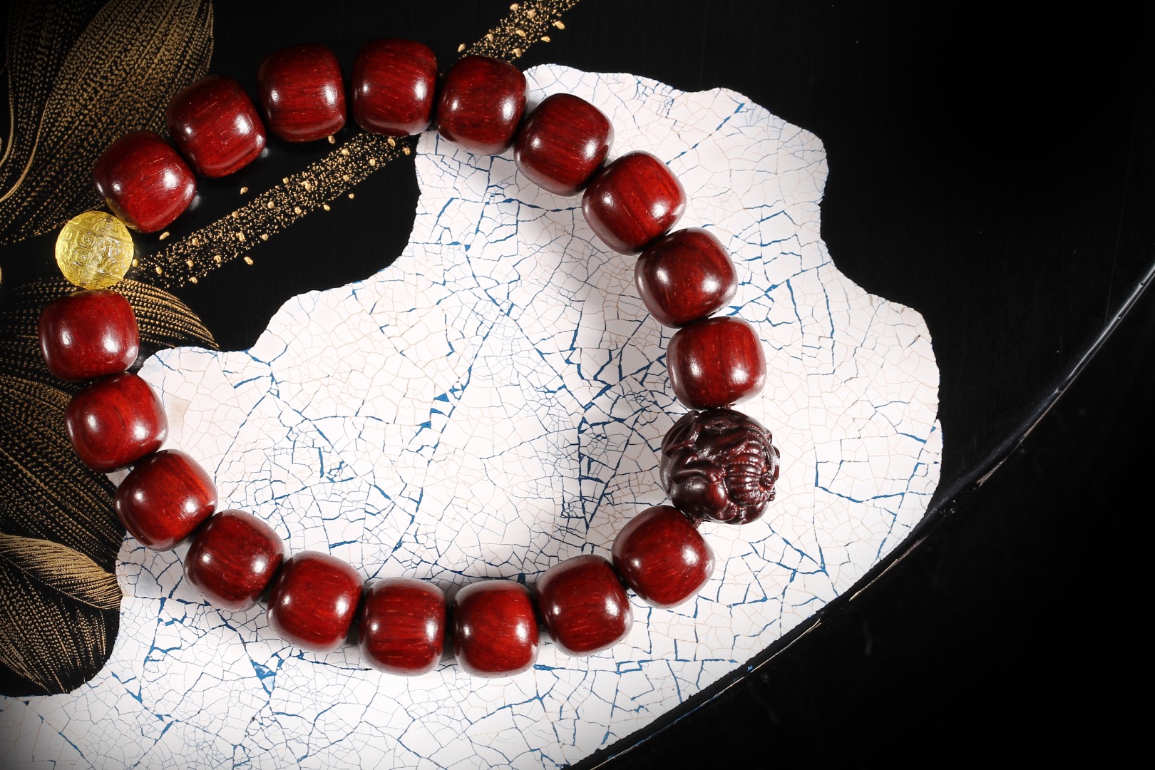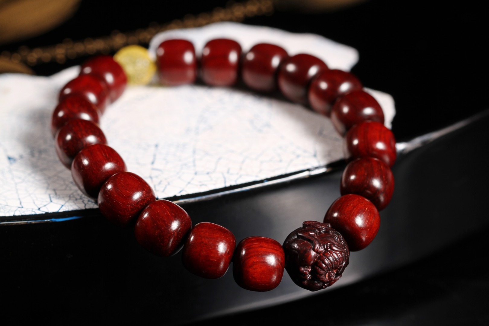 采用0.9x1.0规格紫檀进行创作,搭配中国传统题材——吉象,象通祥,有吉祥之意,大象善吸水,水为财,所以大象还有招财之意,同时点缀蜜蜡回纹珠,是象征性极强的传统“守护”饰物。