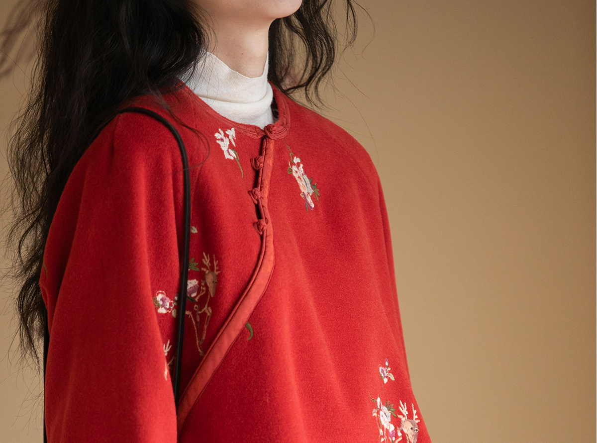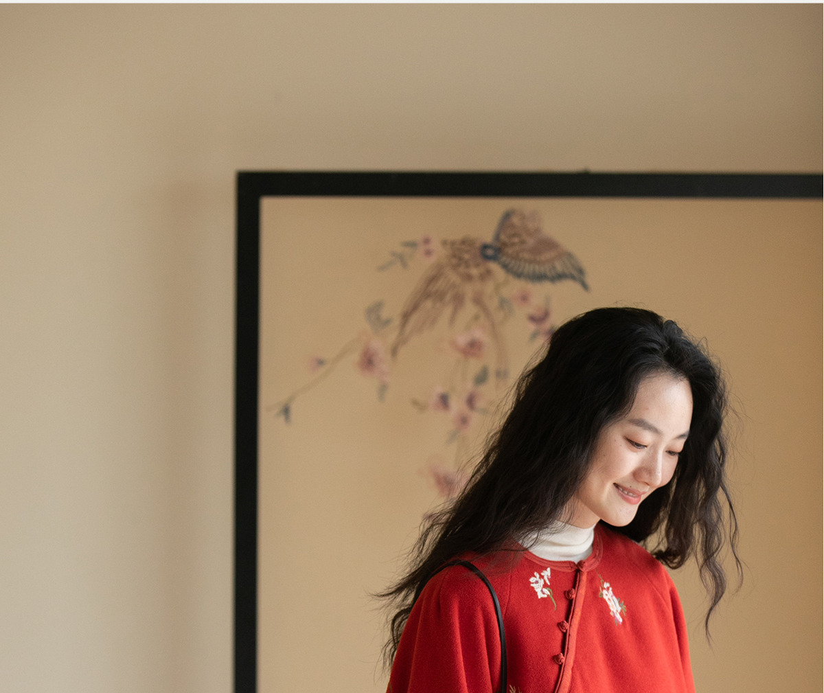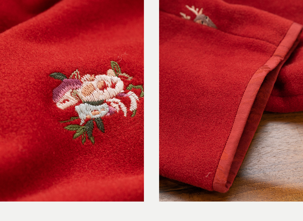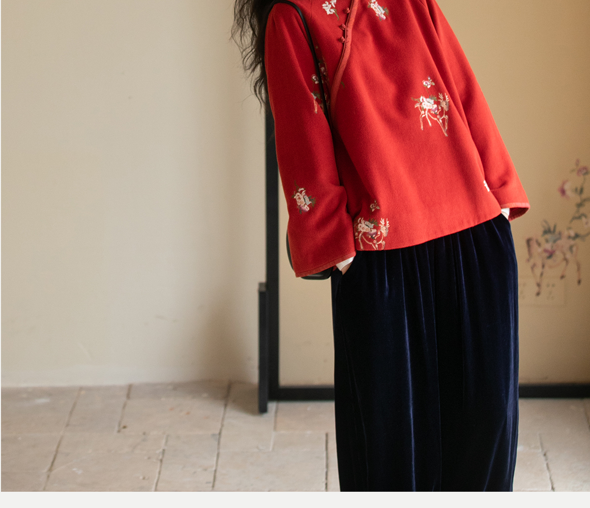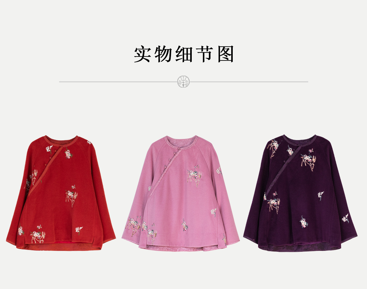 牧衣游原创 匹绣进口澳毛呢套头衫女新款100%羊毛红色上衣 草木香