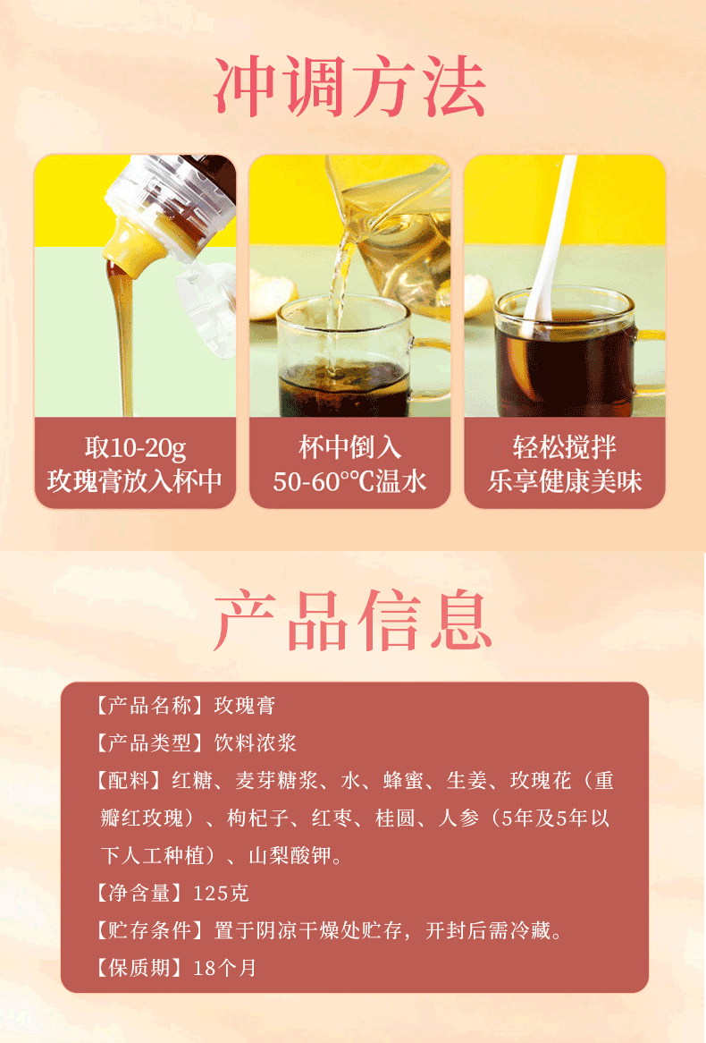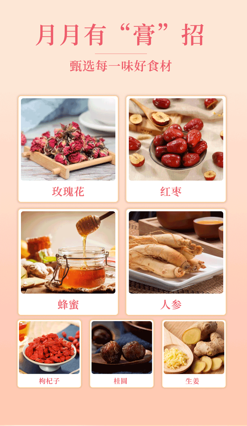 成分:红糖、麦芽糖浆、水、蜂蜜、生姜、玫瑰花、枸杞、红枣、桂圆、人参(人工种植5年及5年以下)