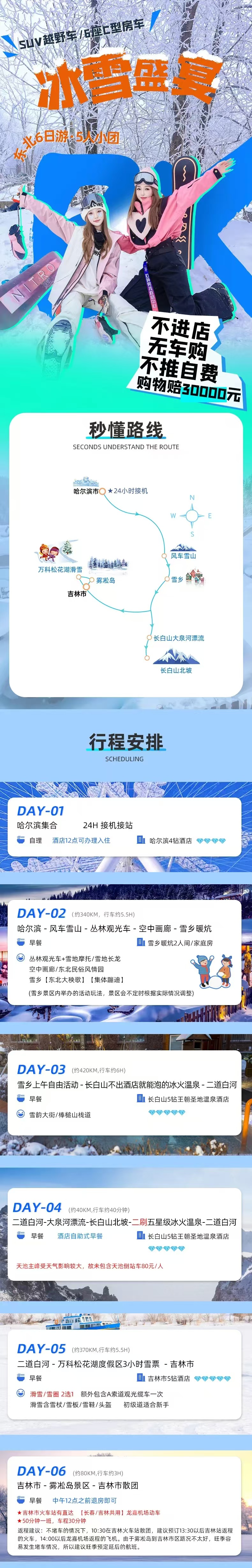 (2)哈尔滨的冰雪旅游旺季,为了防止堵车情况,可能会提前出发时间,打包酒店早餐在车上吃。如遇下大雪,车辆行驶会比平时缓慢,为了让大家不在路上浪费时间,尽量将时间用在玩上,大雪天气也可能会提前出发,建议自备高热量零食。