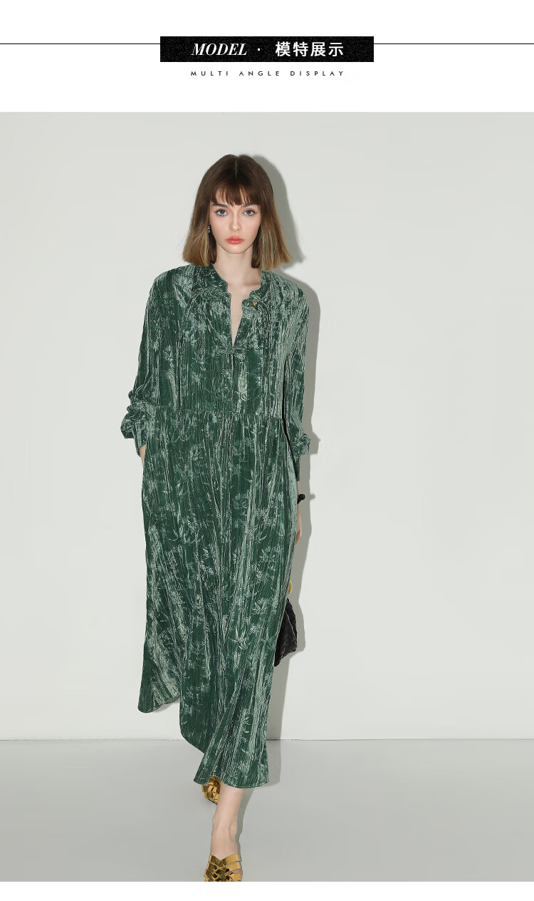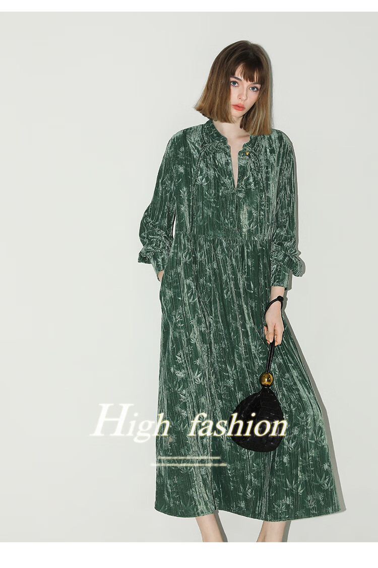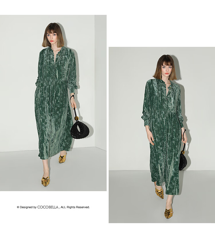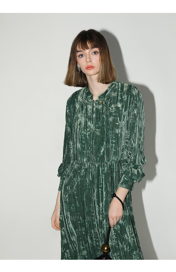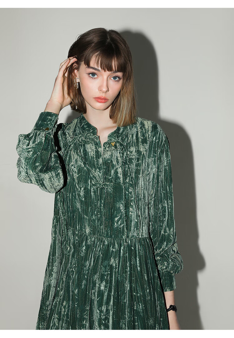 【限时秒杀】COCOBELLA竹叶拓印国风丝绒连衣裙手缝盘扣压褶衬衫裙FR0002