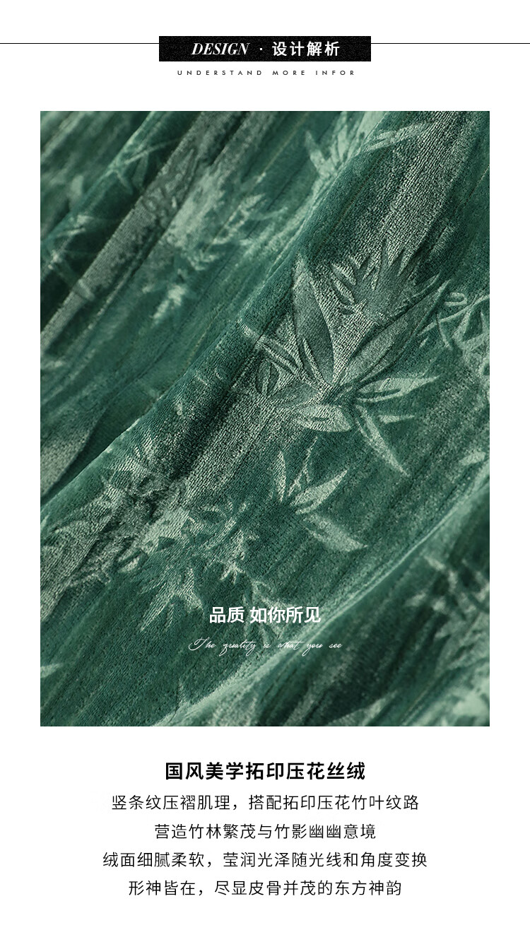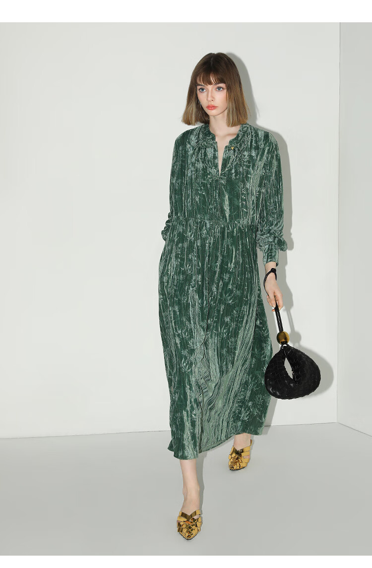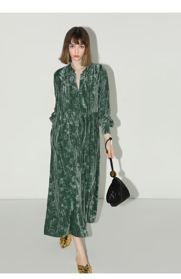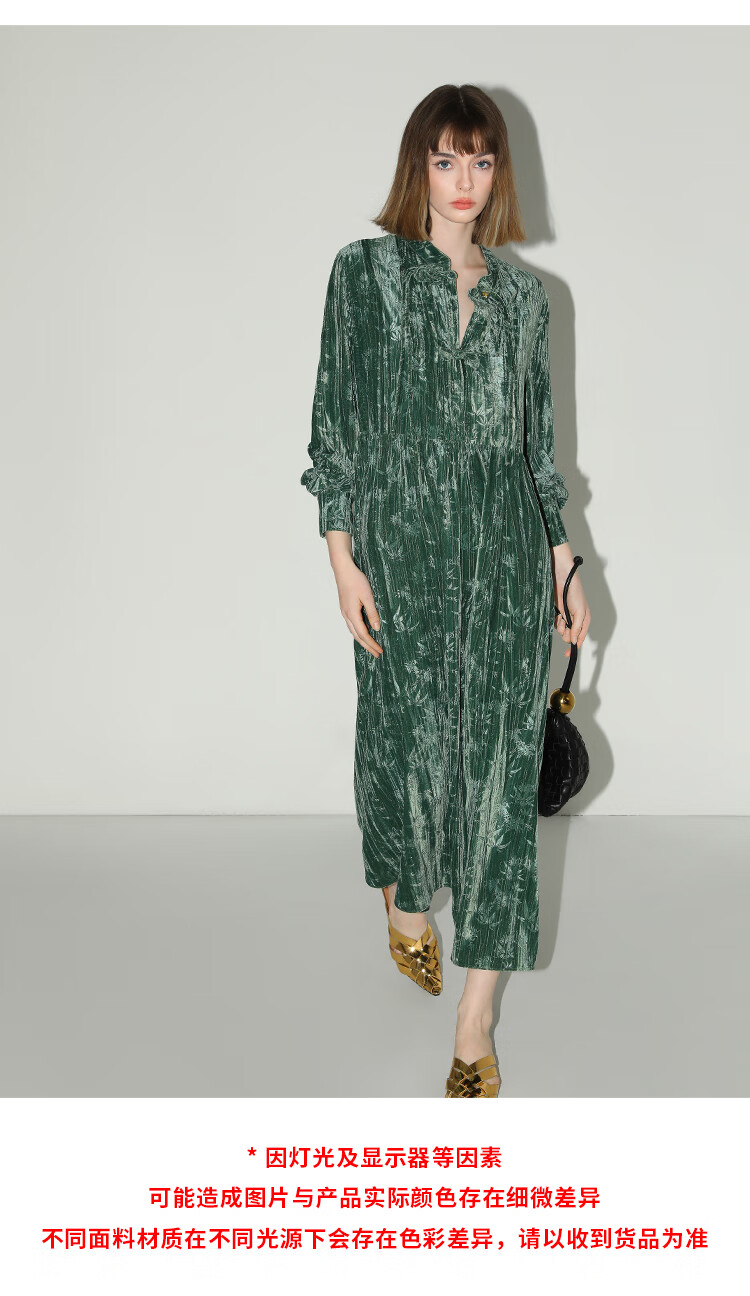 【限时秒杀】COCOBELLA竹叶拓印国风丝绒连衣裙手缝盘扣压褶衬衫裙FR0002