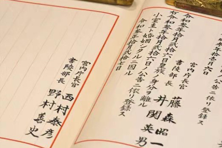 *日本皇室宫内厅长官西村泰彦用“湖笔”,记录“小室真子”脱离皇室一事。