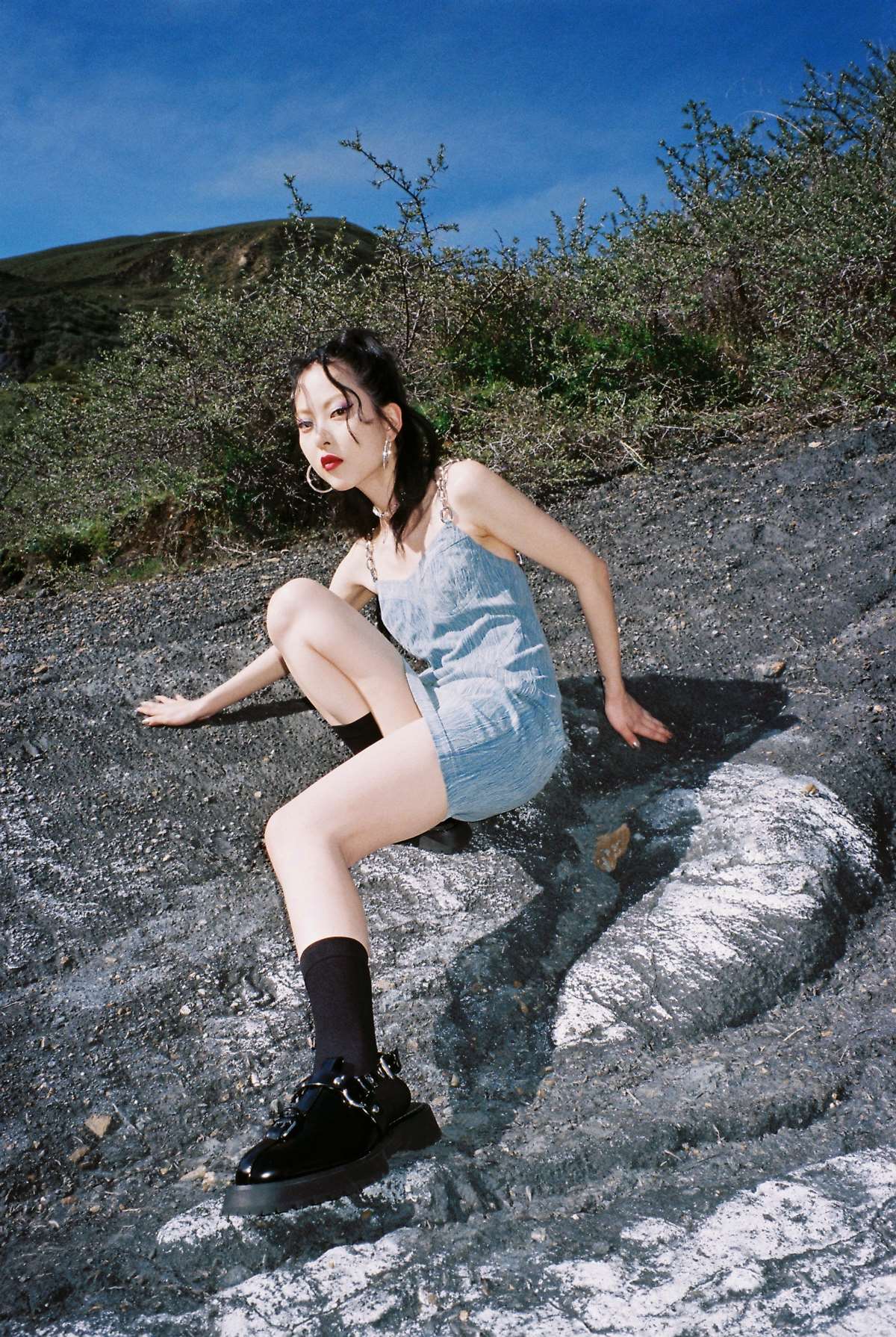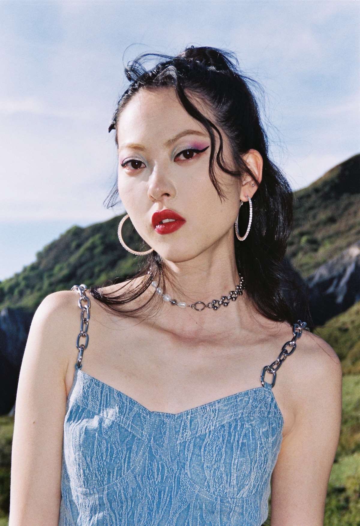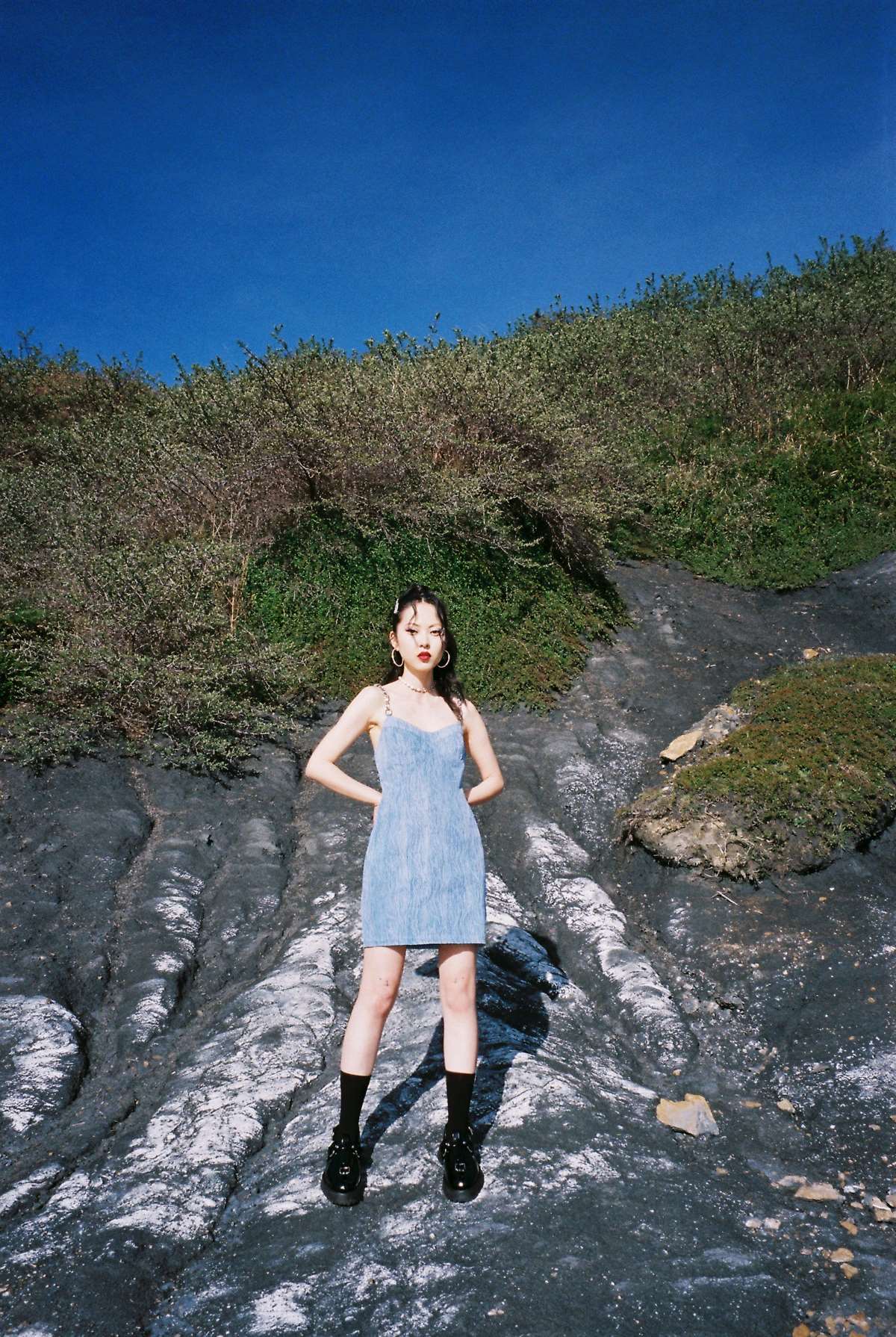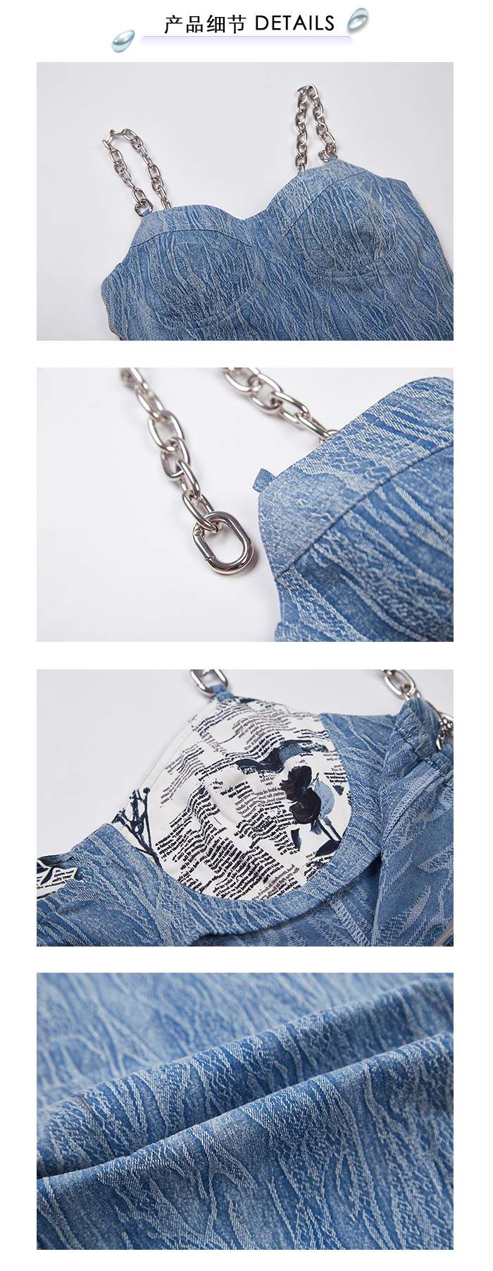 EhK 夏季女设计感高腰蓝色水洗纹理牛仔链条吊带连衣裙