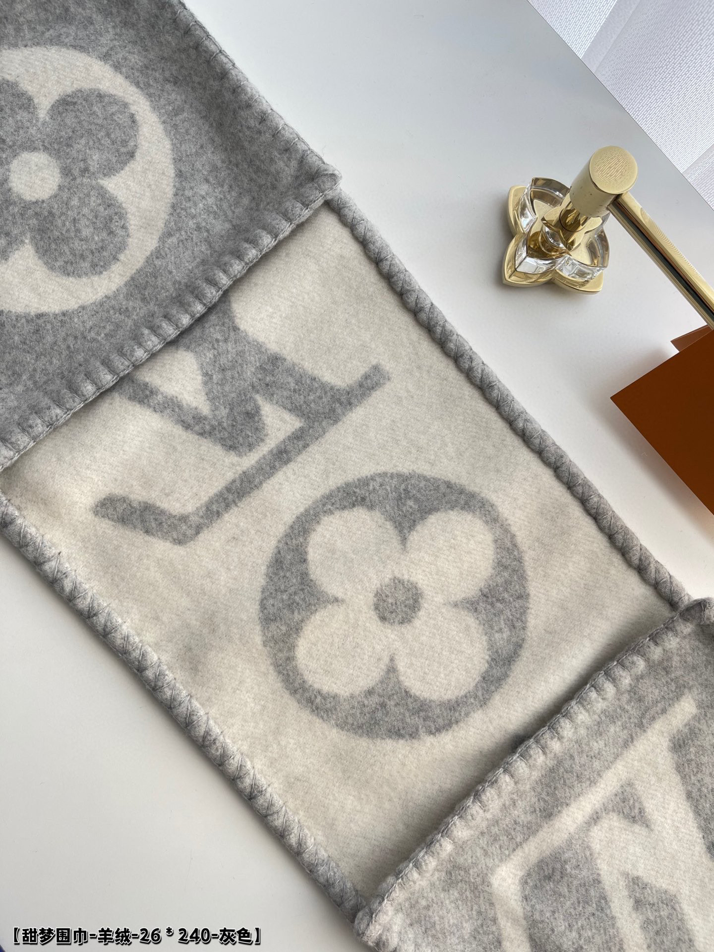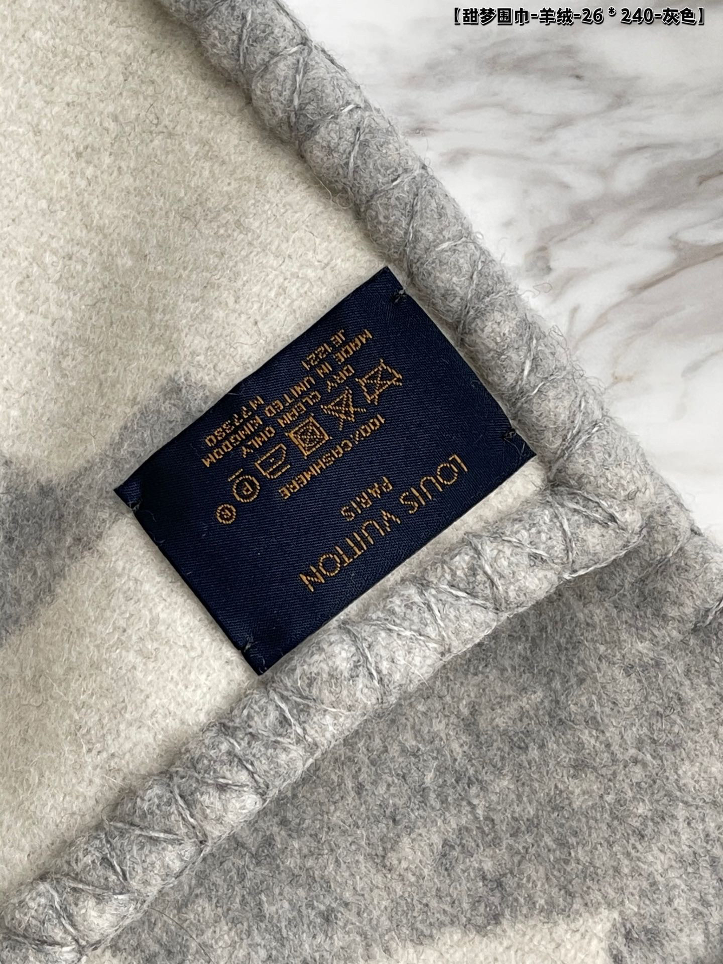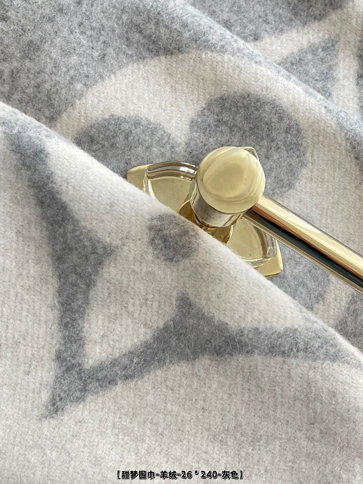 Sweet Dreams 围巾瞩目放大经典 Monogram 图案,以繁复边缘缝线增添细腻肌理。仿若毛毯的丰盈山羊绒抵御凛凛寒风。