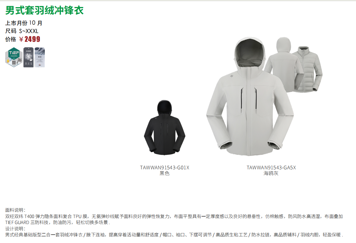 探路者男式套羽绒冲锋衣TAWWAN91543