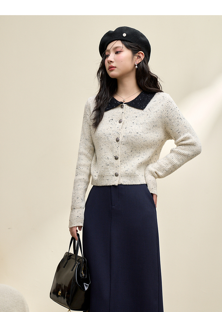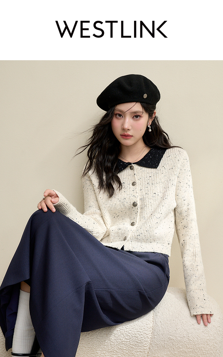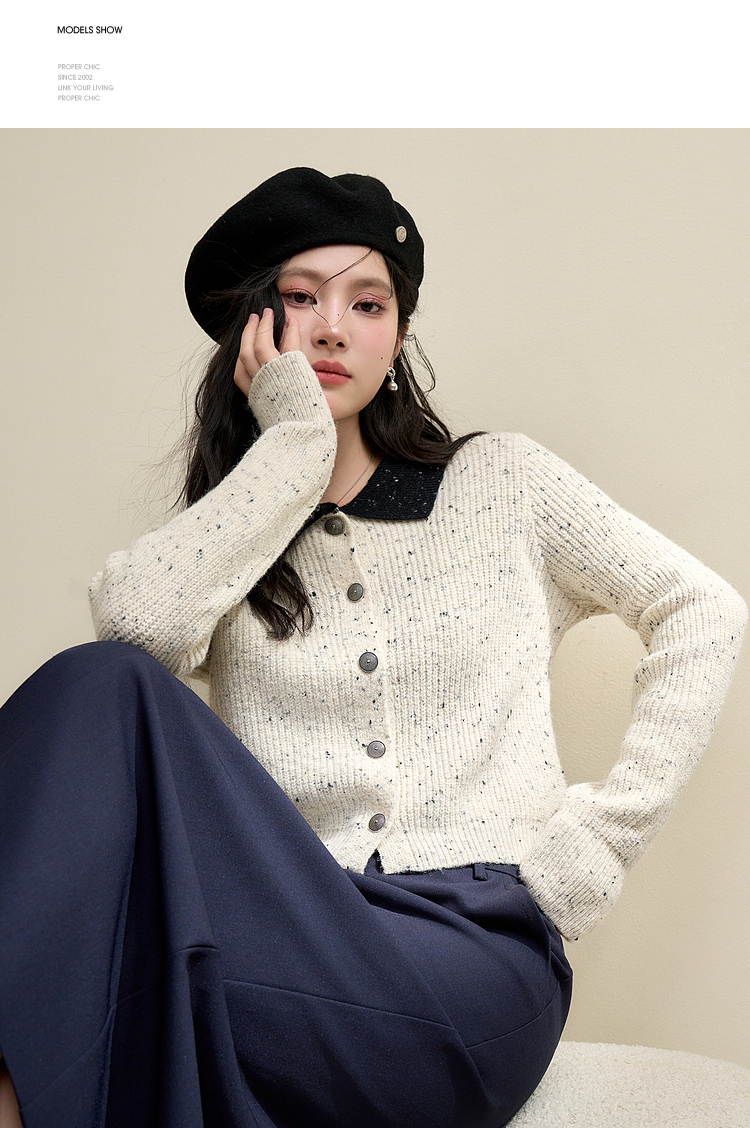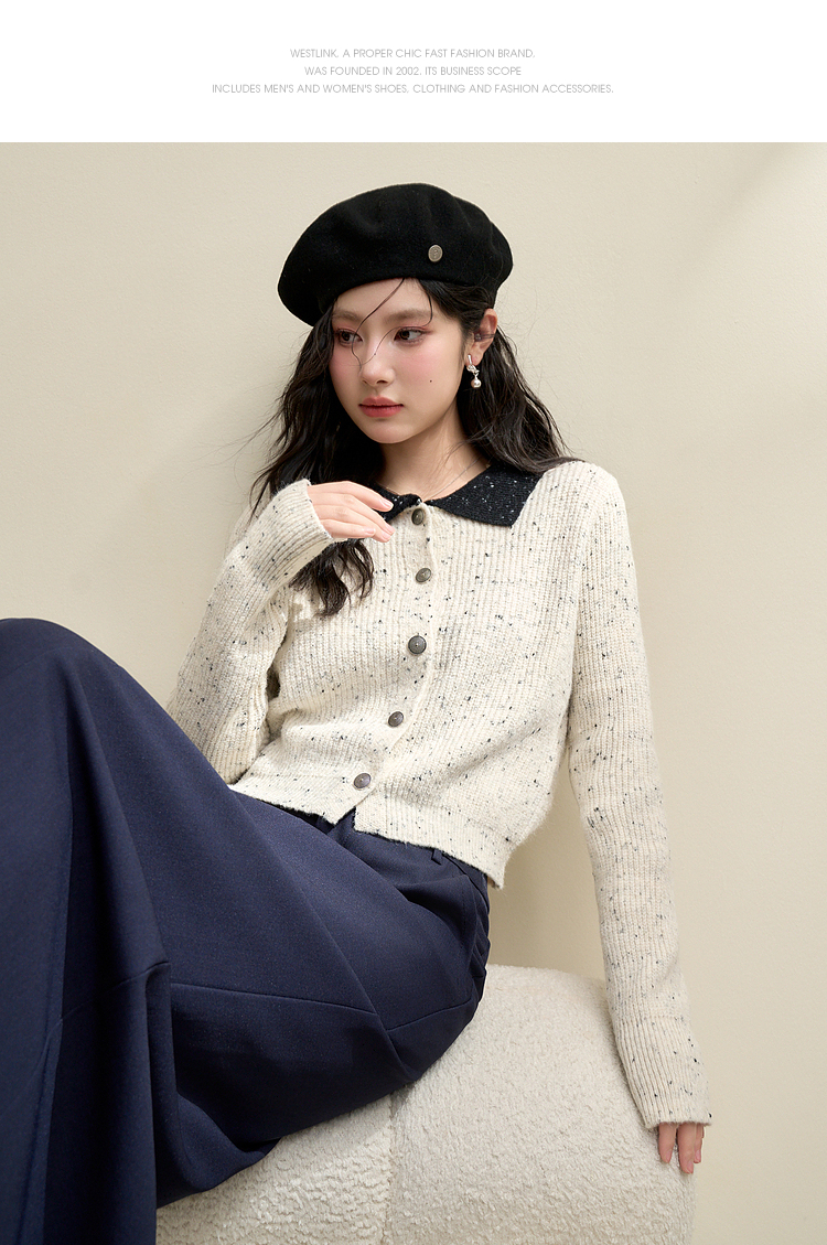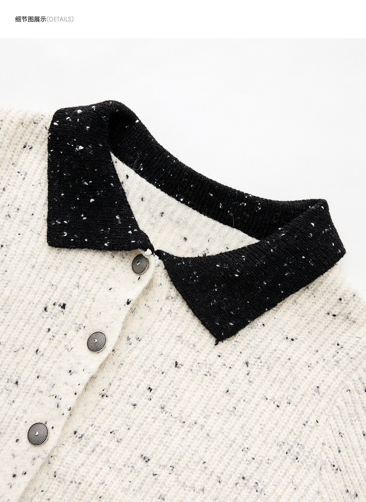 西遇针织开衫秋季新款法式斑点撞色小香风修身翻领毛衣外套P0043444