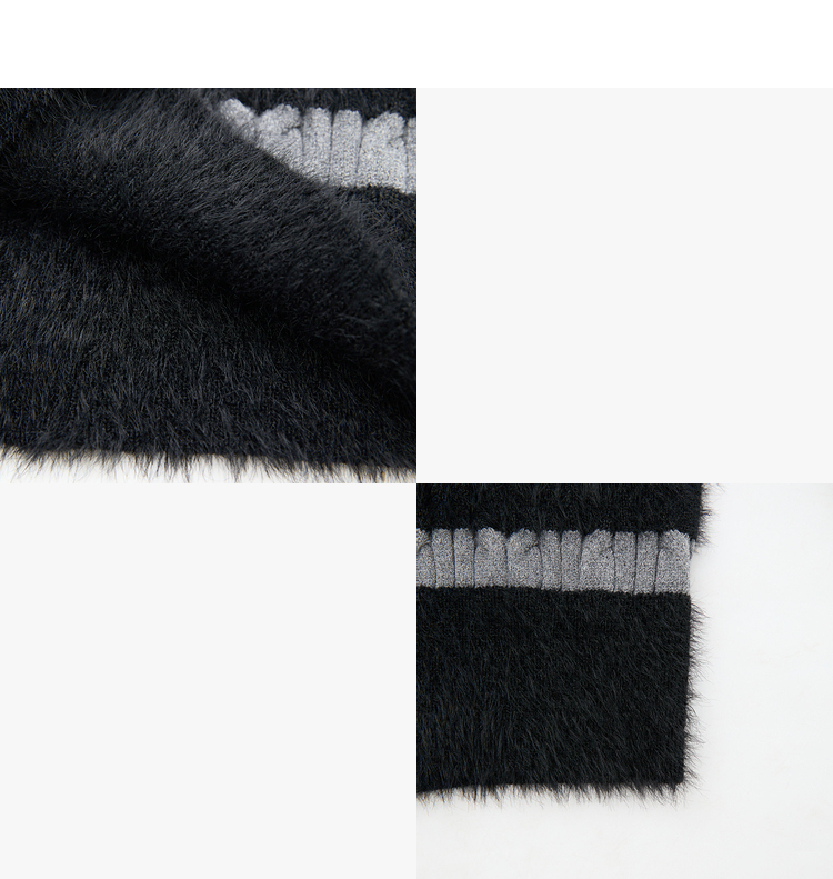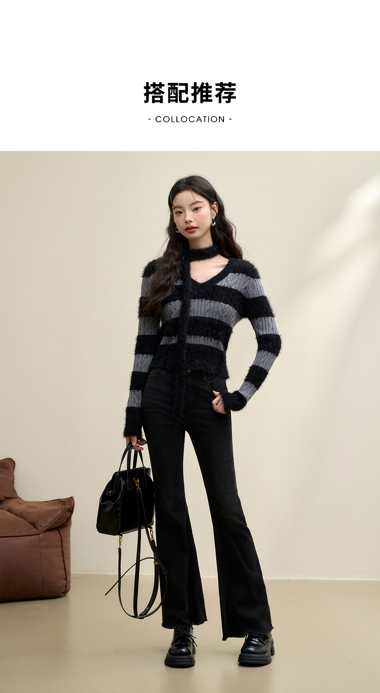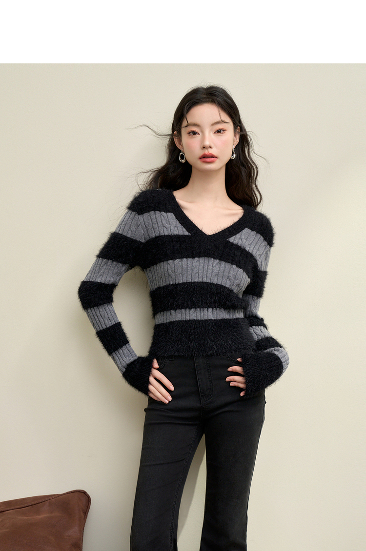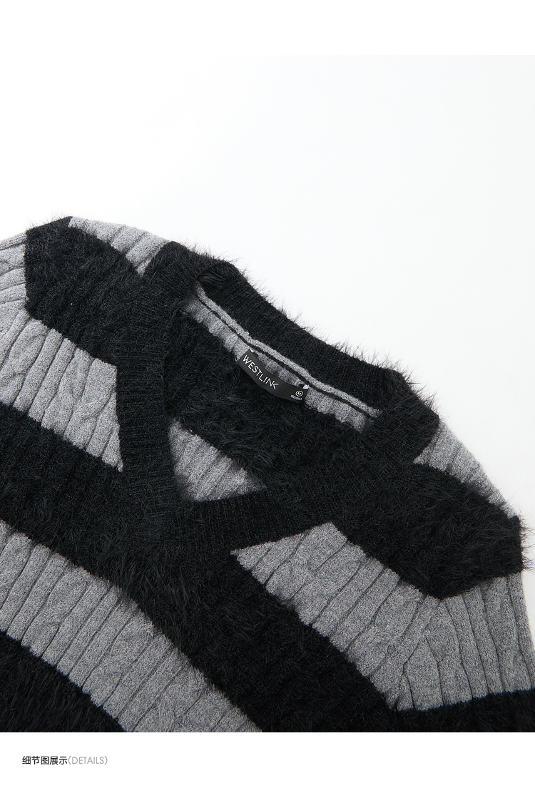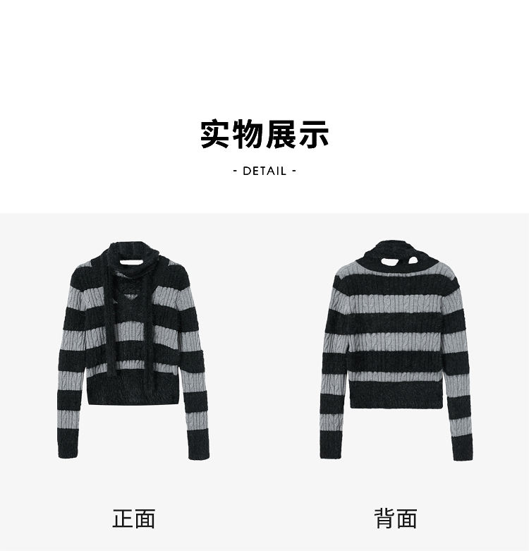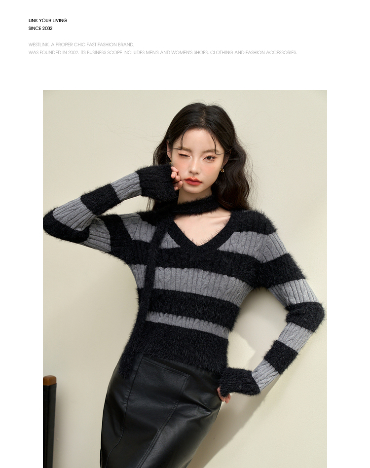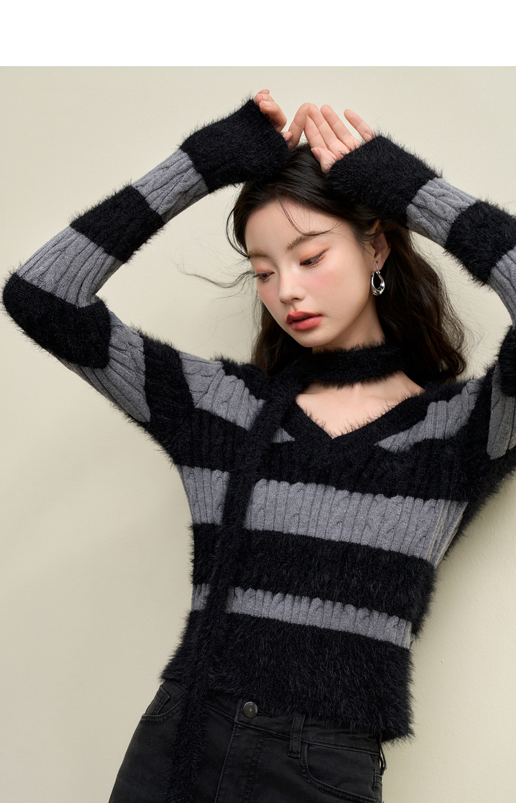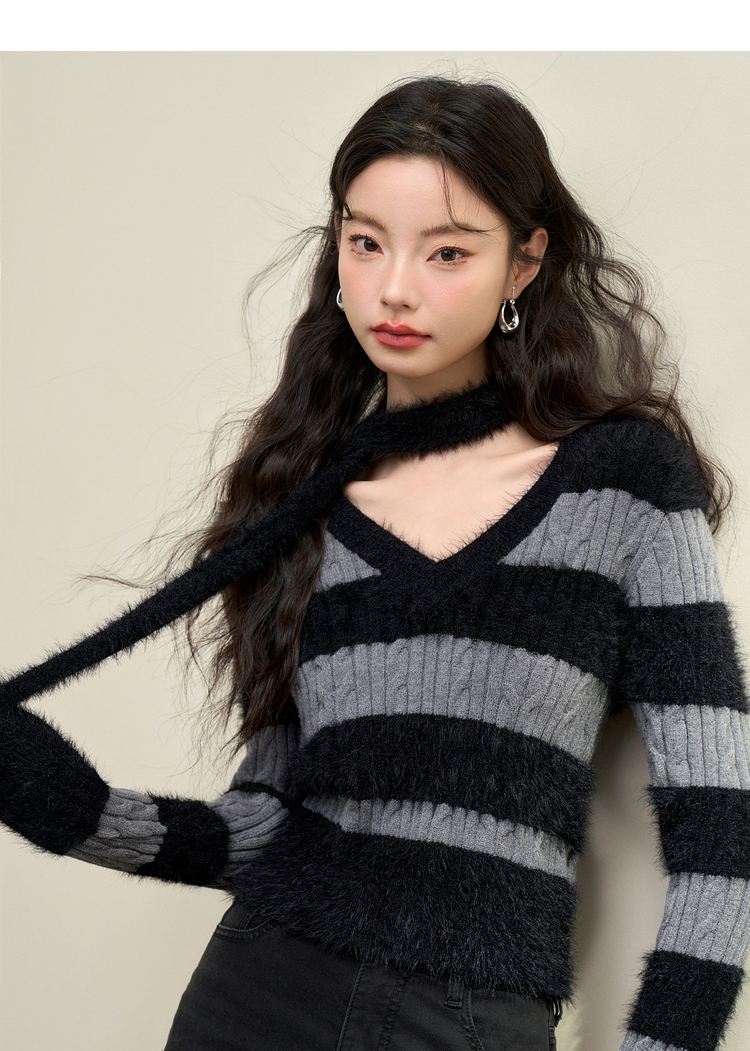 甜酷拼接条纹长袖针织毛衣女秋季性感V领修身上衣搭飘带V4142930