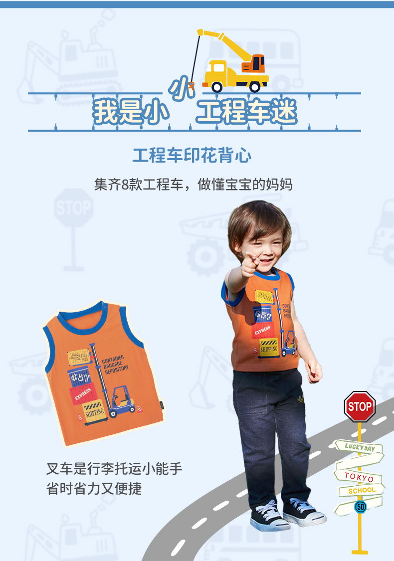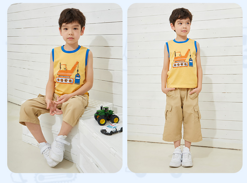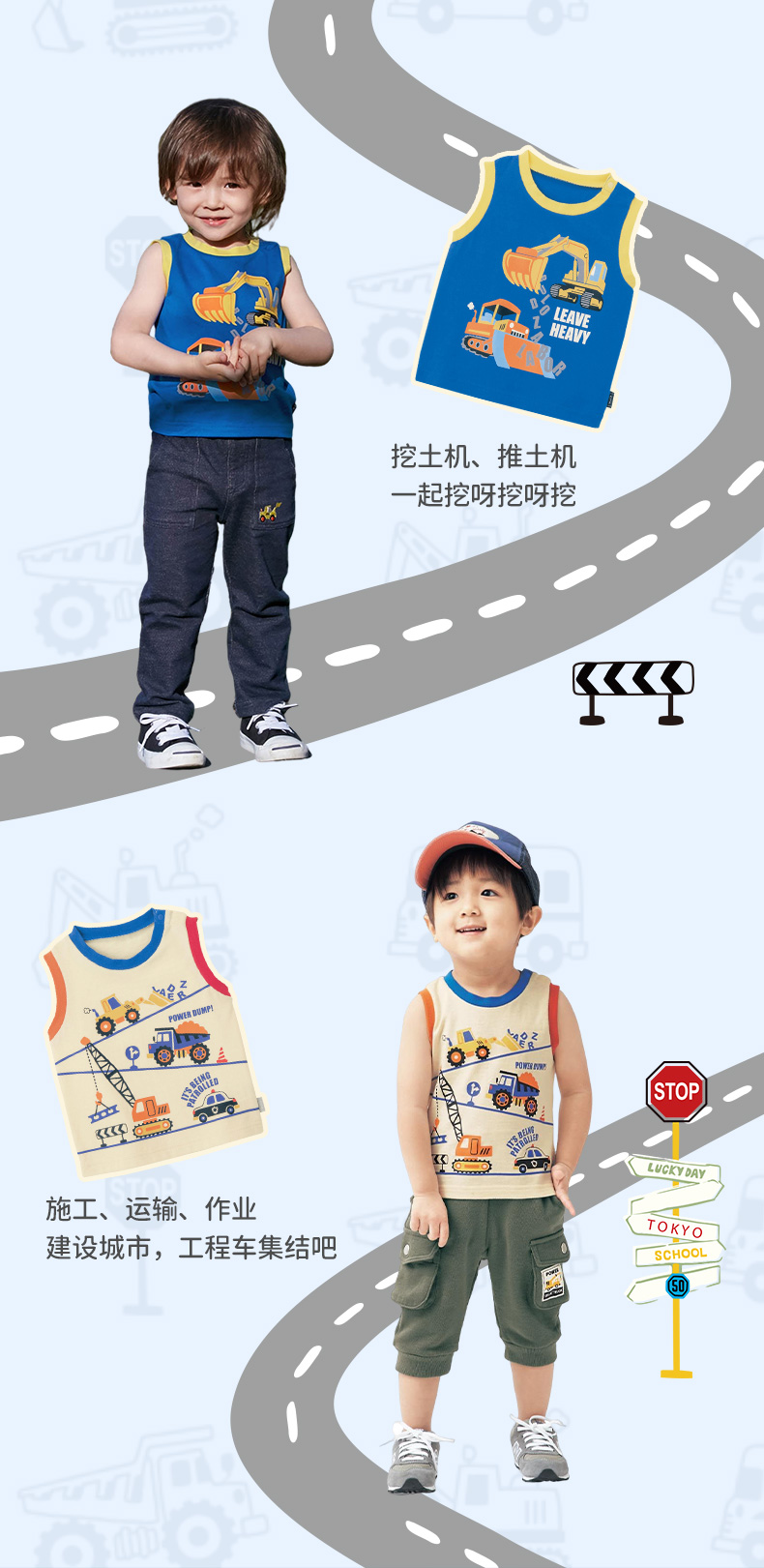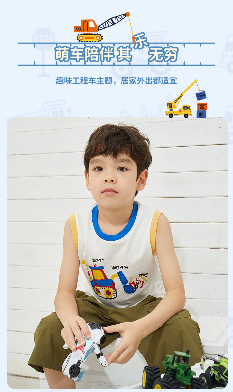 千趣会夏季无袖T恤外穿纯棉透气工程车印花潮酷男童运动背心
