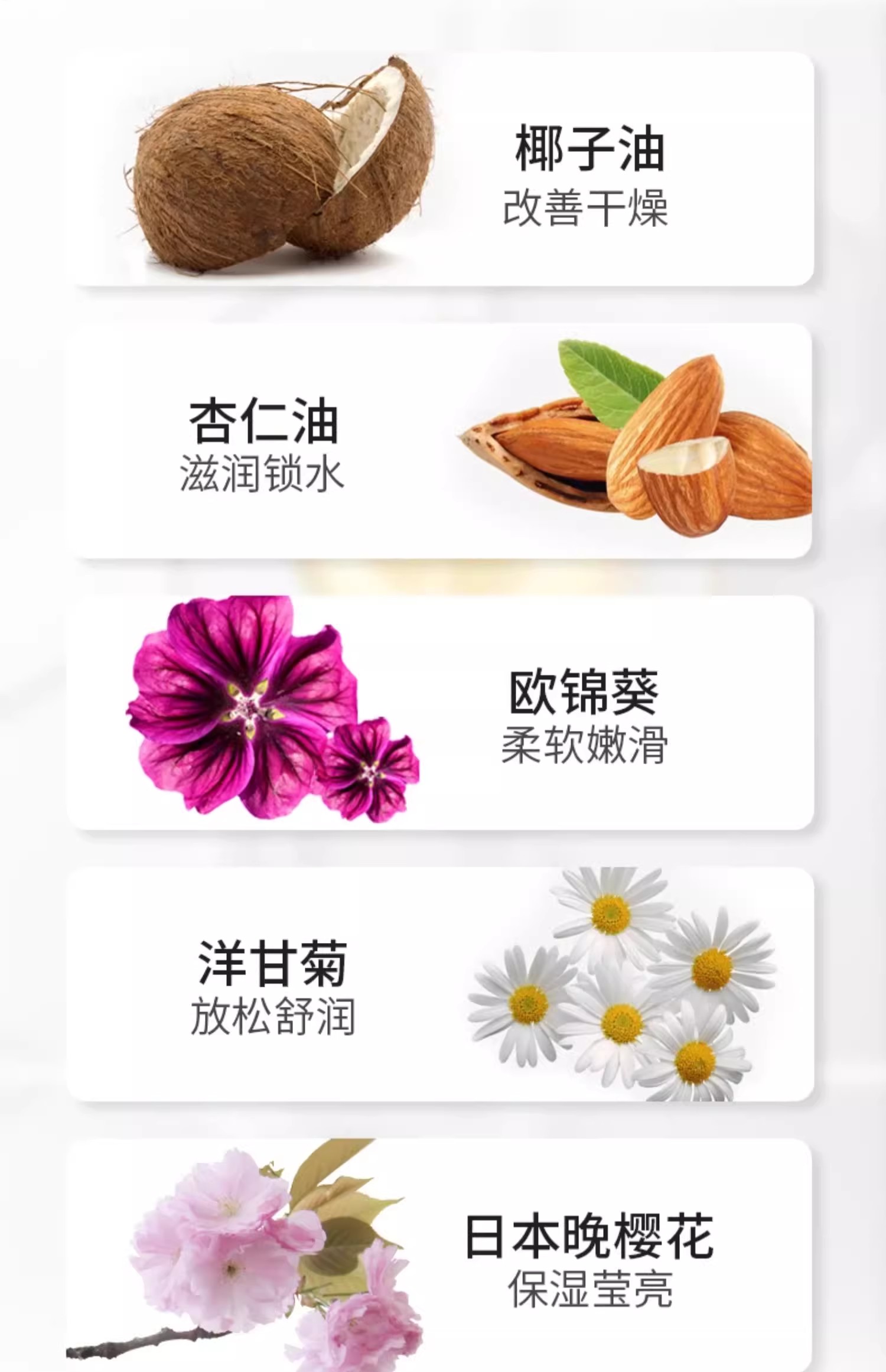 其中椰子油、杏仁油等提取物能够持续保持滋养