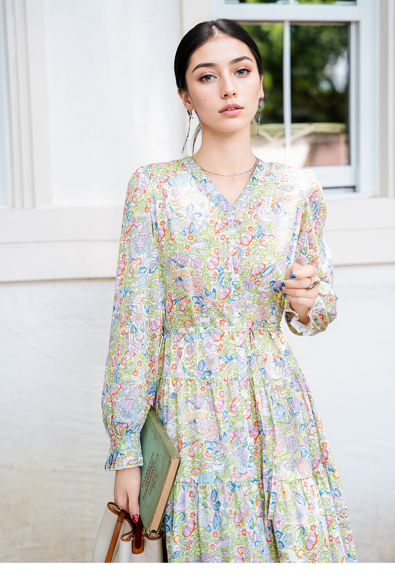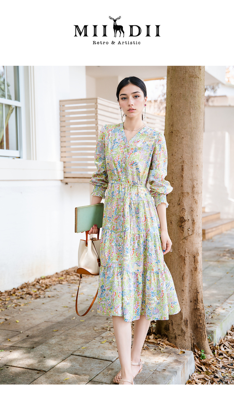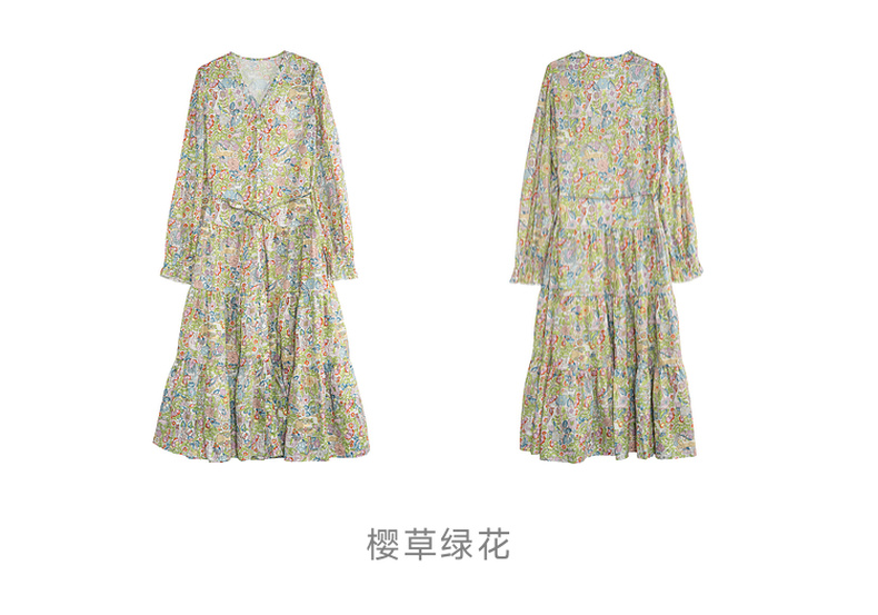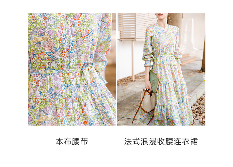 谜底碎花连衣裙长袖2025秋新款复古田园风V领长裙配腰带257ML7841