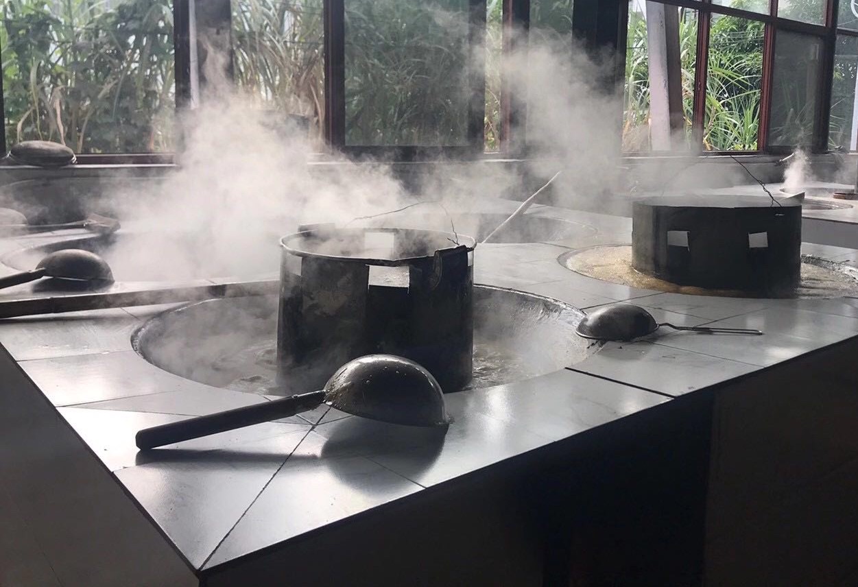 榨出的甘蔗汁通过一系列过滤后倒入大锅