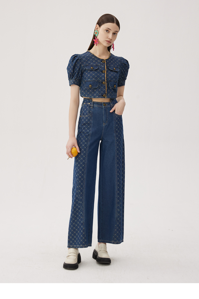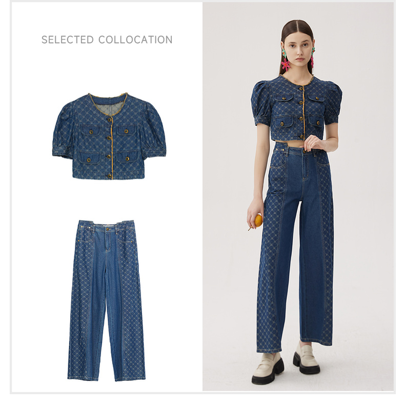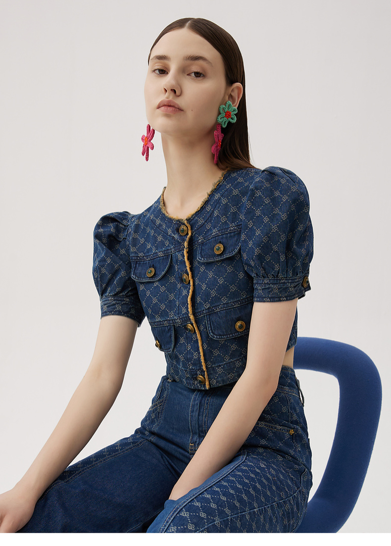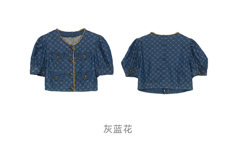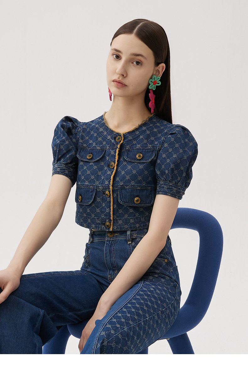 谜底短款上衣短袖女2024夏款复古风牛仔提花单排扣外套247MW5019