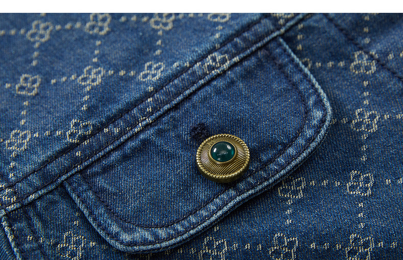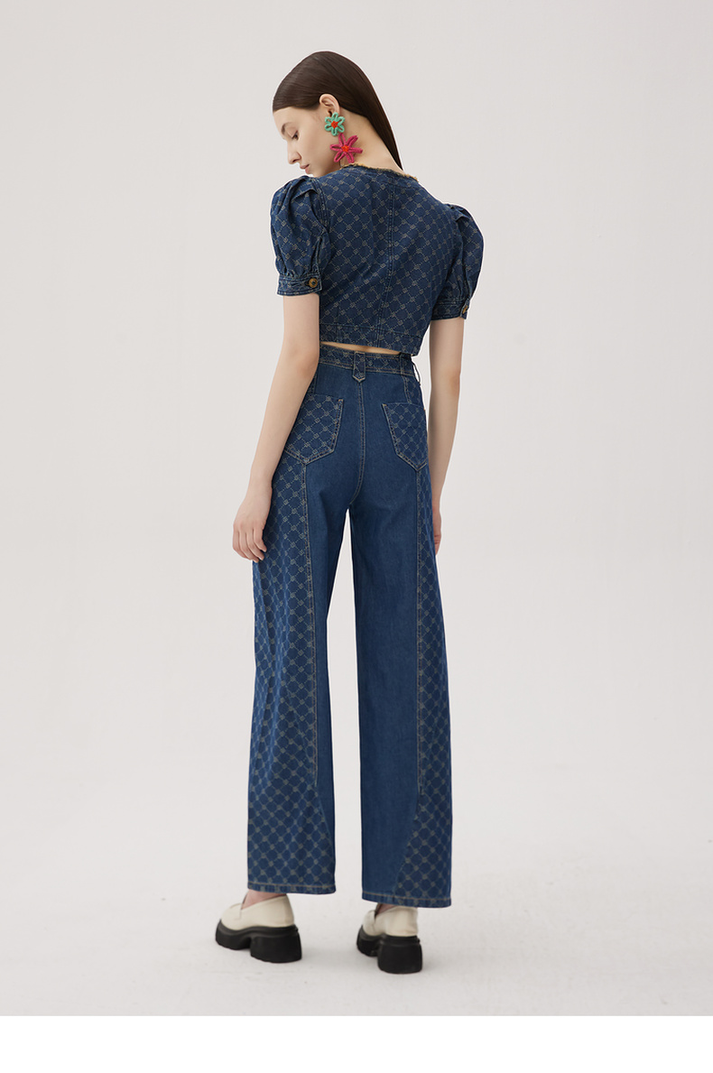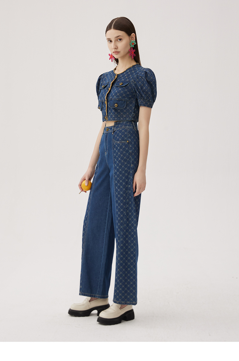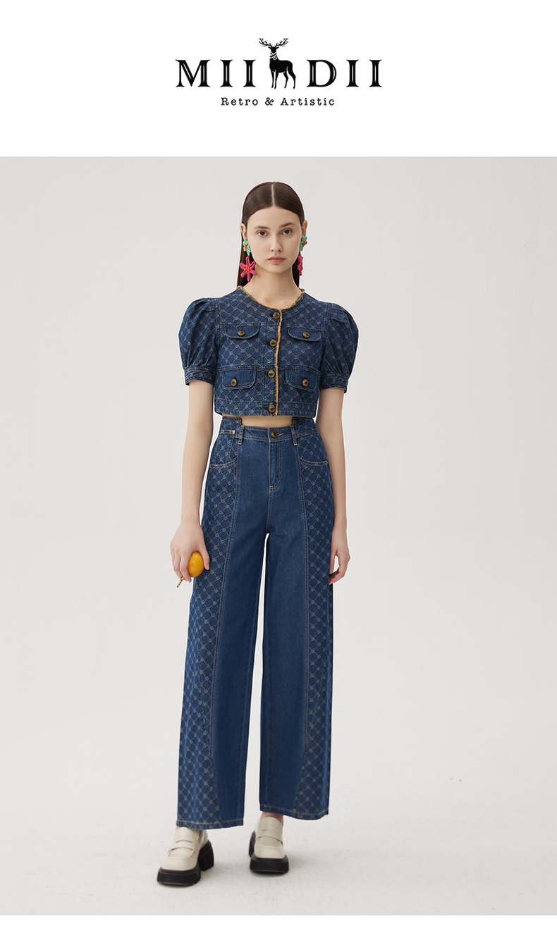 谜底短款上衣短袖女2024夏款复古风牛仔提花单排扣外套247MW5019