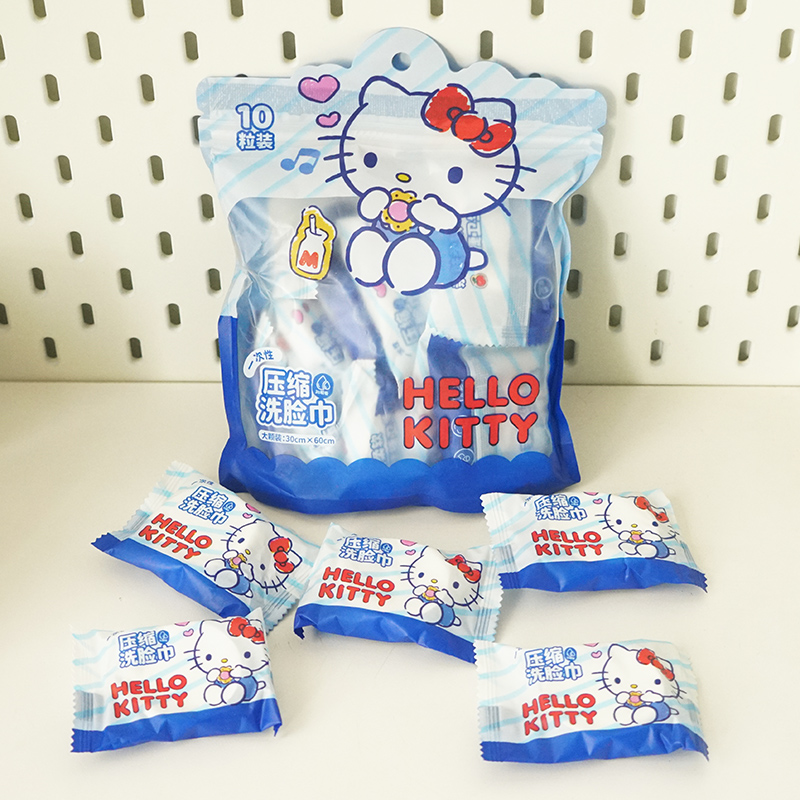 三丽鸥凯蒂猫丑鱼压缩毛巾便携式一次性洗脸巾旅游独立包装洁面巾(10粒装)