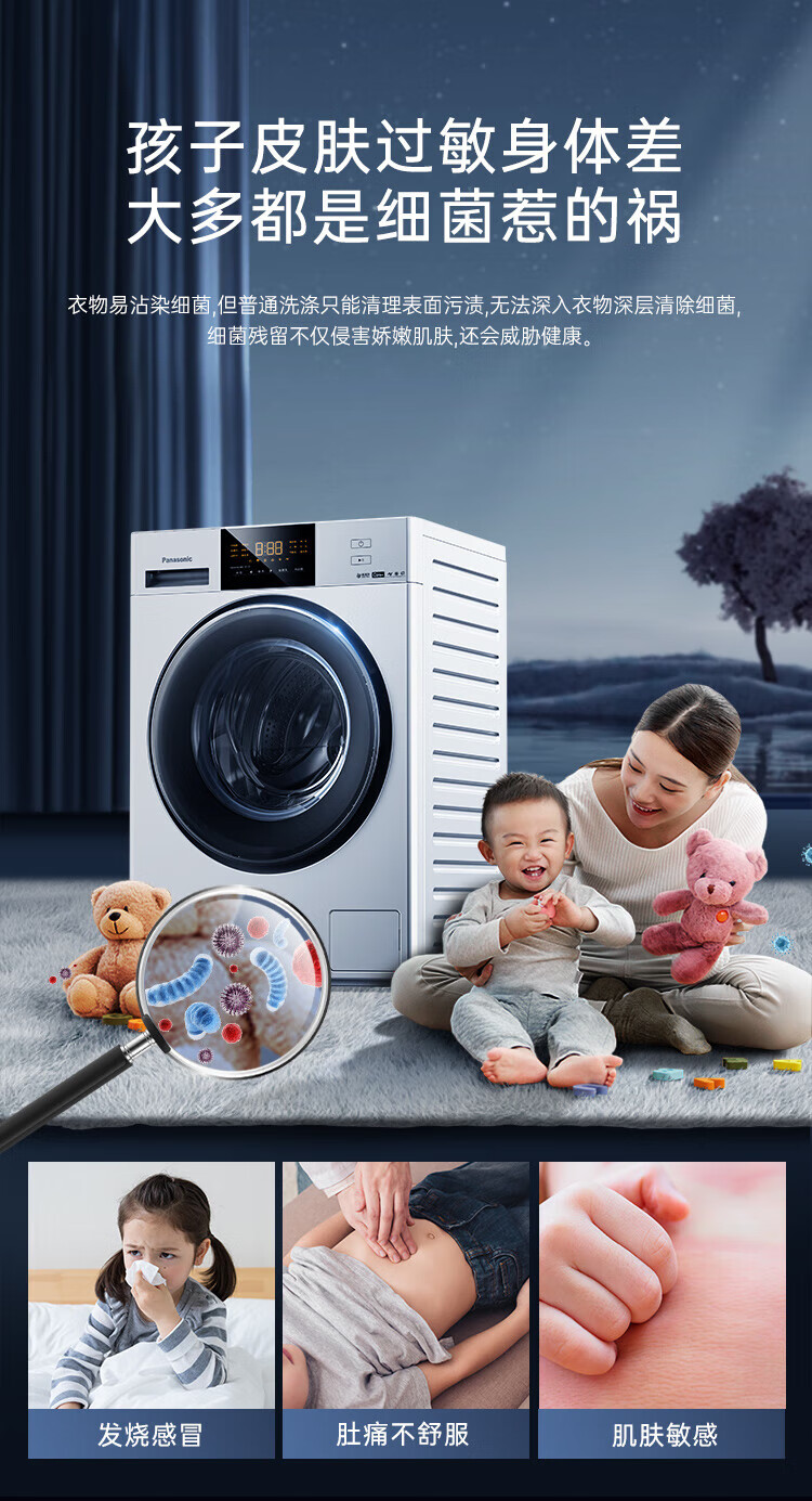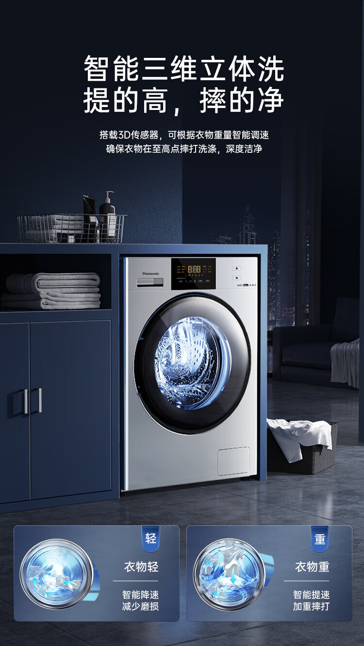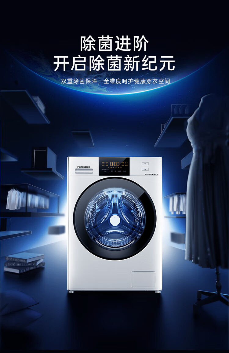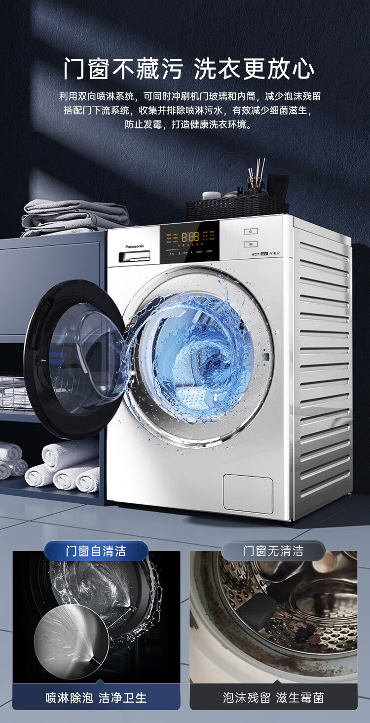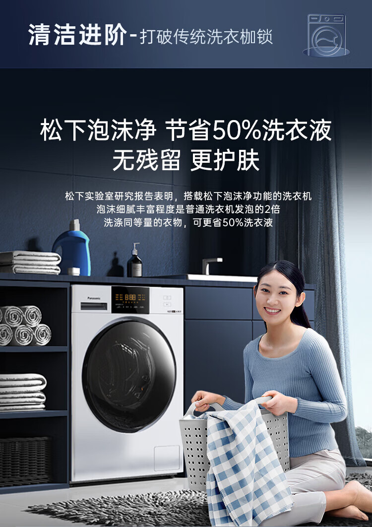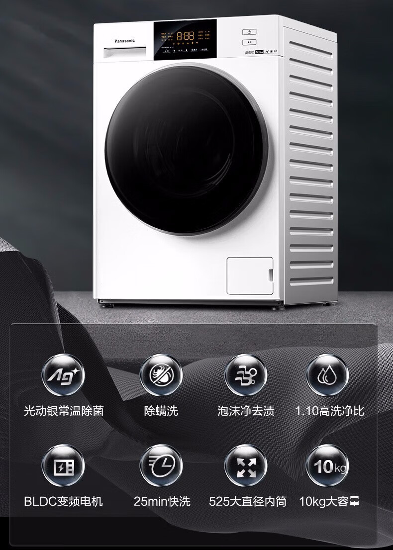 松下(Panasonic)滚筒洗衣机超薄10公斤全自动【白月光除菌升级版】泡沫净1.1洗净比光动银除菌除螨BLDC变频66L内筒 XQG100-NVAE【光动银除菌】