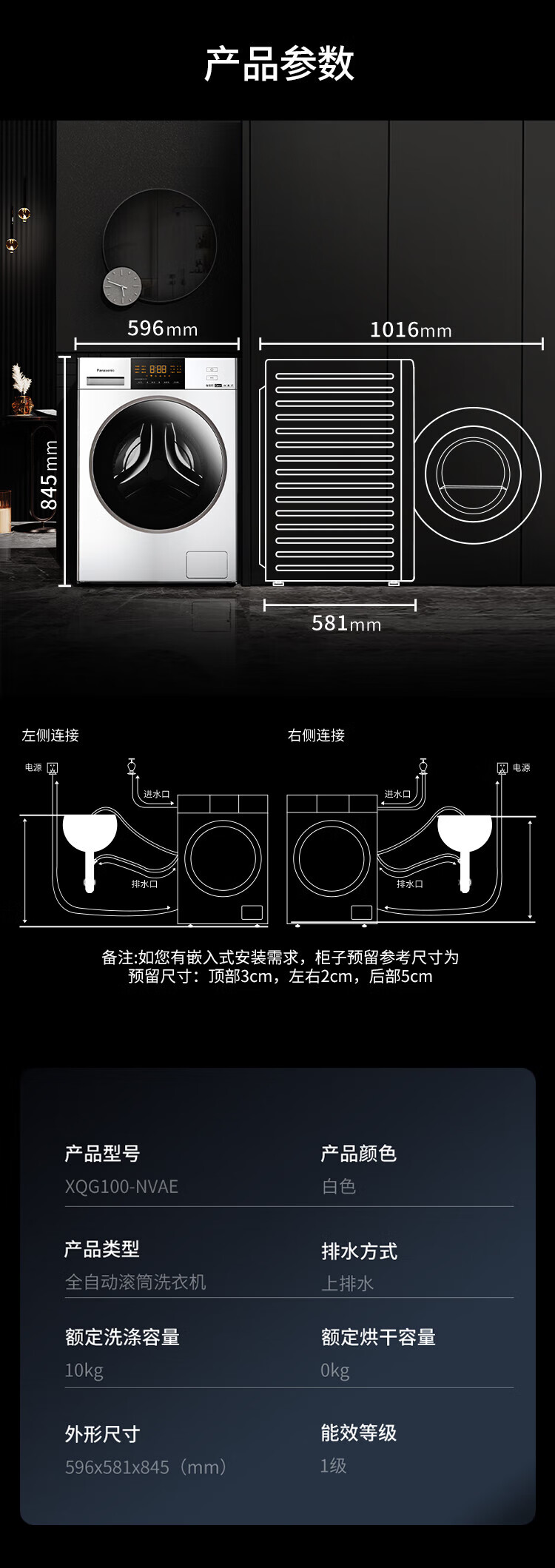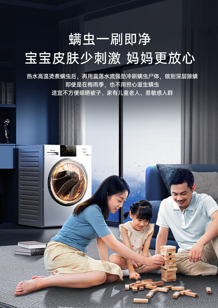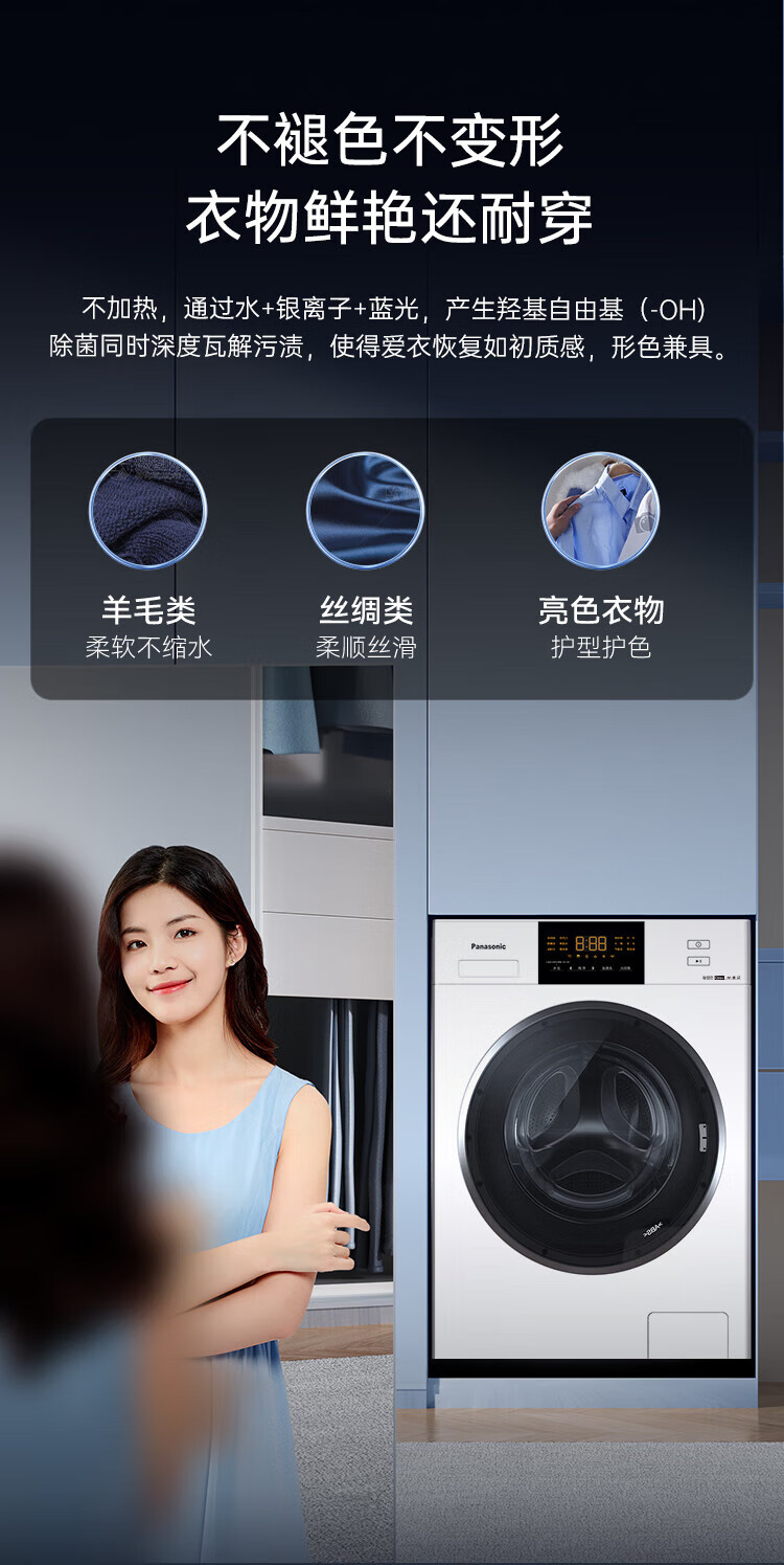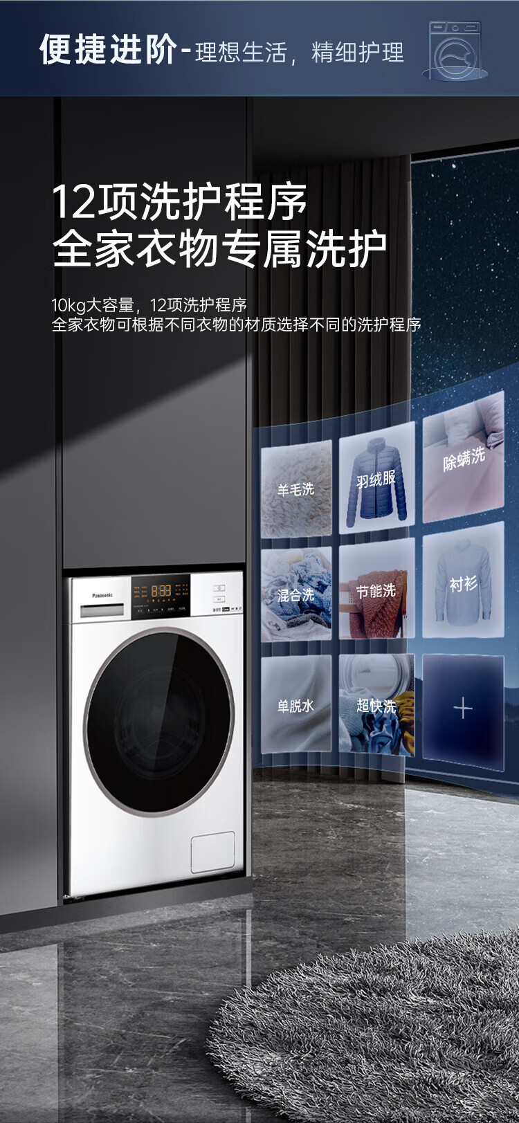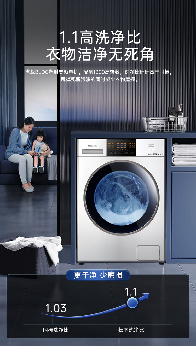 松下(Panasonic)滚筒洗衣机超薄10公斤全自动【白月光除菌升级版】泡沫净1.1洗净比光动银除菌除螨BLDC变频66L内筒 XQG100-NVAE【光动银除菌】