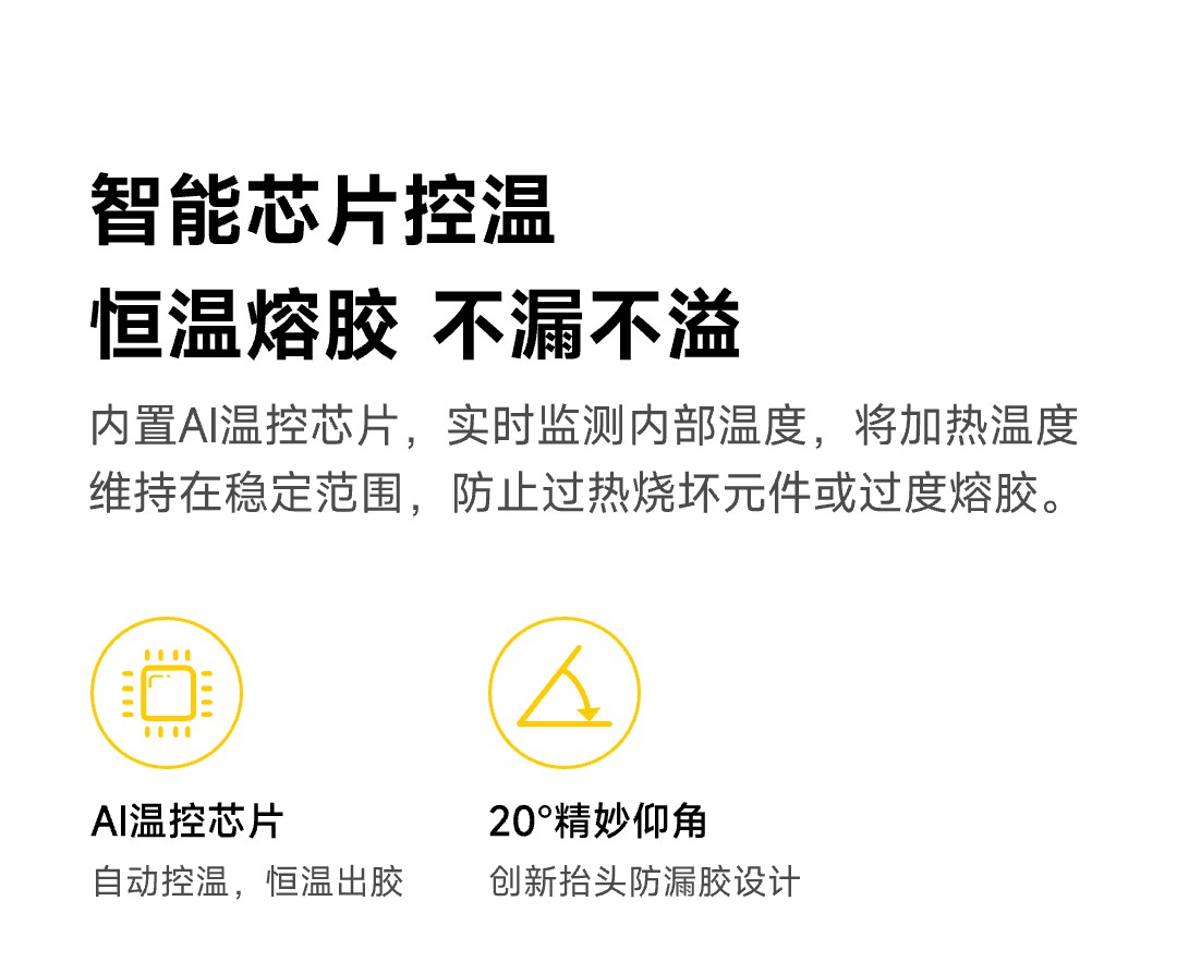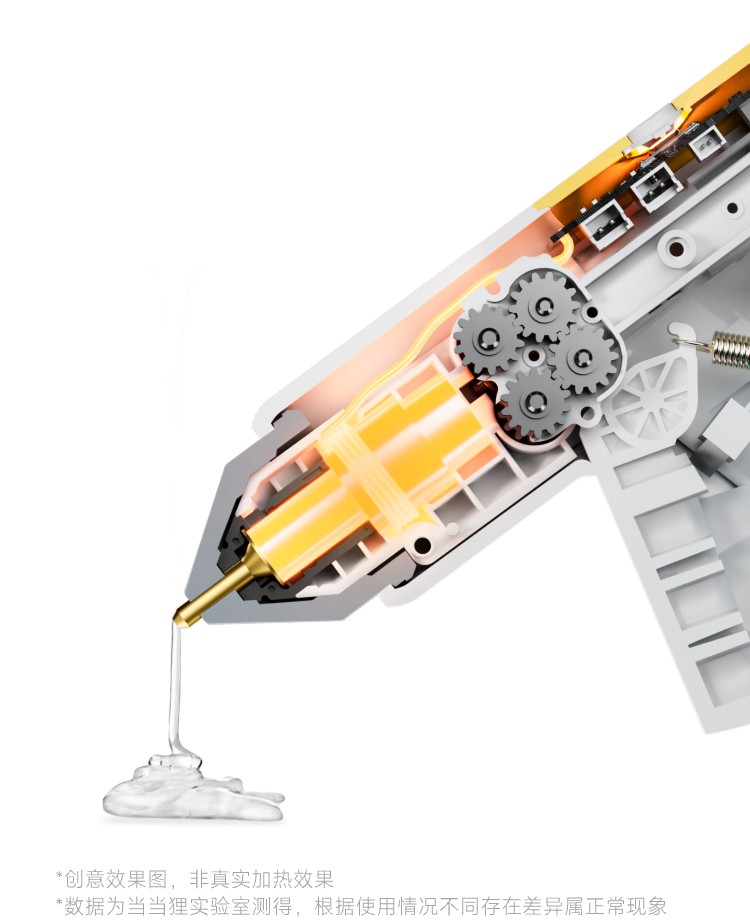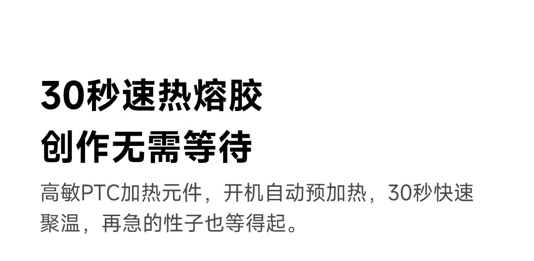 内置高品质PTC热敏元件,15秒加热即可出胶,出胶稳定不卡顿,胶体几分钟冷却固定,粘合力强。