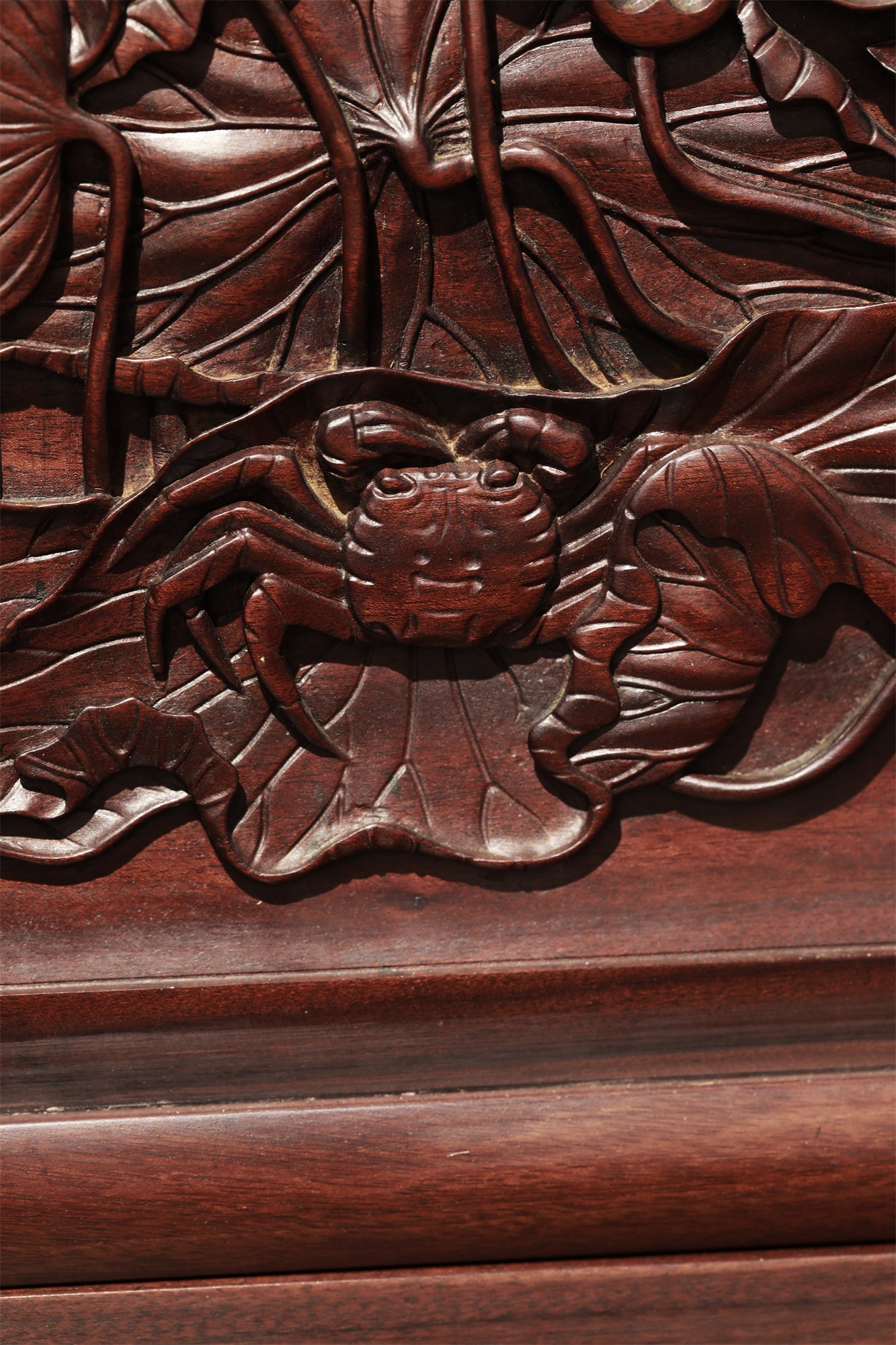 作品以荷花、螃蟹为创作主题。运用传统的徽派雕刻技艺将荷花与螃蟹自然组合。以荷喻“和”,以蟹谐音“谐”,寓意社会和谐。