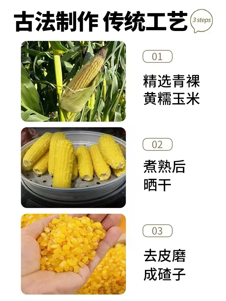 精选优质玉米🌽,在未完全成熟、植株仍为绿色的“青稞”阶段采摘,此时的玉米粒尚未定浆,口感尤为鲜嫩,蒸煮后自然晾干,将鲜玉米的营养、口感定格在此刻,作为原粮储存,现磨,将玉米脱粒,去除难以消化的种皮,余下的果肉,就是营养美味的青稞糯玉米碴