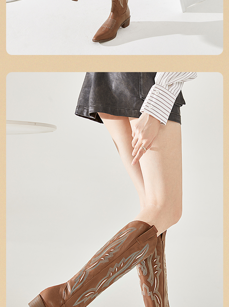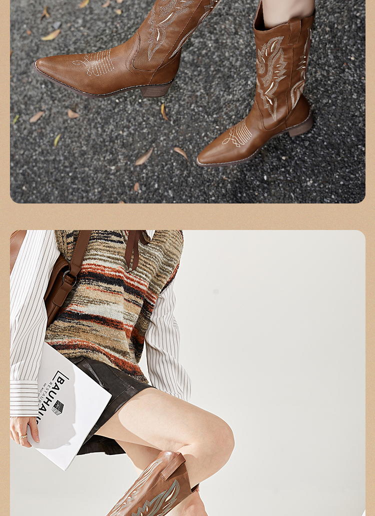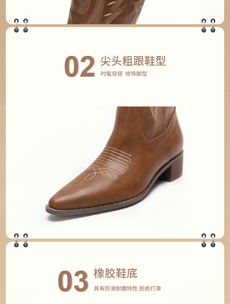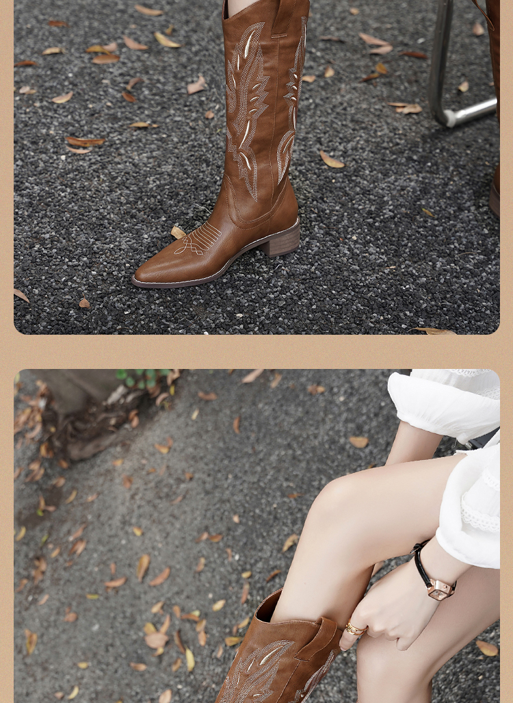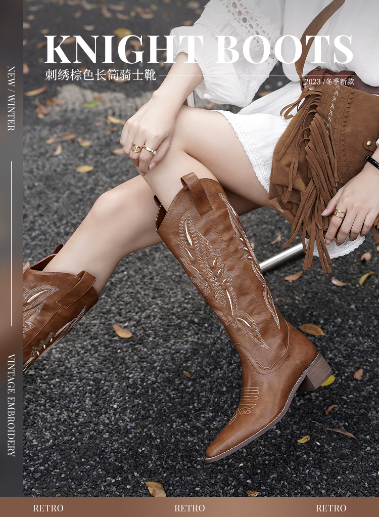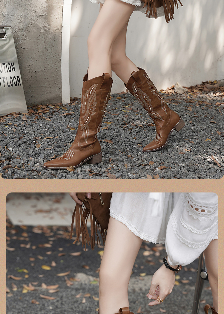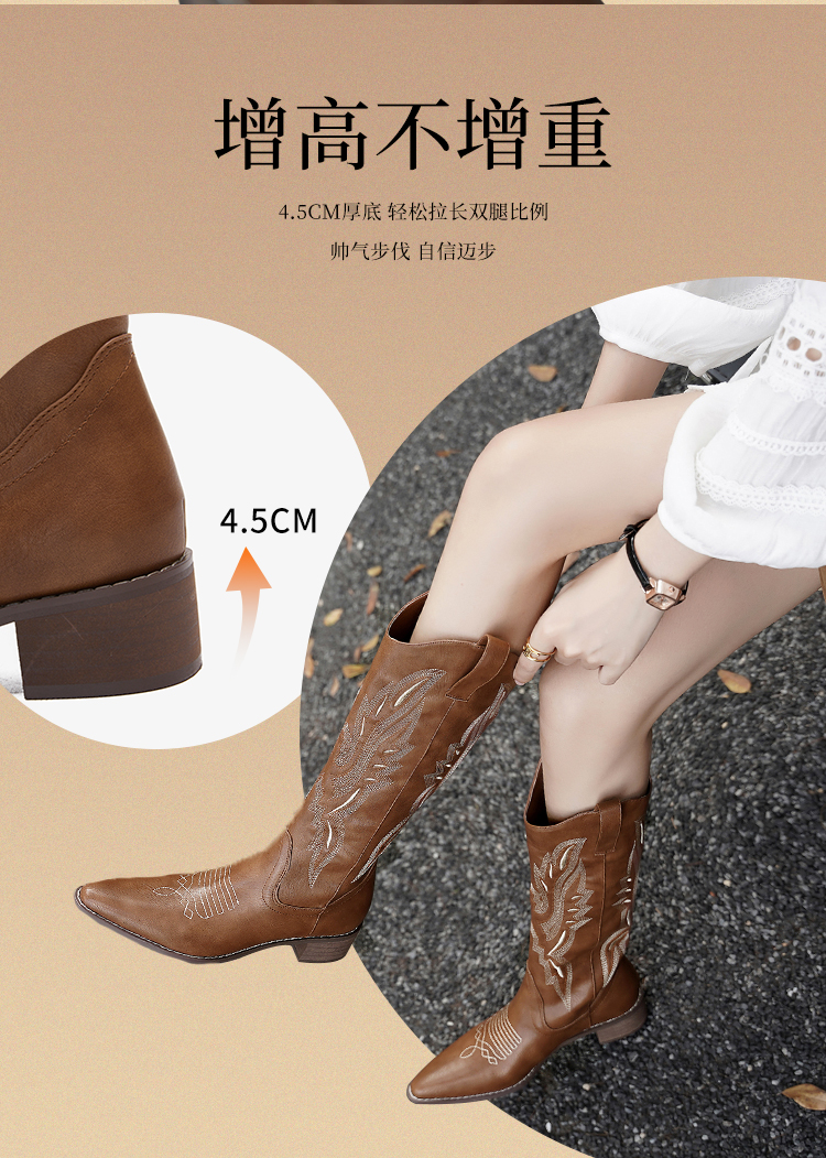西遇西部牛仔靴子女新款秋季马丁靴美式复古刺绣棕色长筒靴D0034051/D0034052