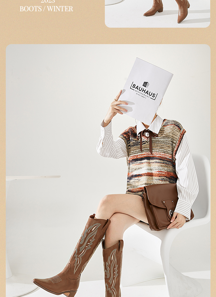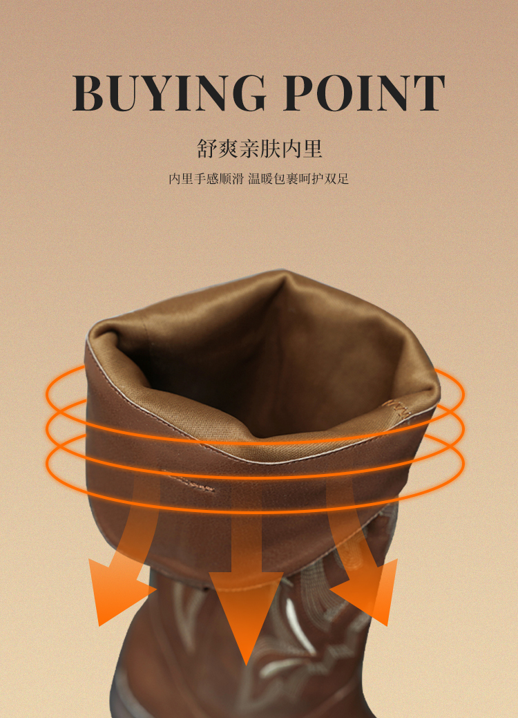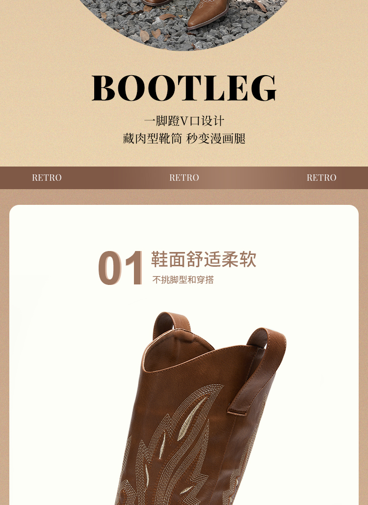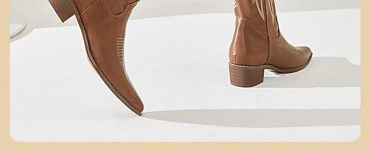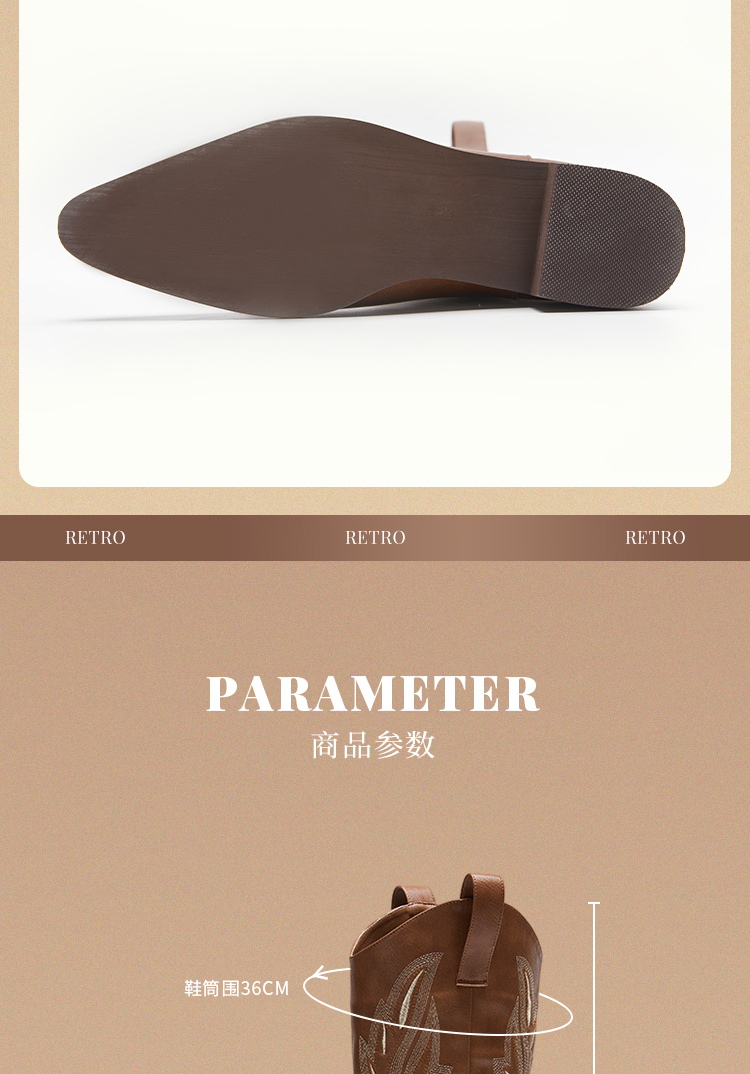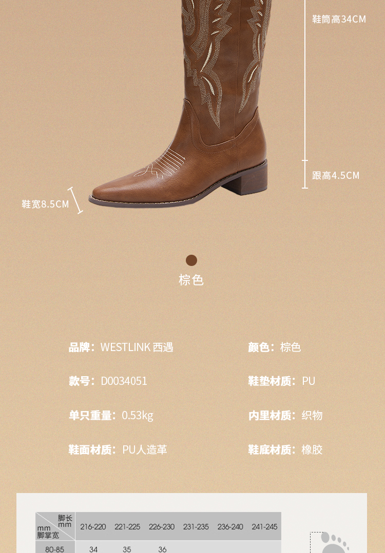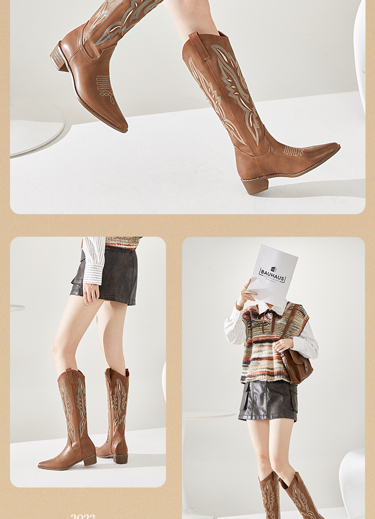 西遇西部牛仔靴子女新款秋季马丁靴美式复古刺绣棕色长筒靴D0034051/D0034052
