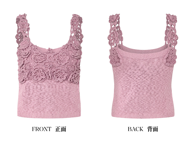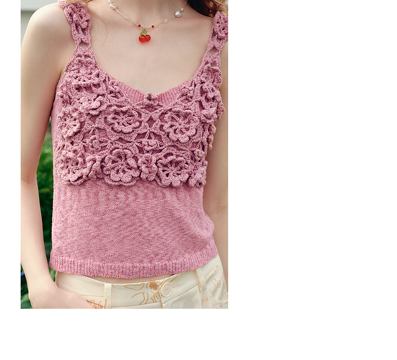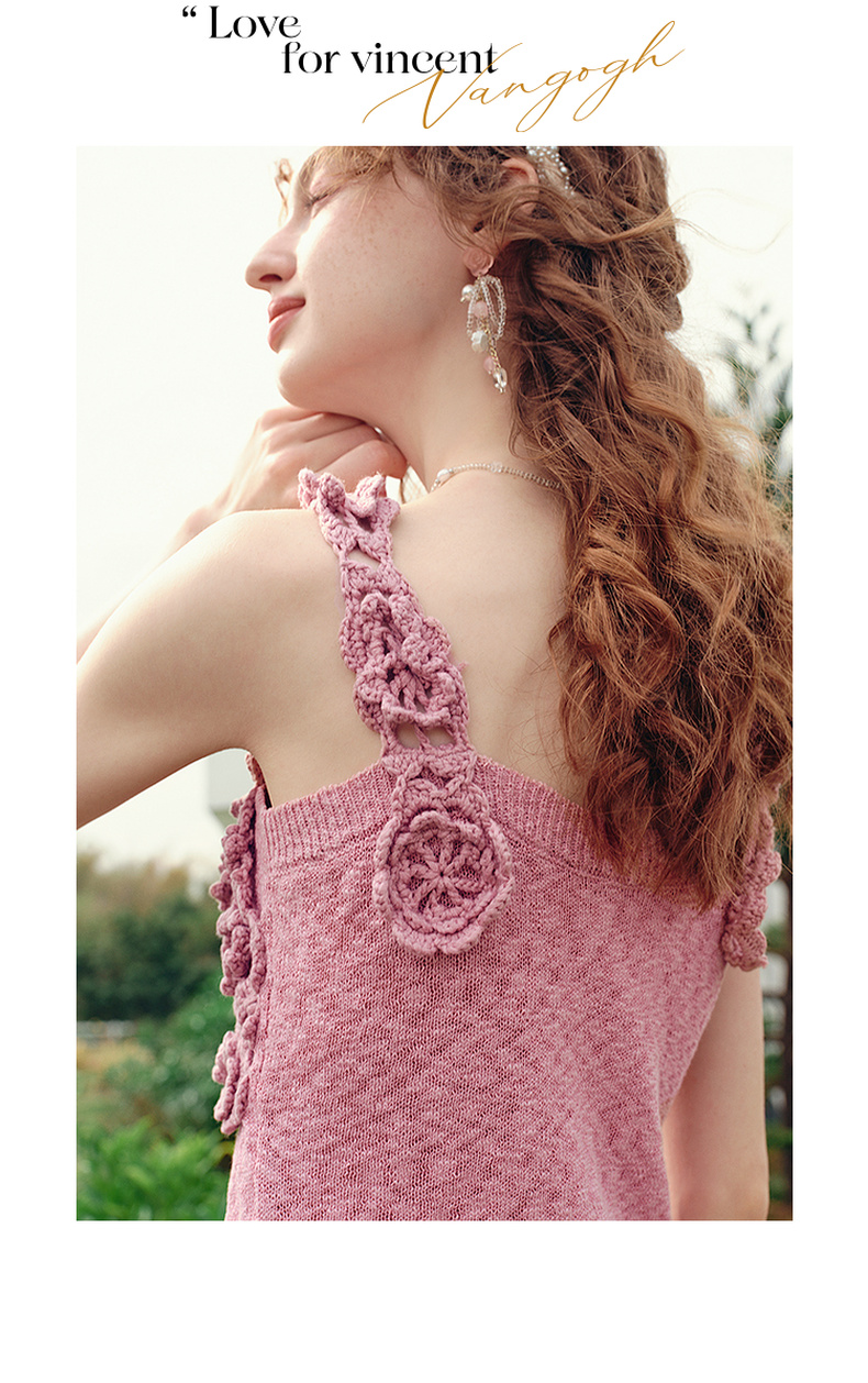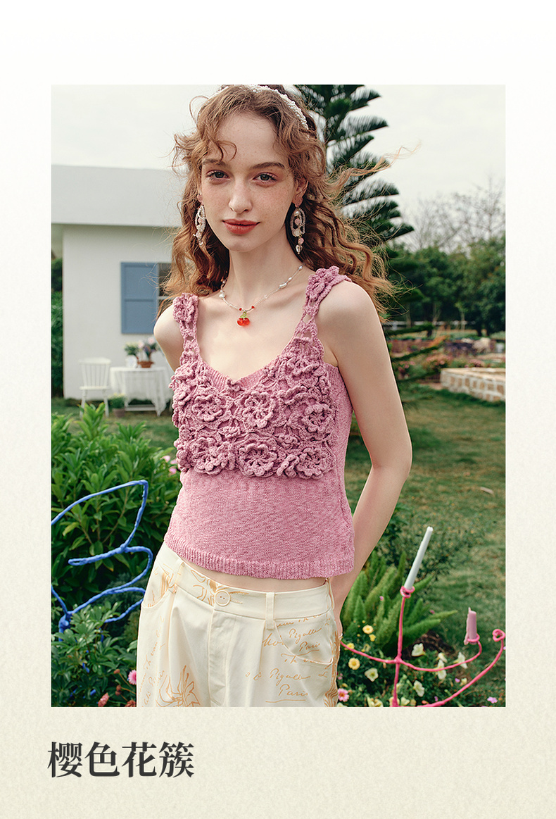两三事梵高文艺樱色花簇2025夏季新款甜美立体手钩花吊带针织衫女