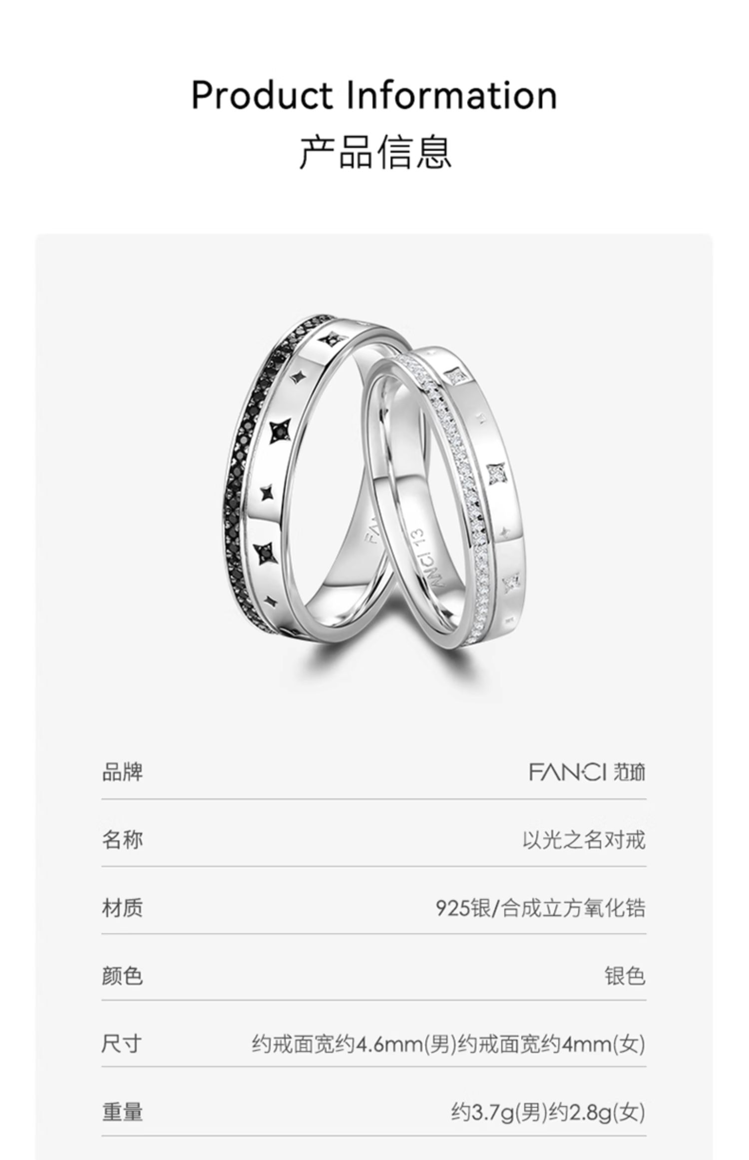 Fanci范琦银饰 以光之名对戒S925银简约时尚情侣对戒生日礼物